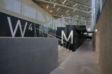 sovereignty instead of fashionable ephemerality: the black, monolithic glass solitaire asserts oneself for decades, regardless of future fashion trends. instead of the required foyer, all rooms are accessed via a sunken arena made up of tiered seats. the 150 meter long wall surface opposite is transformed into a huge cinema format by means of 24 video projectors. sound effects achieve the desired emotional charge.