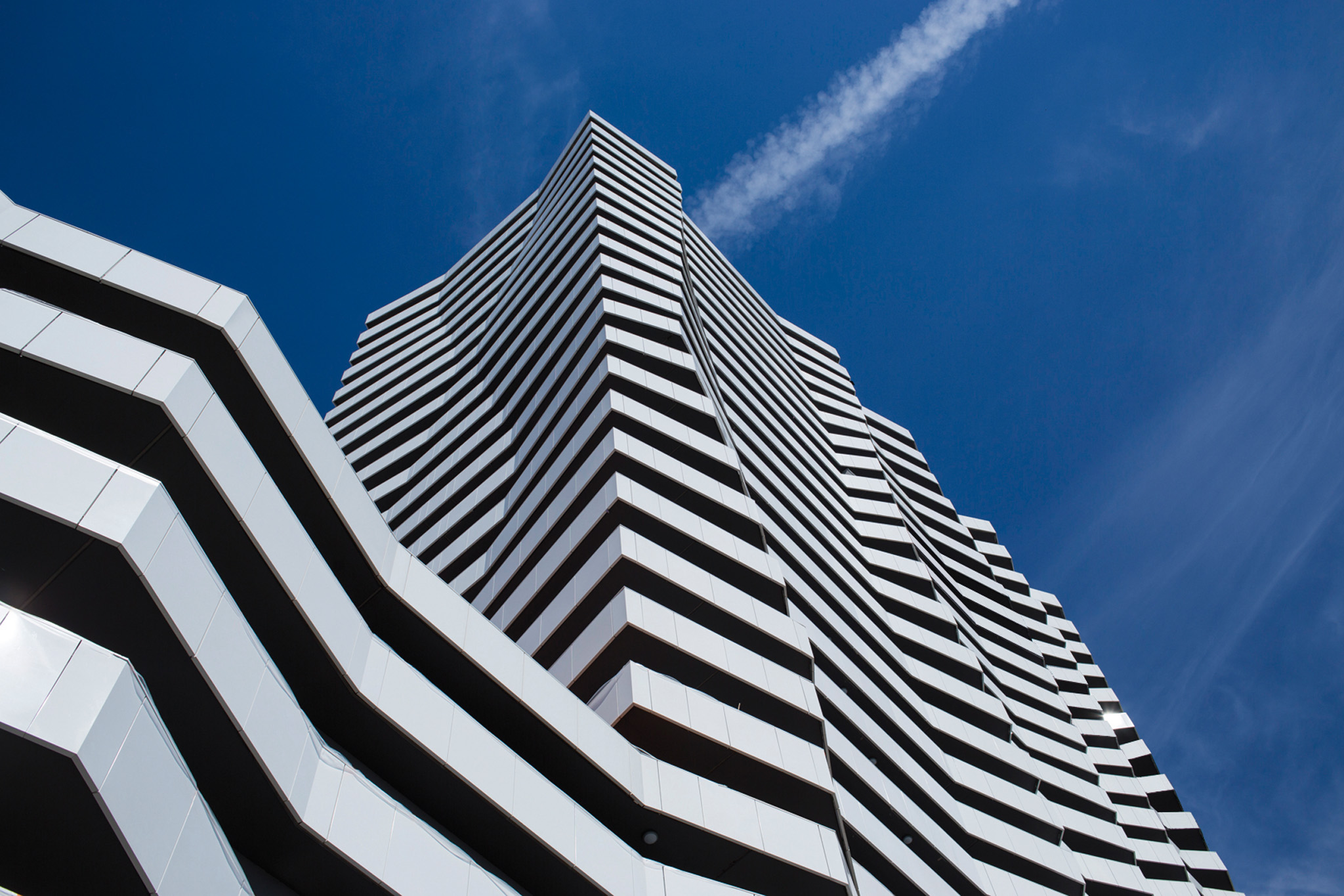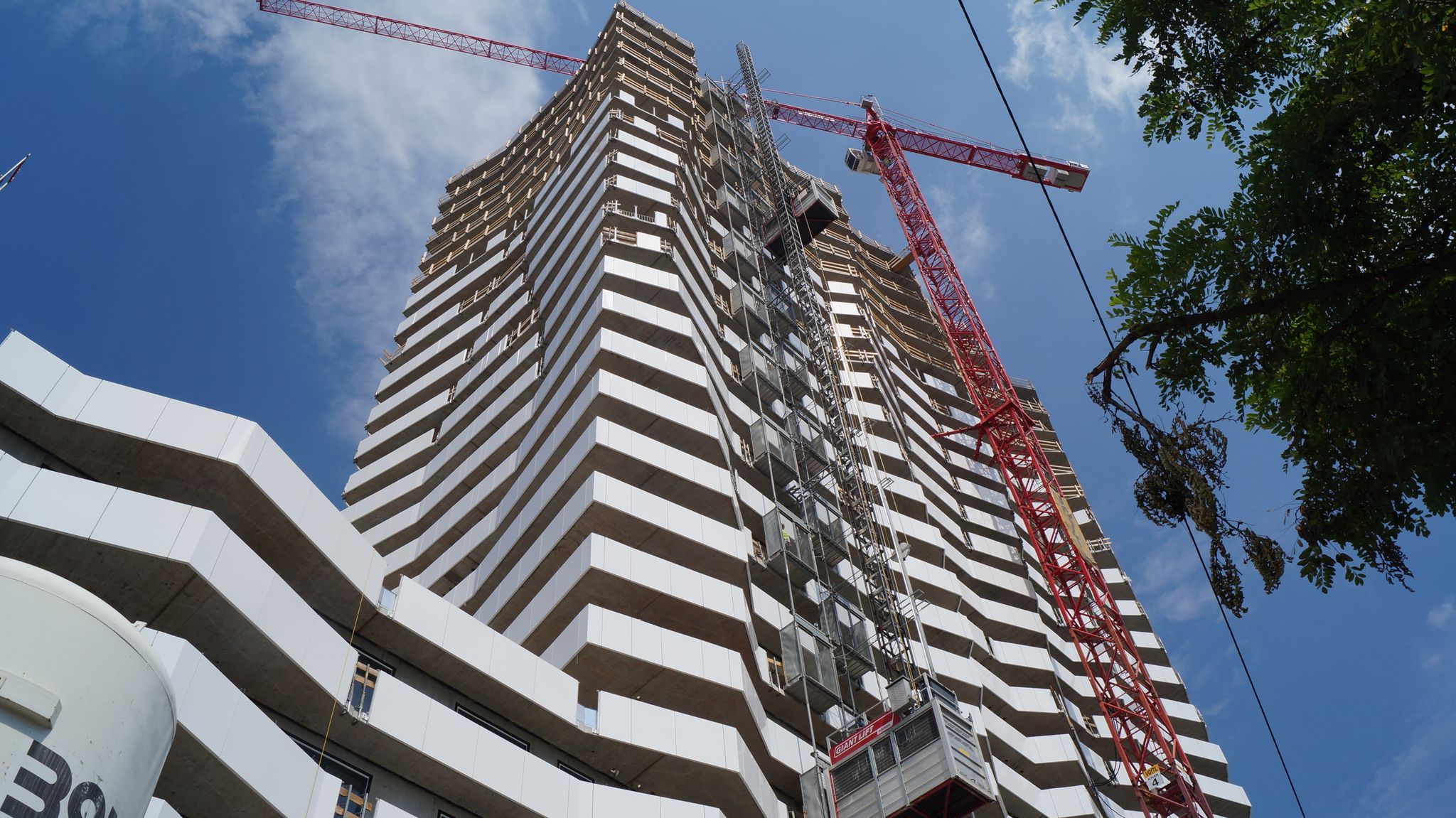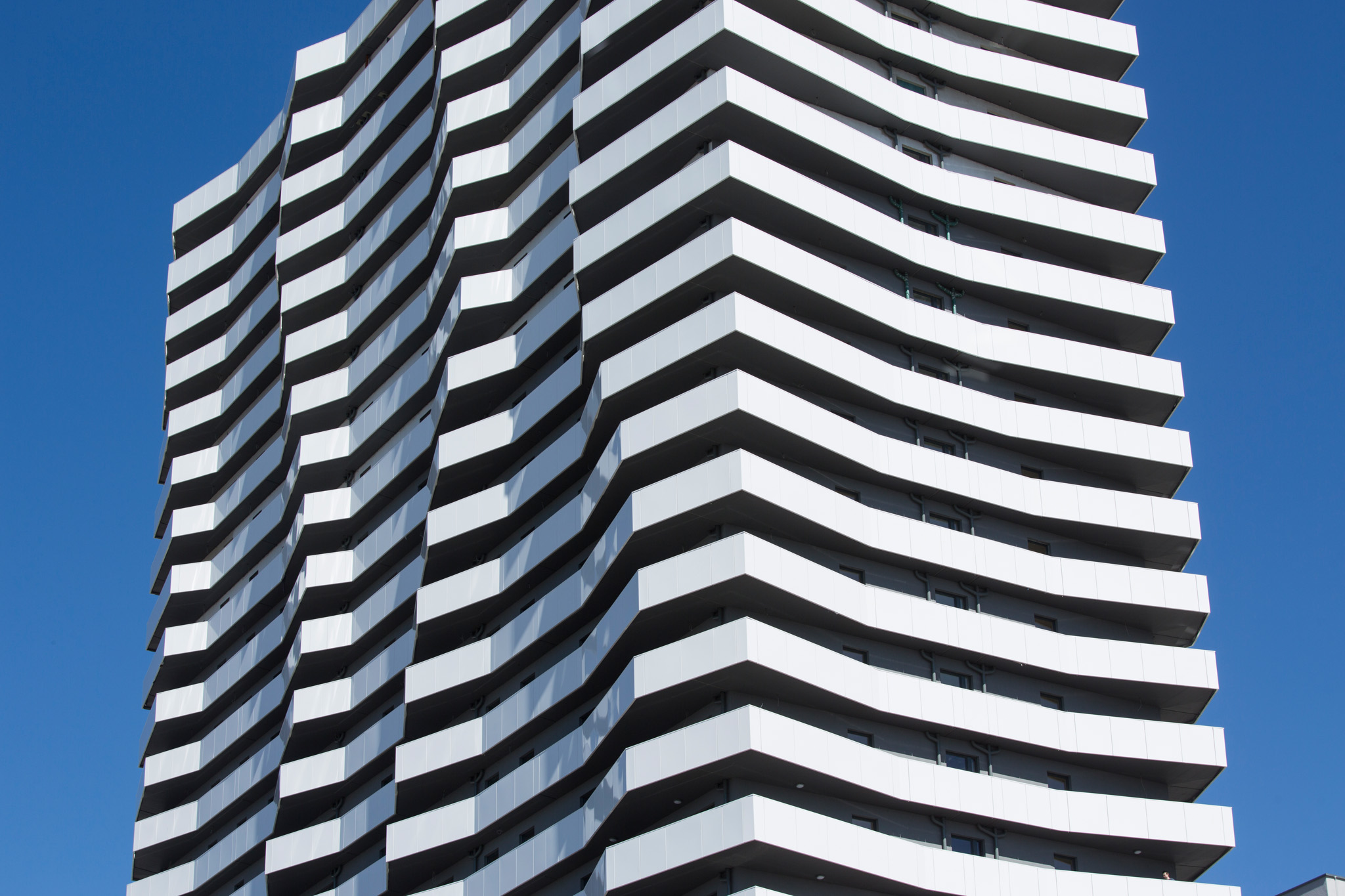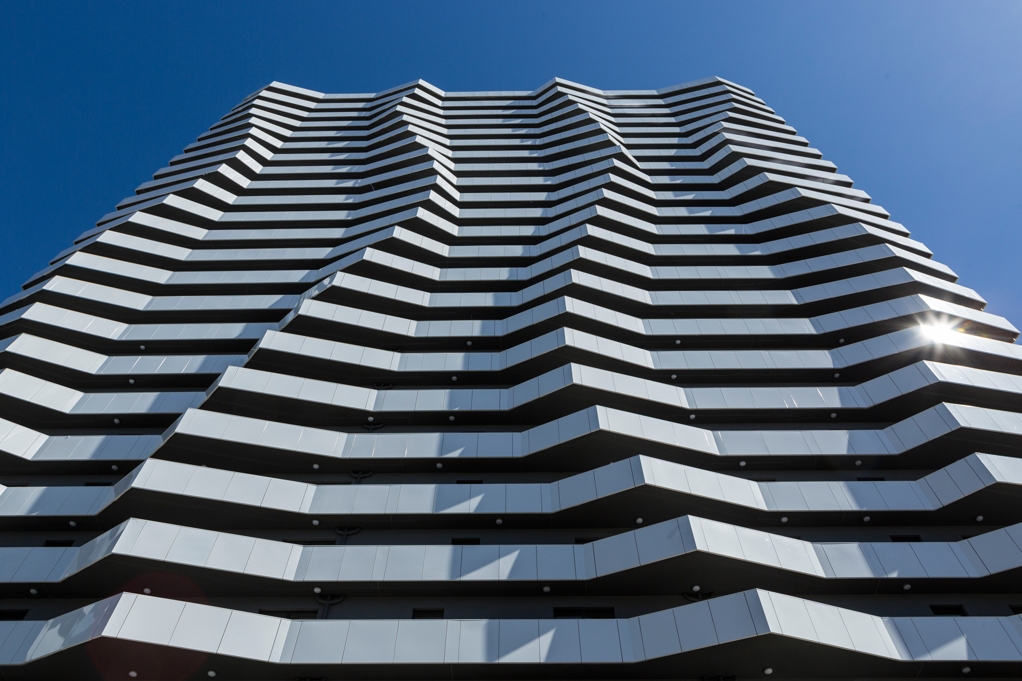 the 85m high residential tower in the form of a slender disc contains privately financed residential units, rental apartments, short-term apartments as well as a fitness area and a sauna. the external appearance is characterized by a loggia band that wraps around the building with triangular extensions. the parapet bands clad with smooth metal-industrial panels move with their cantilevers depending on the floor. the result is a plastic play of light and shadow on the facade.