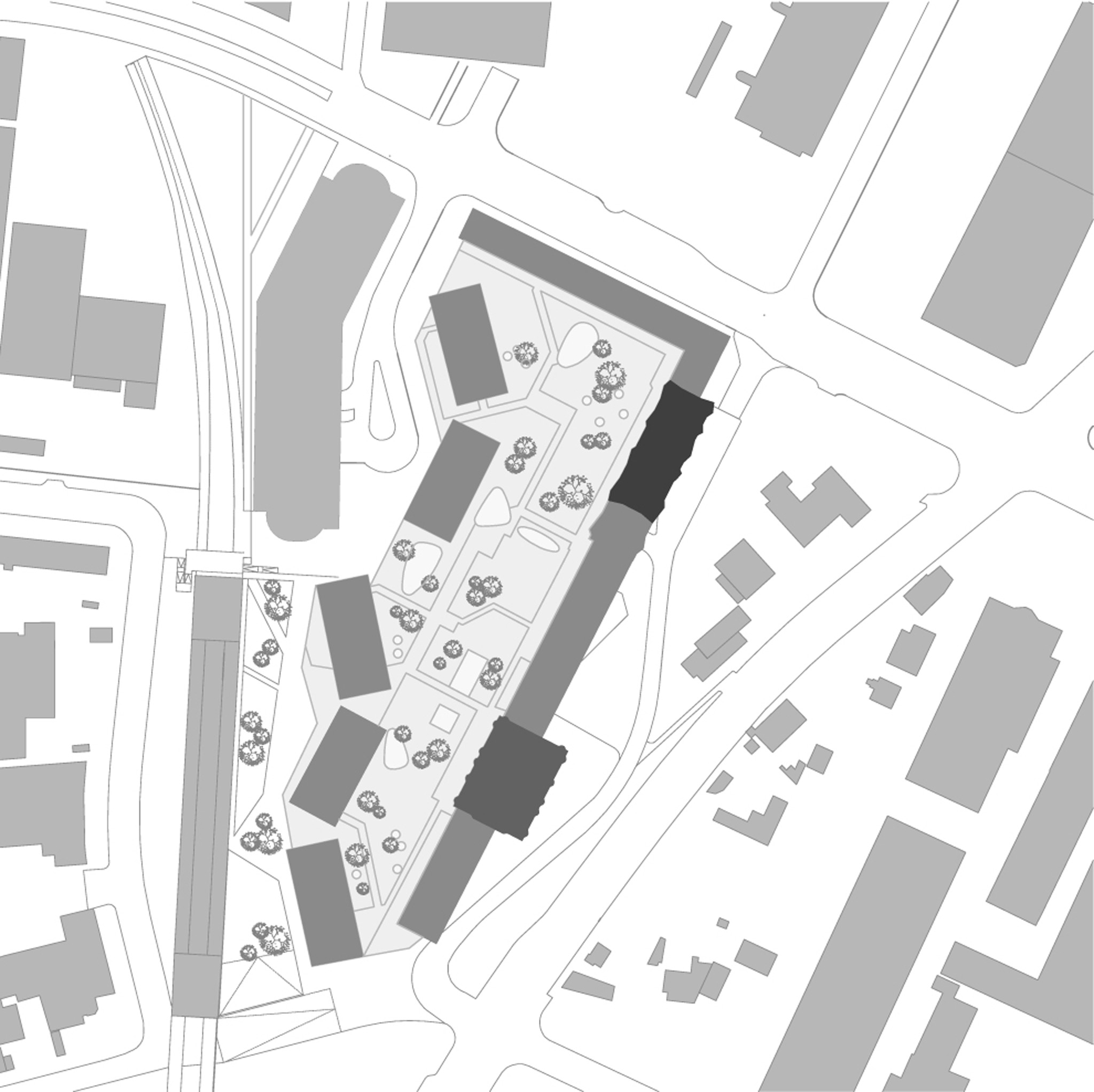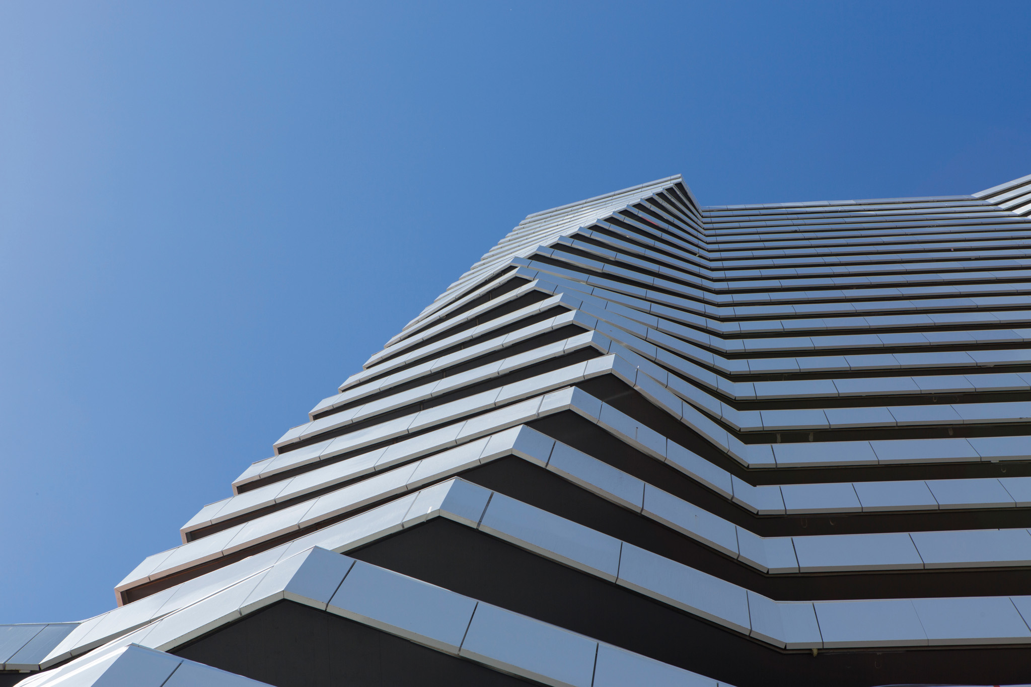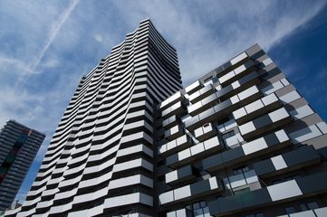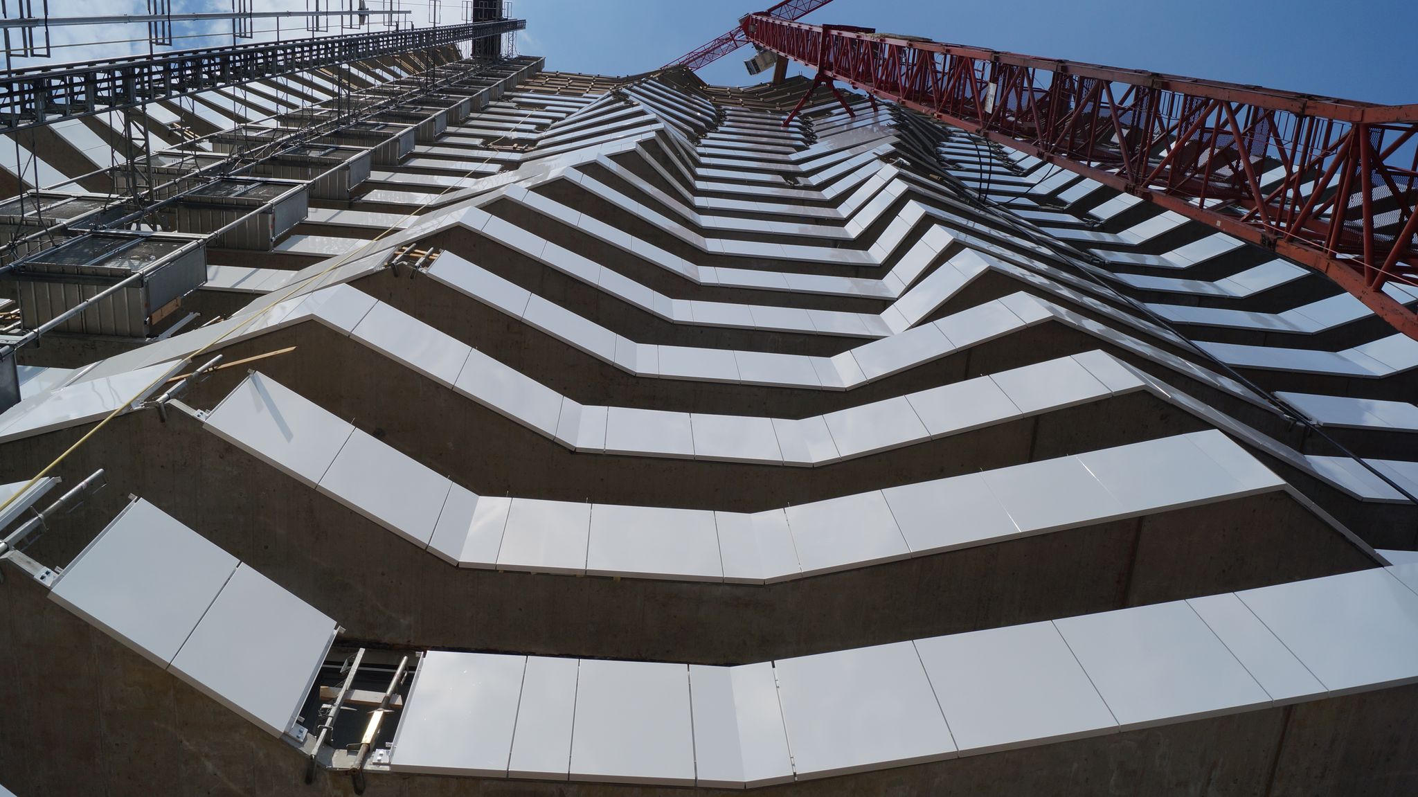 the 85m high residential tower in the form of a slender disc contains privately financed residential units, rental apartments, short-term apartments as well as a fitness area and a sauna. the external appearance is characterized by a loggia band that wraps around the building with triangular extensions. the parapet bands clad with smooth metal-industrial panels move with their cantilevers depending on the floor. the result is a plastic play of light and shadow on the facade.