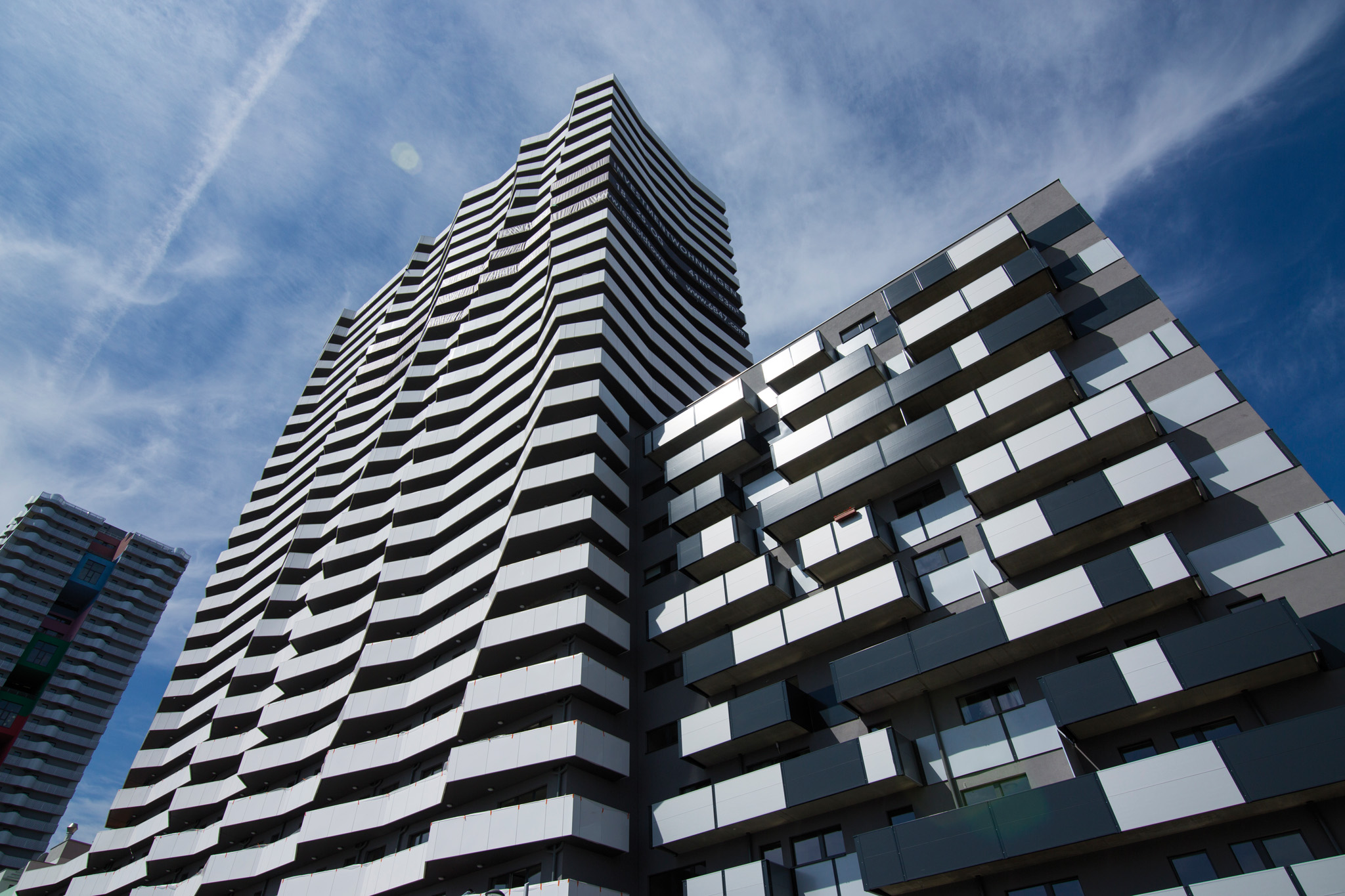 “the leopold tower is characterized by its sculptural effect, which arises from the displacement of the triangular, simple extensions of the balcony zone over the floors. the loggia zone lies like a pleated skirt over the prismatic structure.”