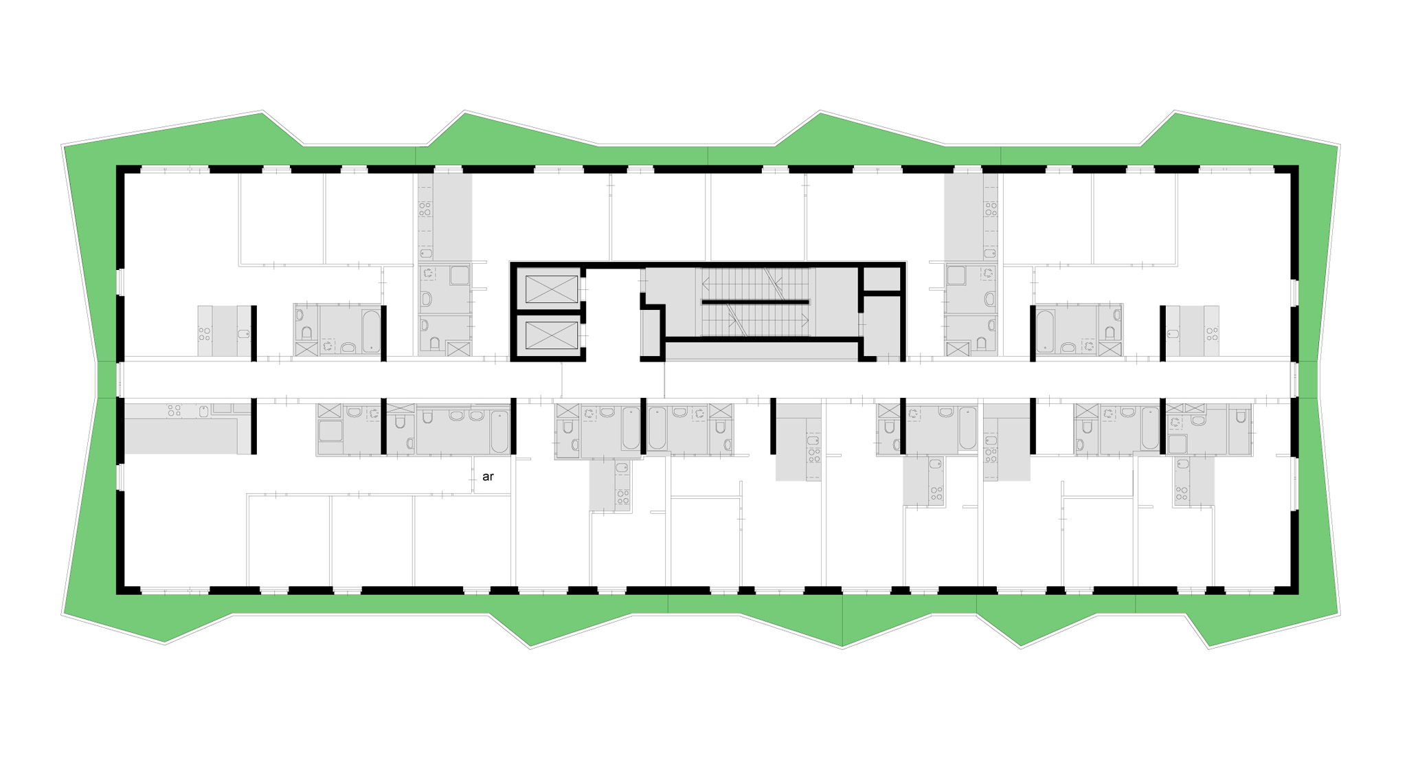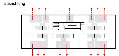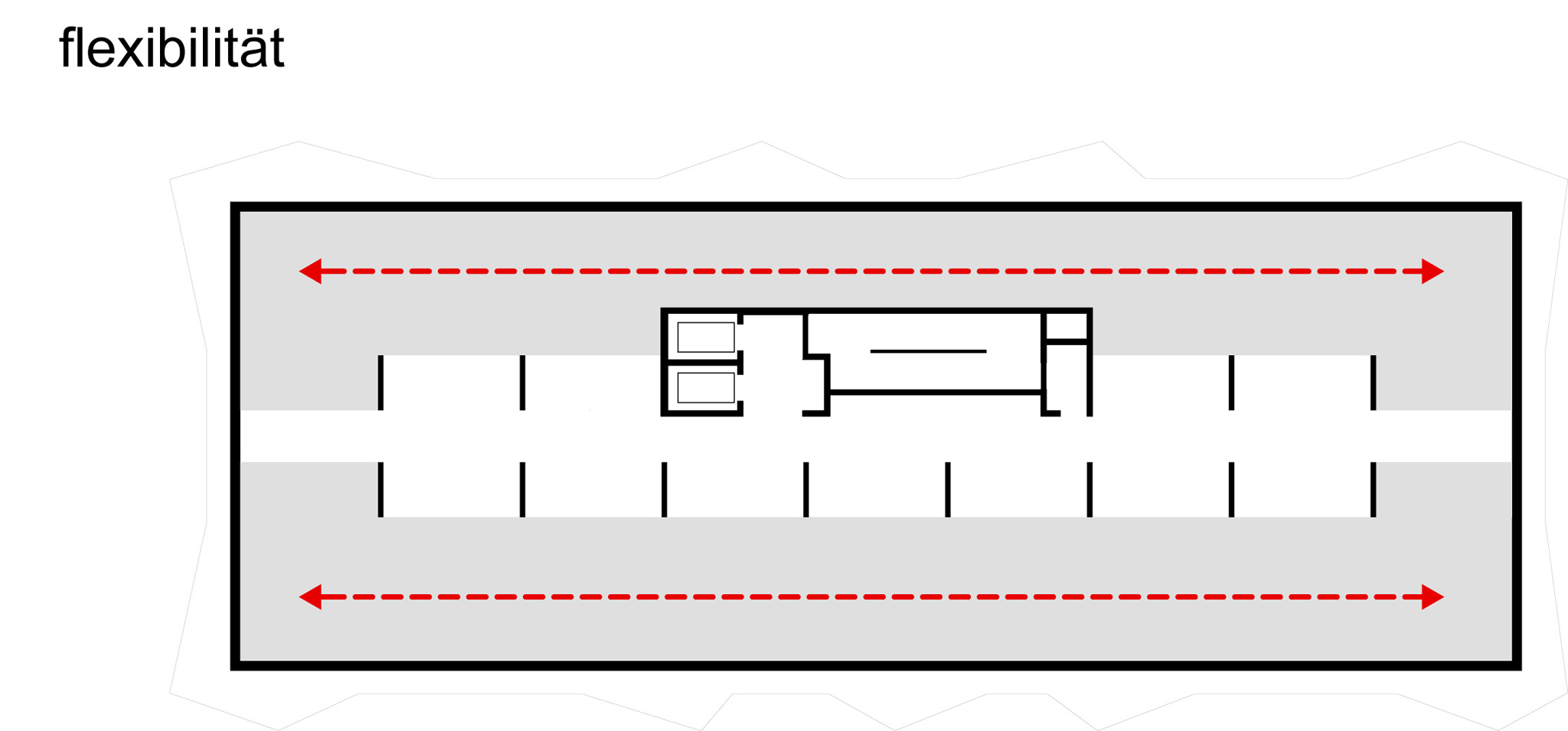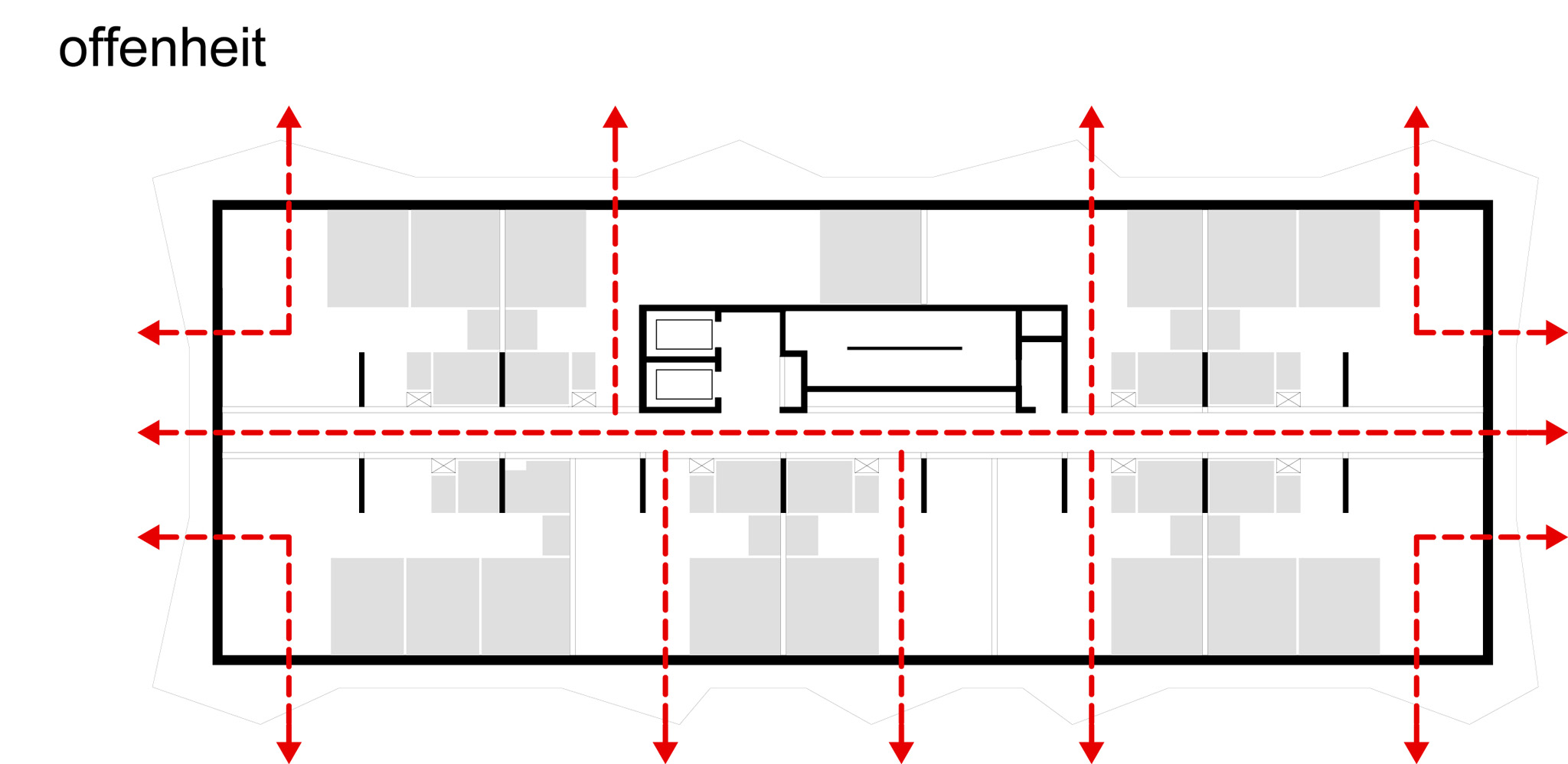 the reduced constructive system enables flexible, expandable, interconnectable apartment floor plans. the load-bearing elements are the outer wall, panes in the adjoining zone and the core. all space-defining walls are lightweight construction elements. the spatial zone without load-bearing elements allows a free floor plan design and is open to changes. In this way, it is also possible to open up a floor completely, for example for office use, which ensures the long-term sustainability of the building.