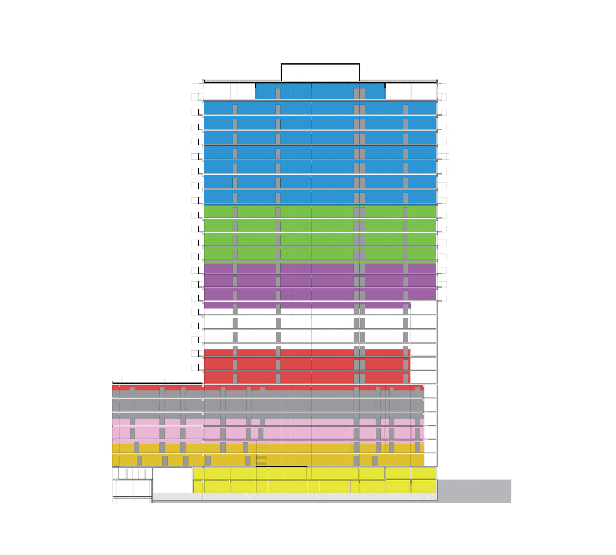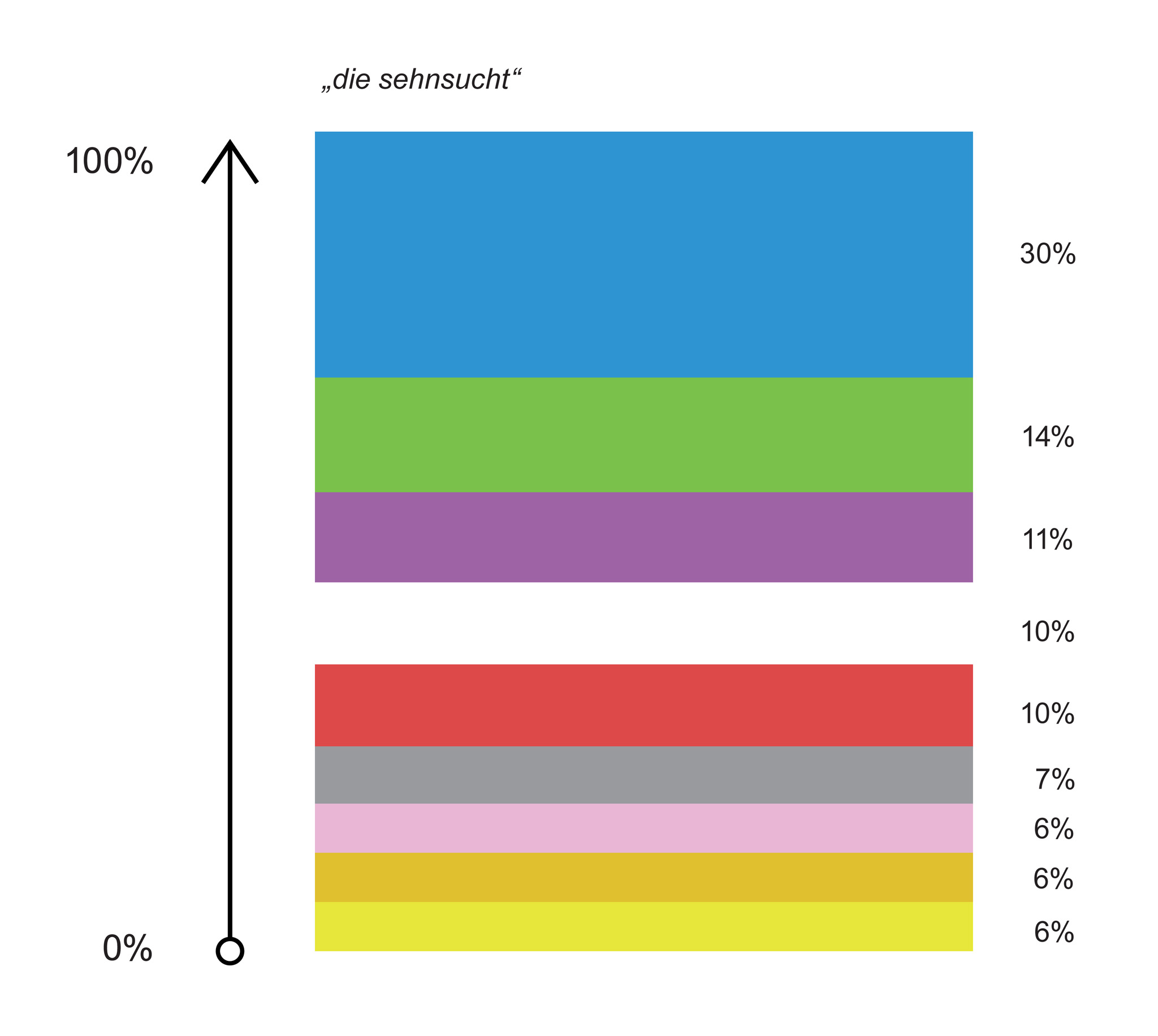 a three-storey foyer connects the street side with the inner garden deck. the full glazing of both ends of the central aisle allows access to the outside and a distant view in the direction of the weinviertel. the color concept, which was developed by the austrian artist heimo zobernig, creates orientation in the interior development areas. his color concept is based on the color diagrams from the book 'how colors work' by eva heller. in a large survey, 1888 women and men were asked about terms from a wide range of emotional and emotional areas. the term chosen for this building shows the percentage distribution from the longing diagram.