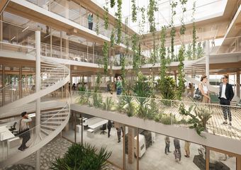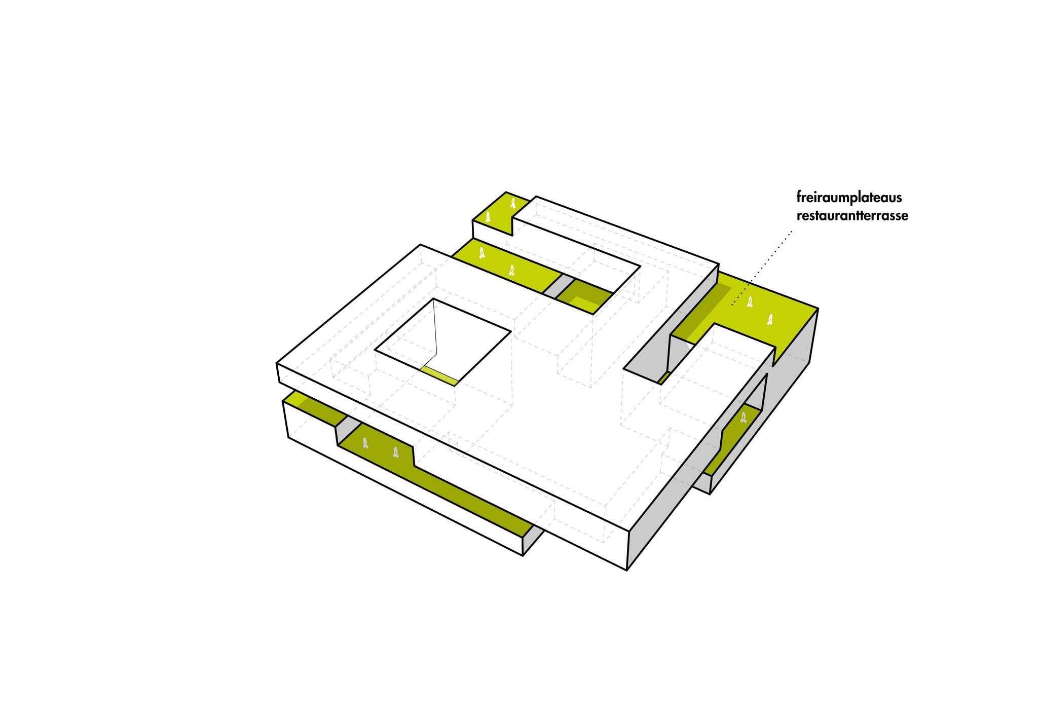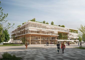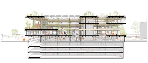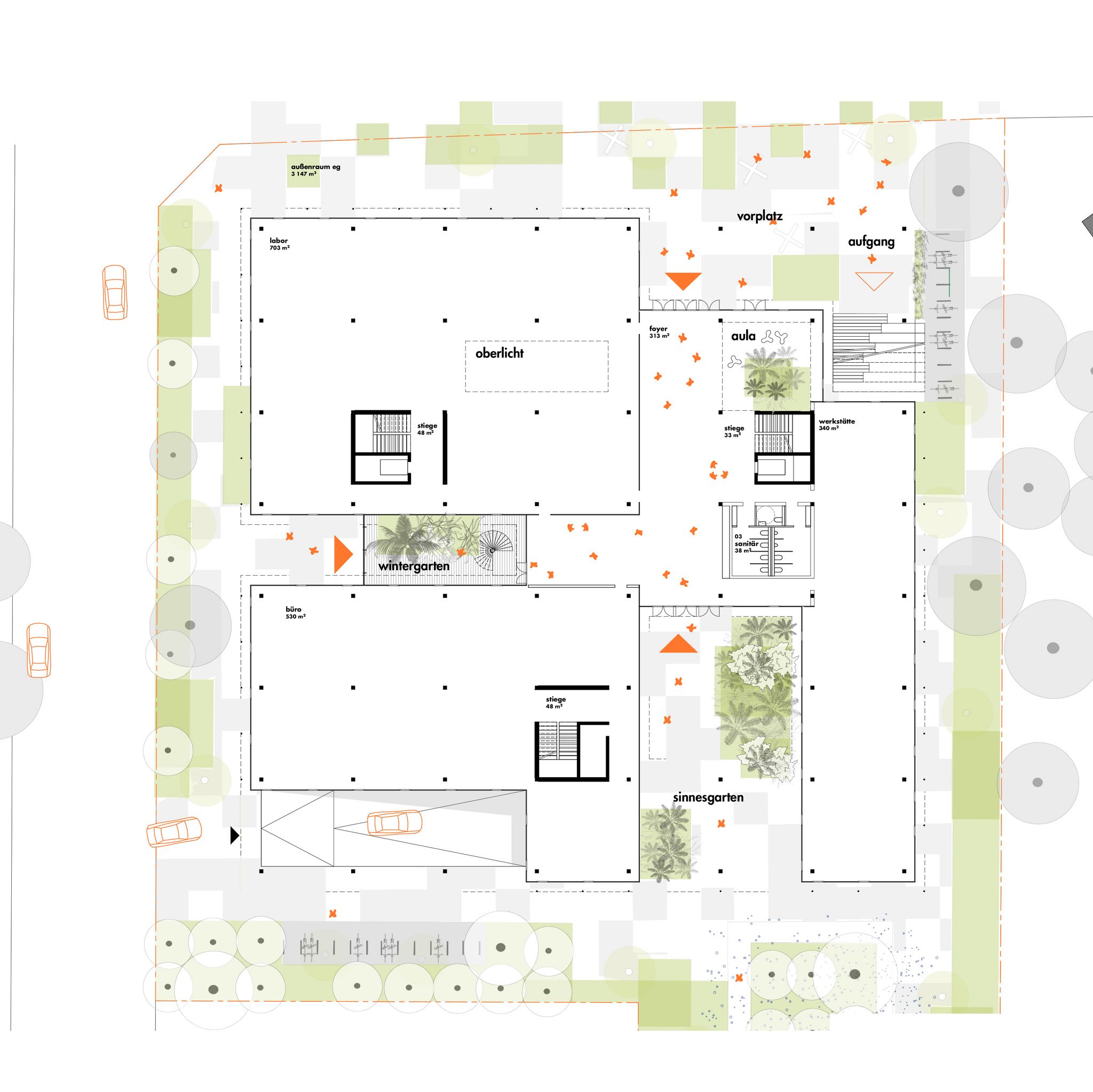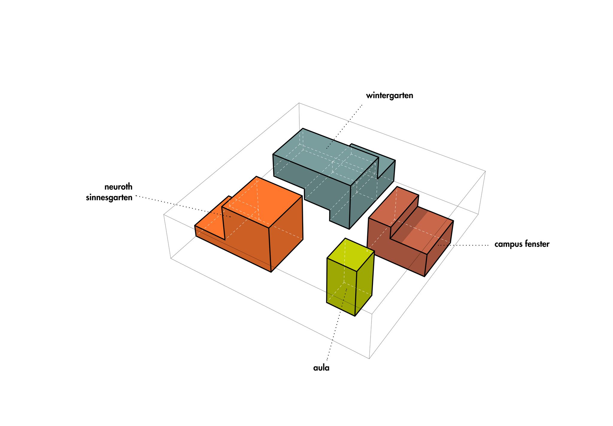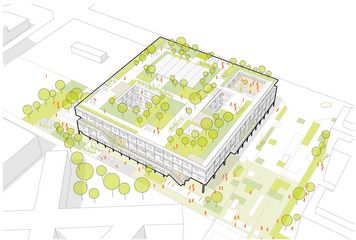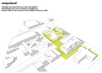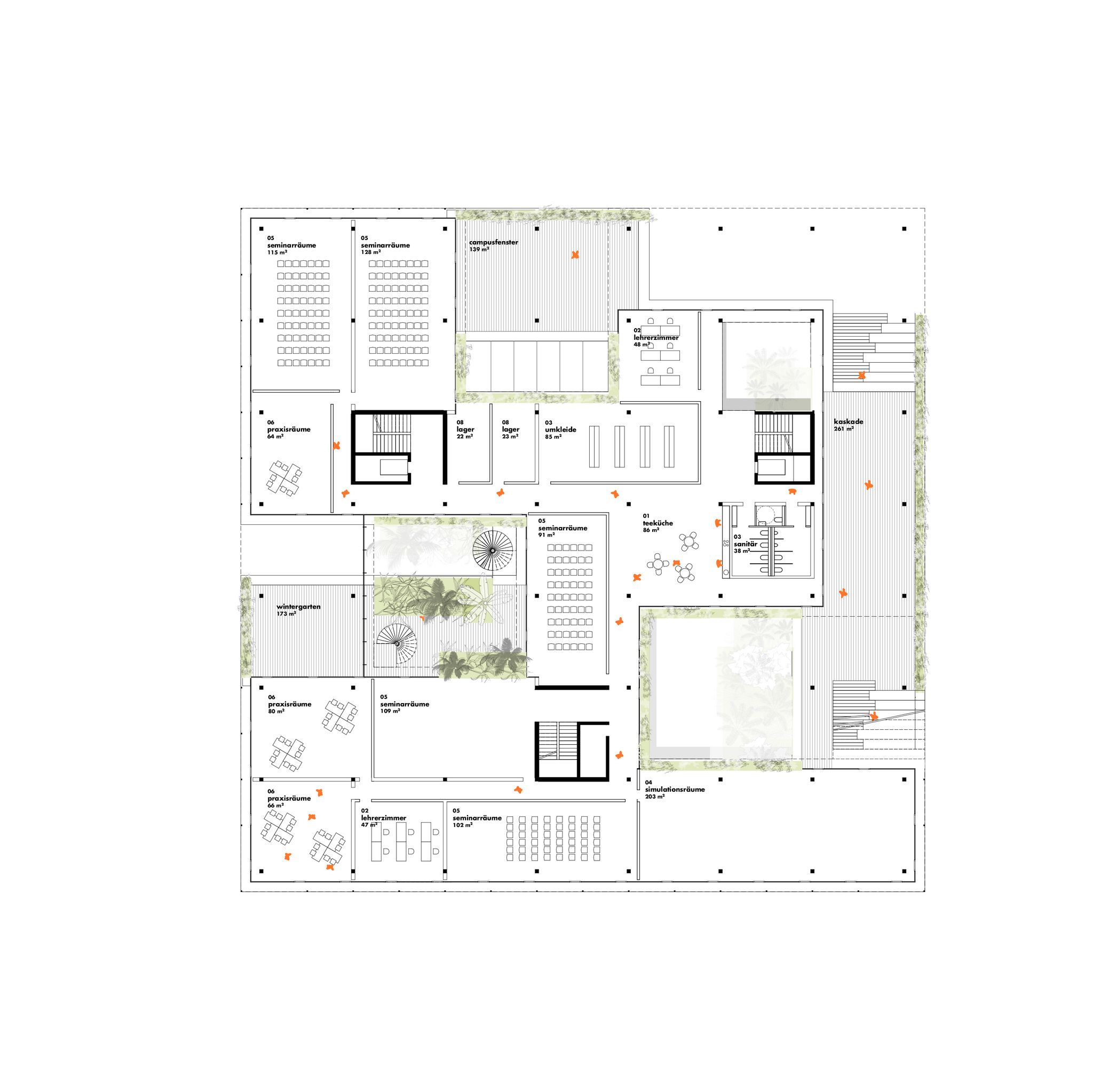 the building also includes four thematic courtyards, each with a unique character and all connected to the outside area by the surrounding cascade. these courtyards encourage sensory perception in order to create a pleasant and appealing learning climate. climbing plants form a green curtain along the cascade, making the building's different micro-climatic conditions perceivable and tangible. the existing façades also feature trellises as a curtain structure, which wrap them in a green dress that creates new, exciting spaces in between. the entire campus will be covered with green roofs and squares, and the roofs may also have photovoltaic panels to generate renewable energy.