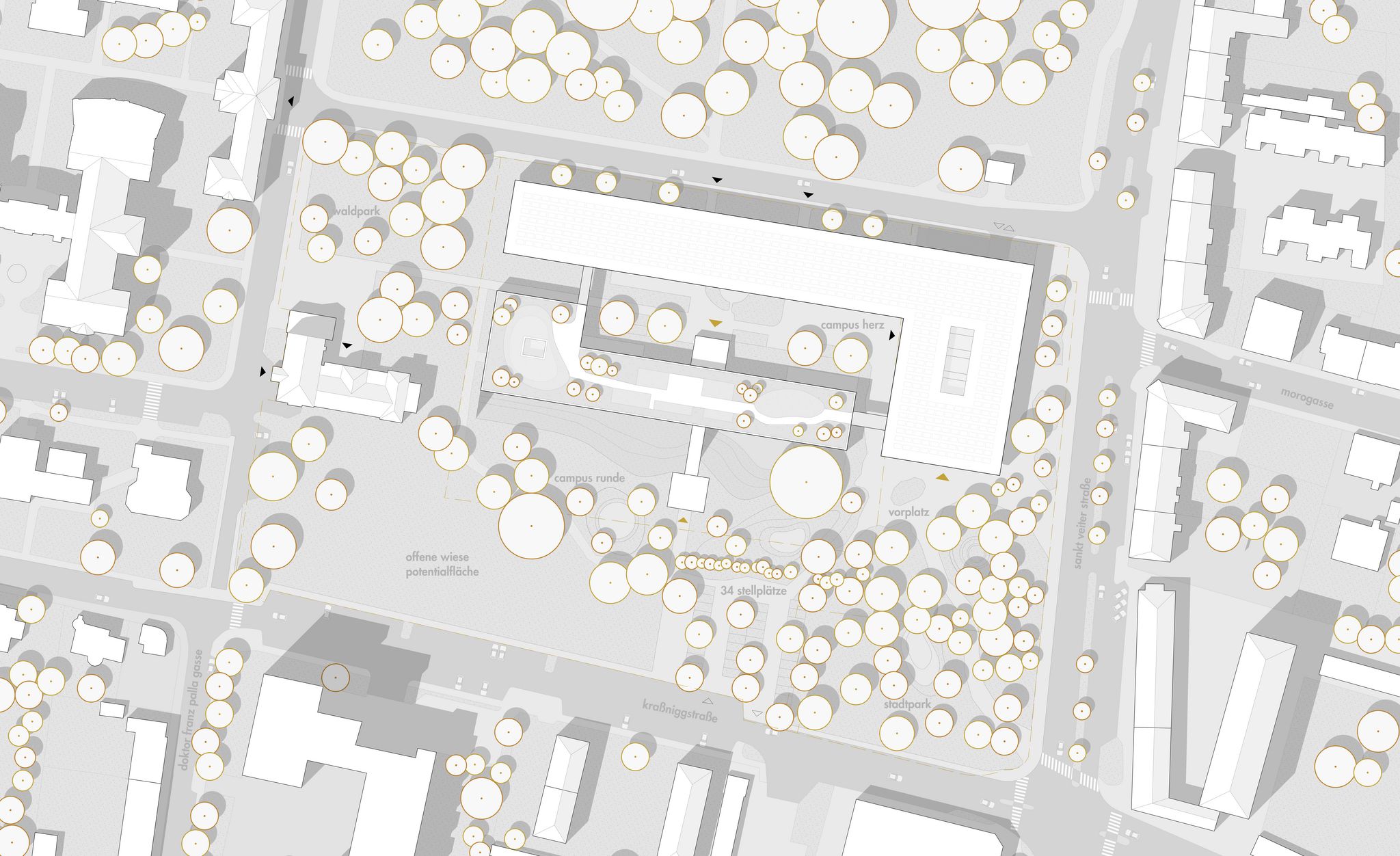 the new campus with its different open spaces offers a variety of possibilities for living and learning together. the dense network of paths and tree groups structures and offers differentiated sensory spaces for students of all ages.