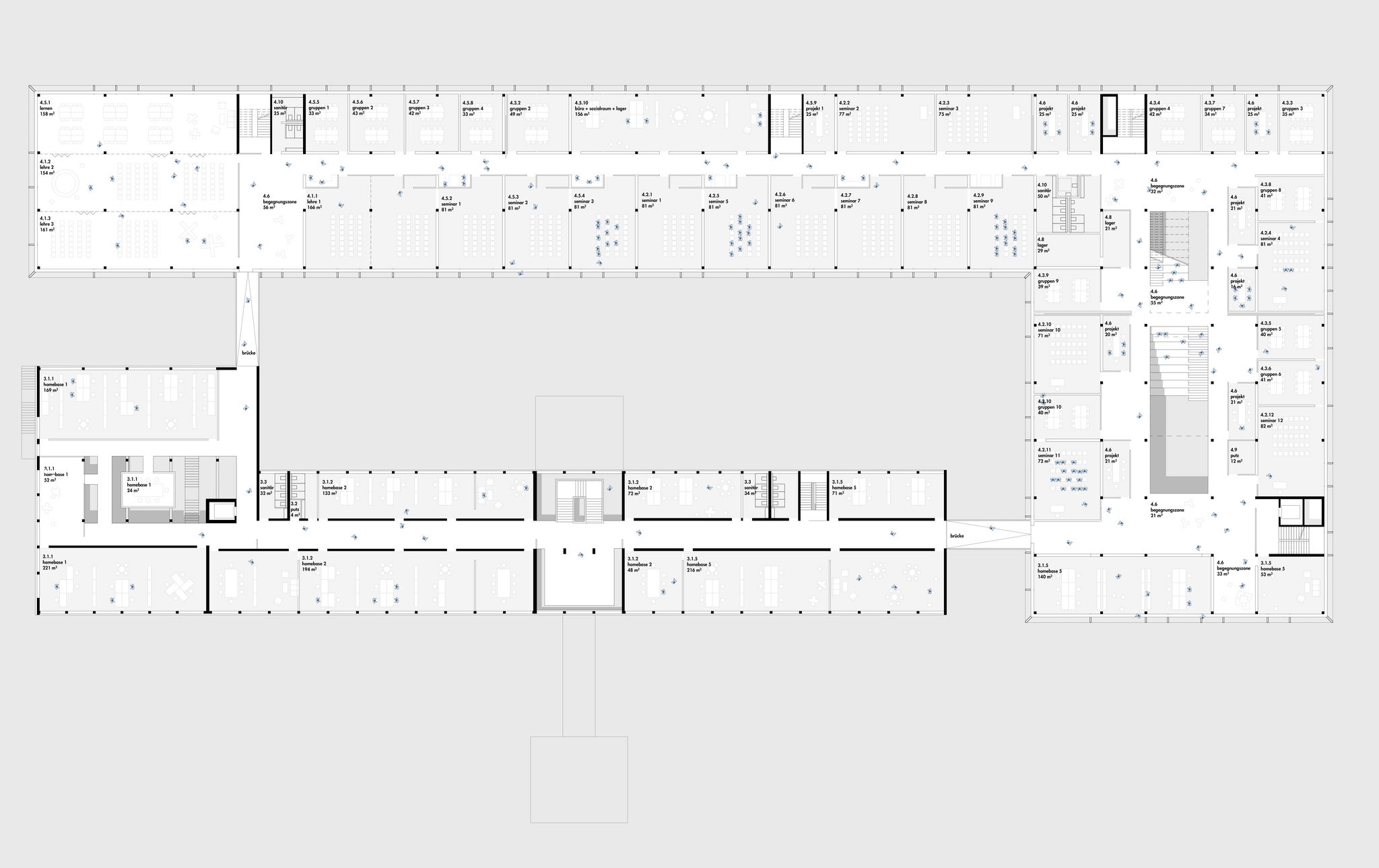 the two complementary structures create a new center and enliven the campus. they frame a new attractive courtyard and respond to the existing artworks by artist "bischoffshausen", which can remain in place and be reinterpreted. identity, openness and networking are taken up as a central campus theme and are implemented in the design.