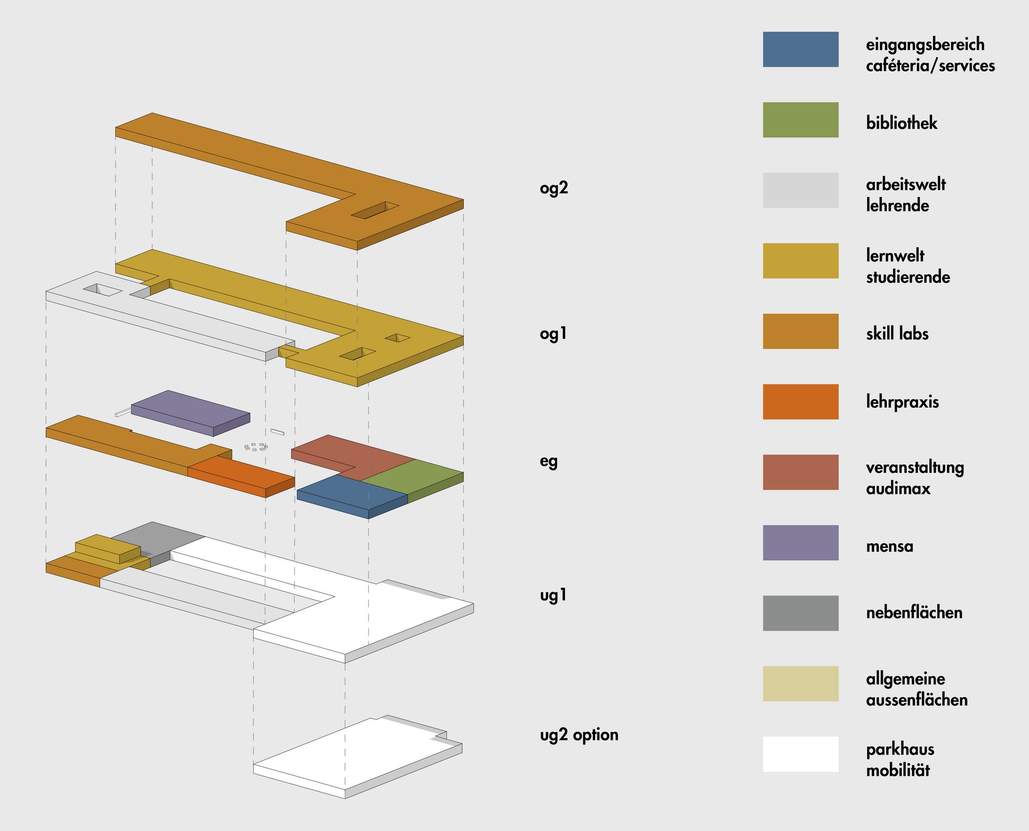 the clear large form is composed of several sections in the interior. within the reduced geometry, diverse spatial scenarios and usage options are created. audimax, library, services and caféteria form a public ground floor zone with a room height of over 4m. the auditorium with air space becomes a generous place for meeting and communication.