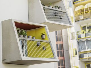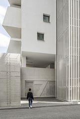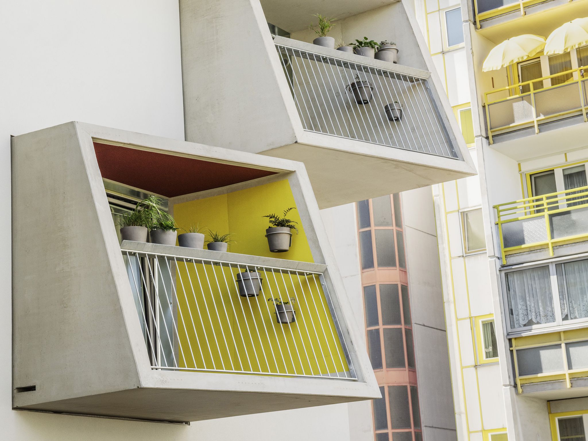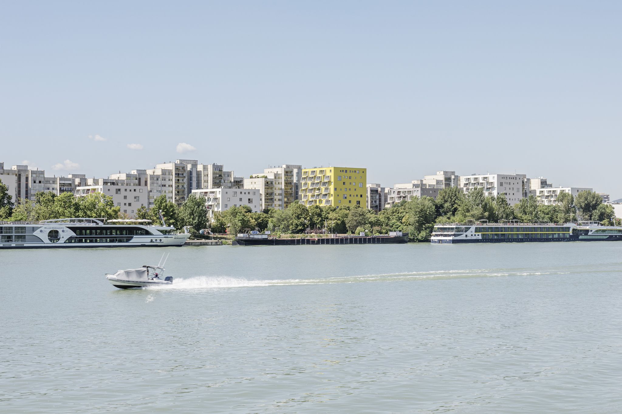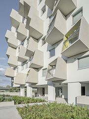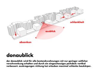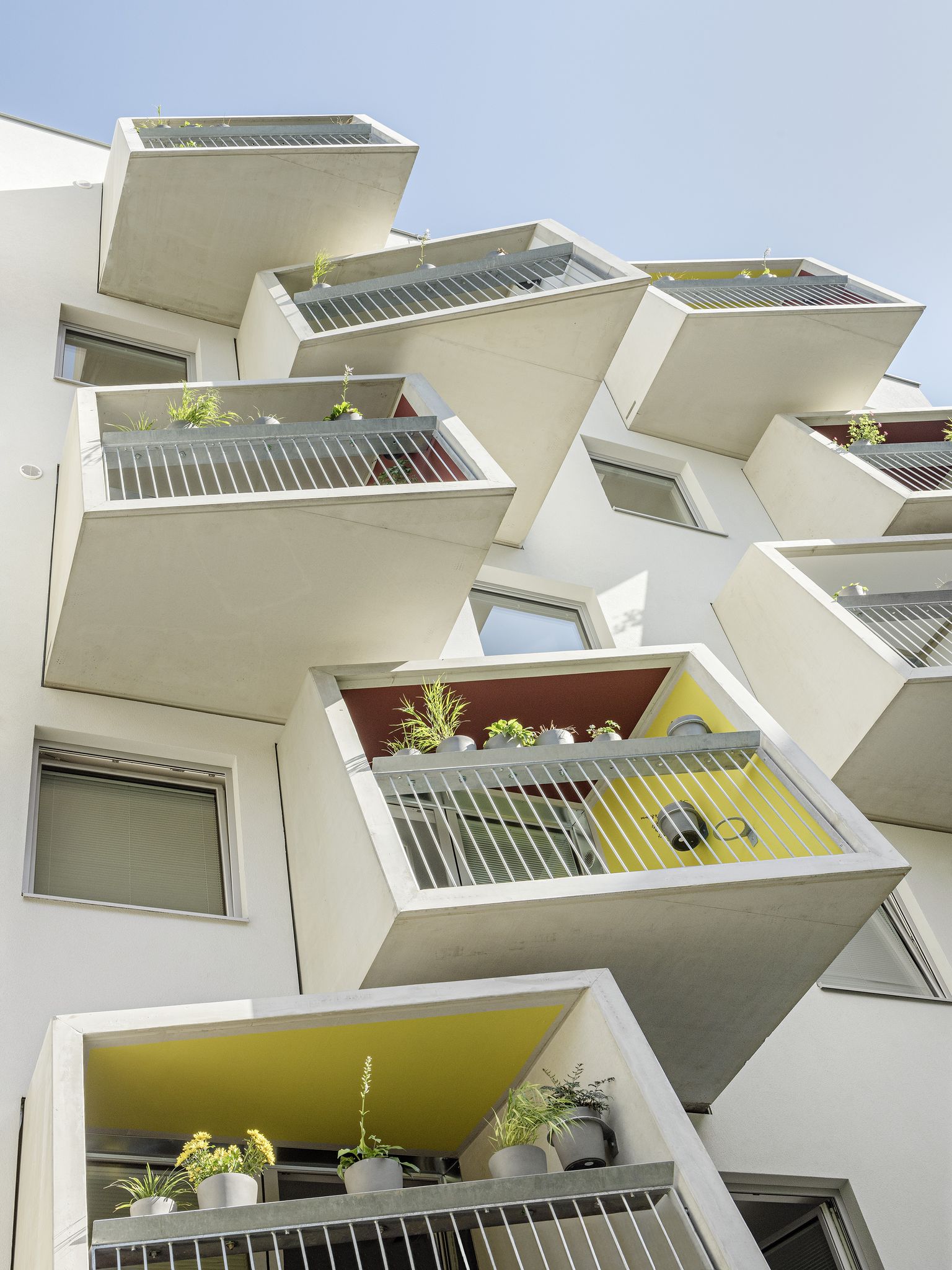 perhaps the most striking feature of the new residential complex are the cantilevered loggias. these prefabricated concrete elements are attached to the north-western and south-eastern façades of each building. by tilting them, the view to the outside and into the private area is deliberately directed towards the danube. in this way, the outside space remains private and the special view receives the attention that this place requires.