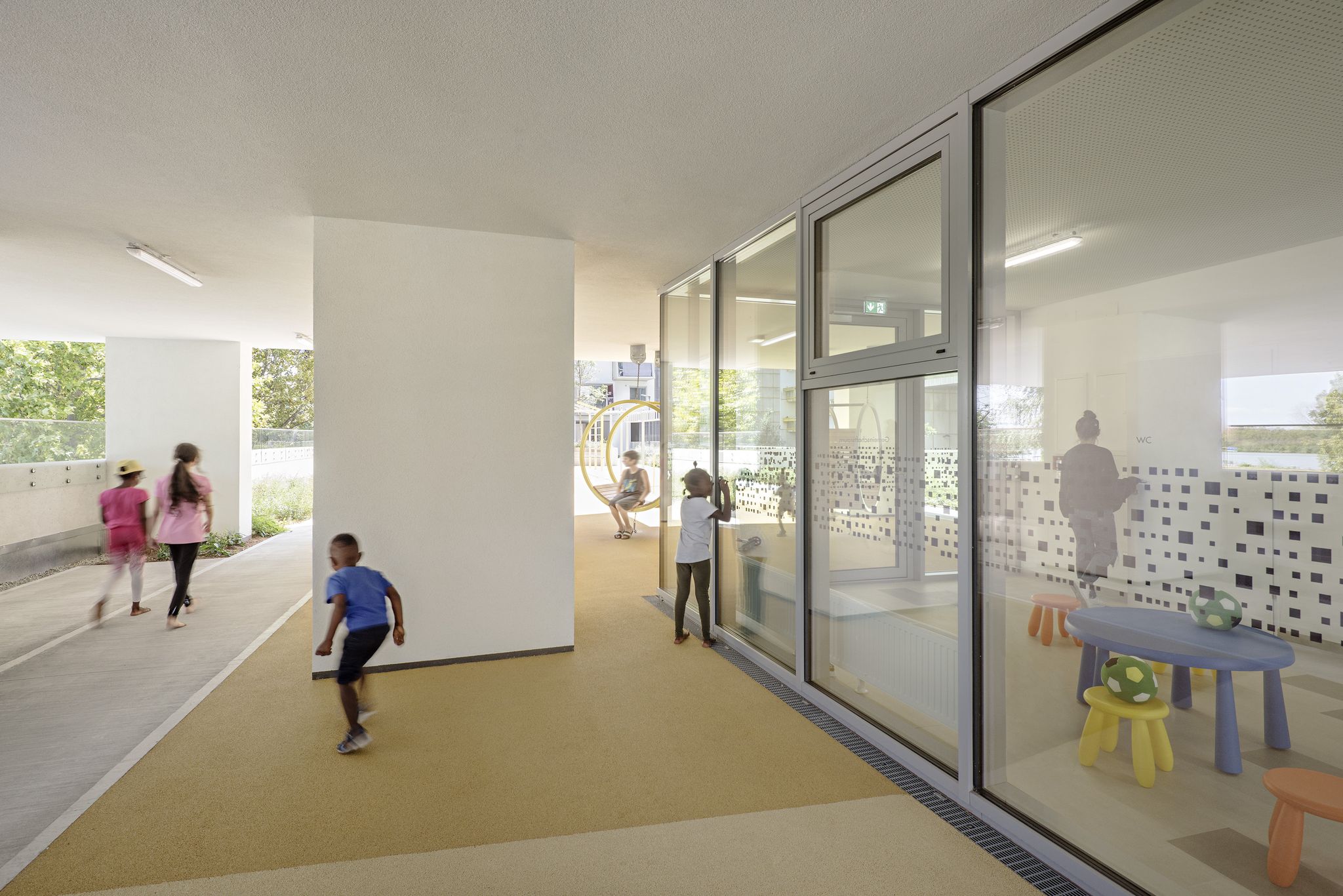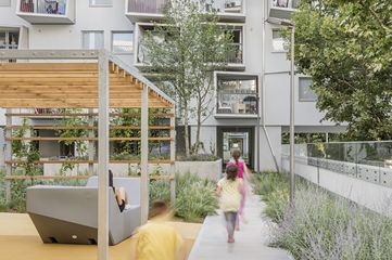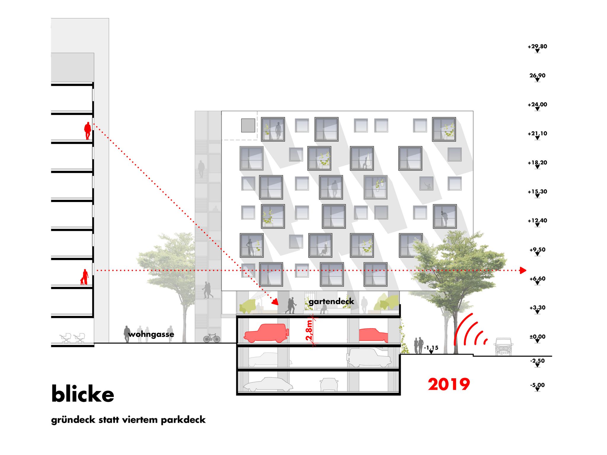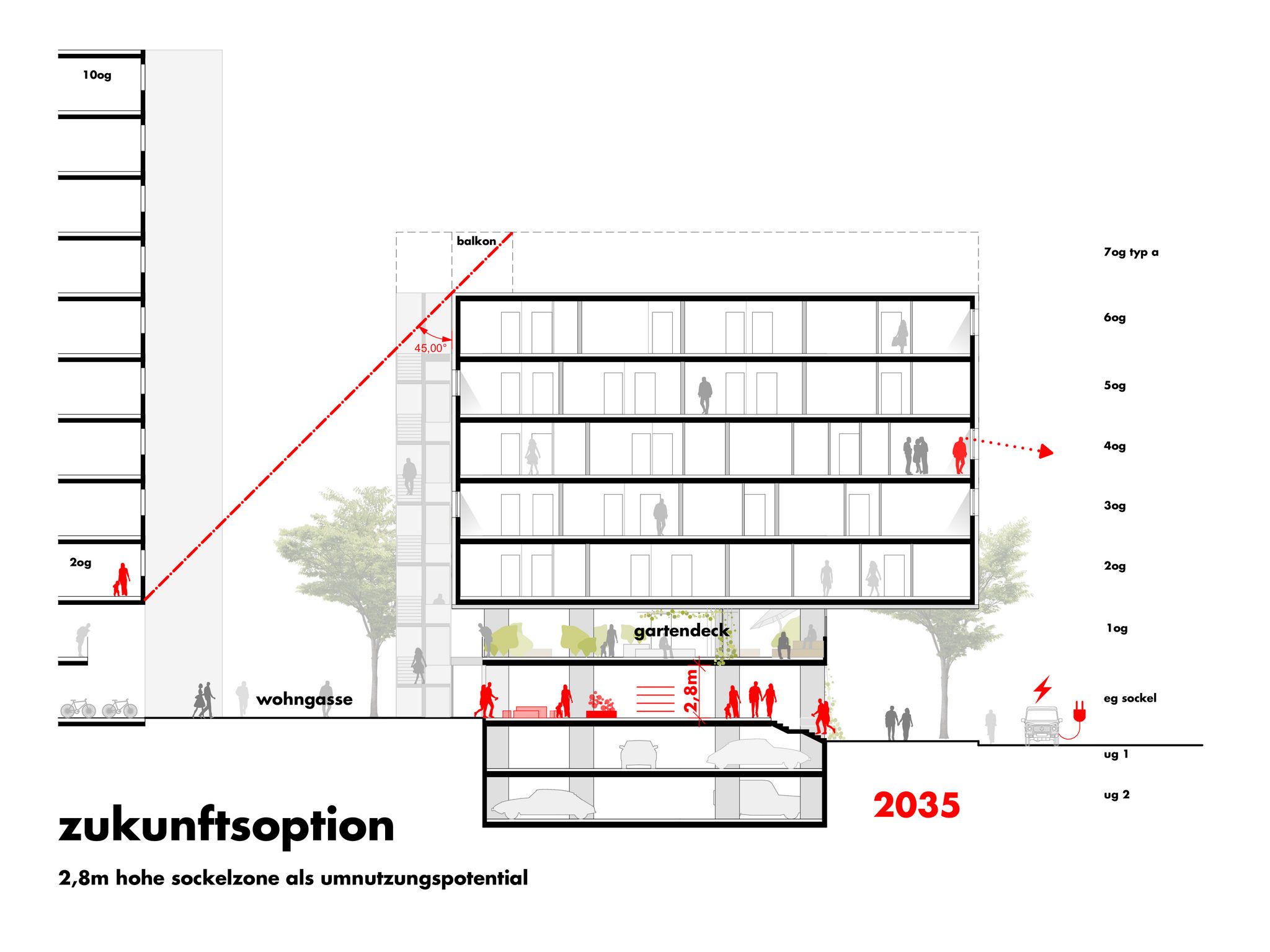 the activated wohngasse, which runs between the existing buildings and the new buildings, is both a connecting and structuring element for the entire complex. the shared outdoor space is accessed via generous open staircases. the 400m long green connecting platform offers communicative recreational zones and open spaces for lingering, exercising and gardening and improves the connection to the surrounding area.