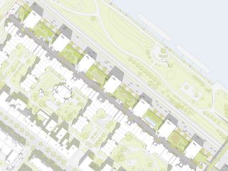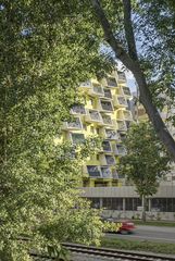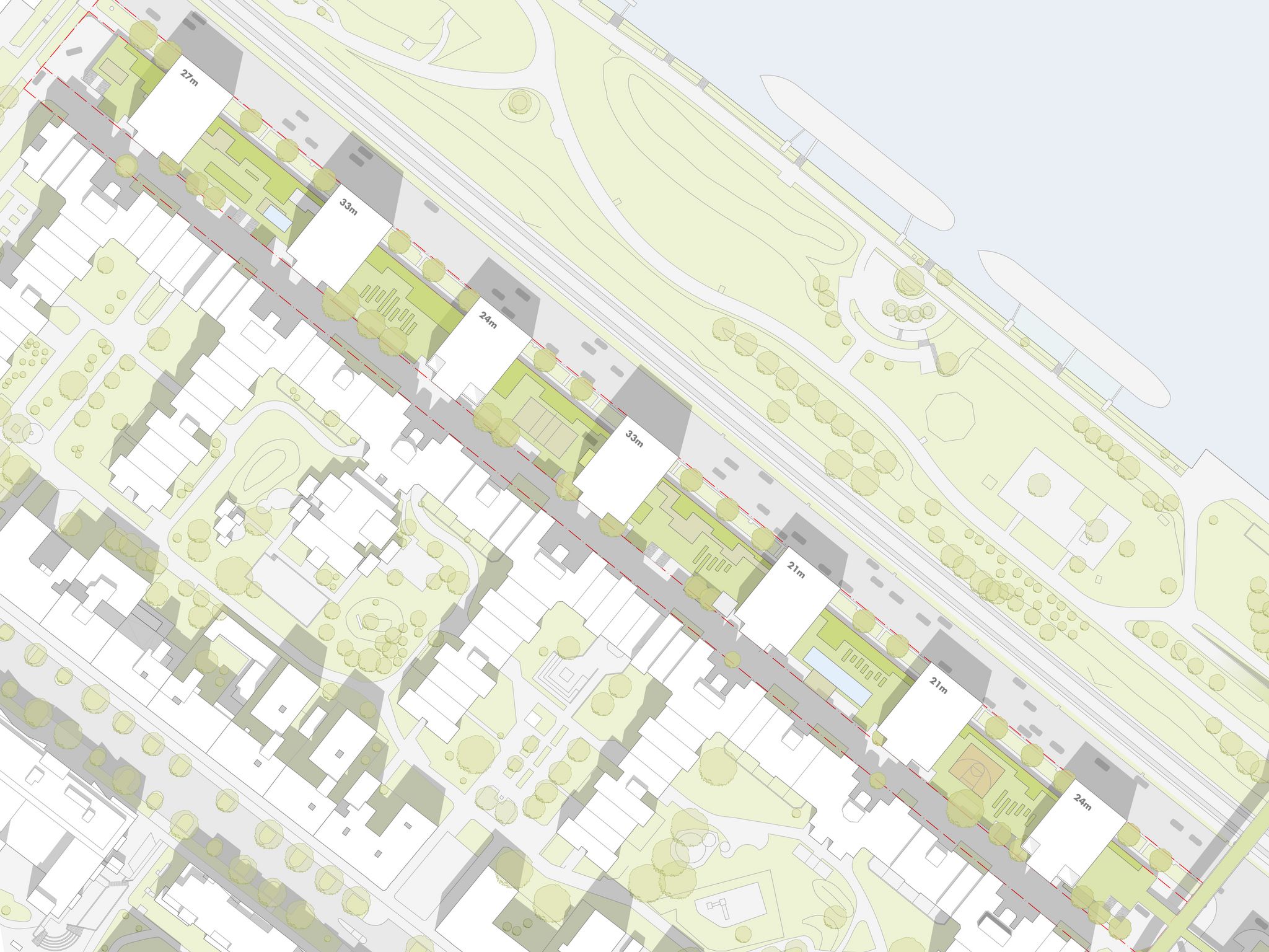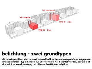 the wave-like structure of the existing buildings is continued by the staggered heights of the seven new blocks. the intelligent positioning of these blocks guarantees sufficient light for the living areas in the buildings behind. the heights of the buildings are adapted to the existing stairwells: type A rooms are lit vertically at an angle of 45°, while type B rooms can be angled to the side with higher buildings.
