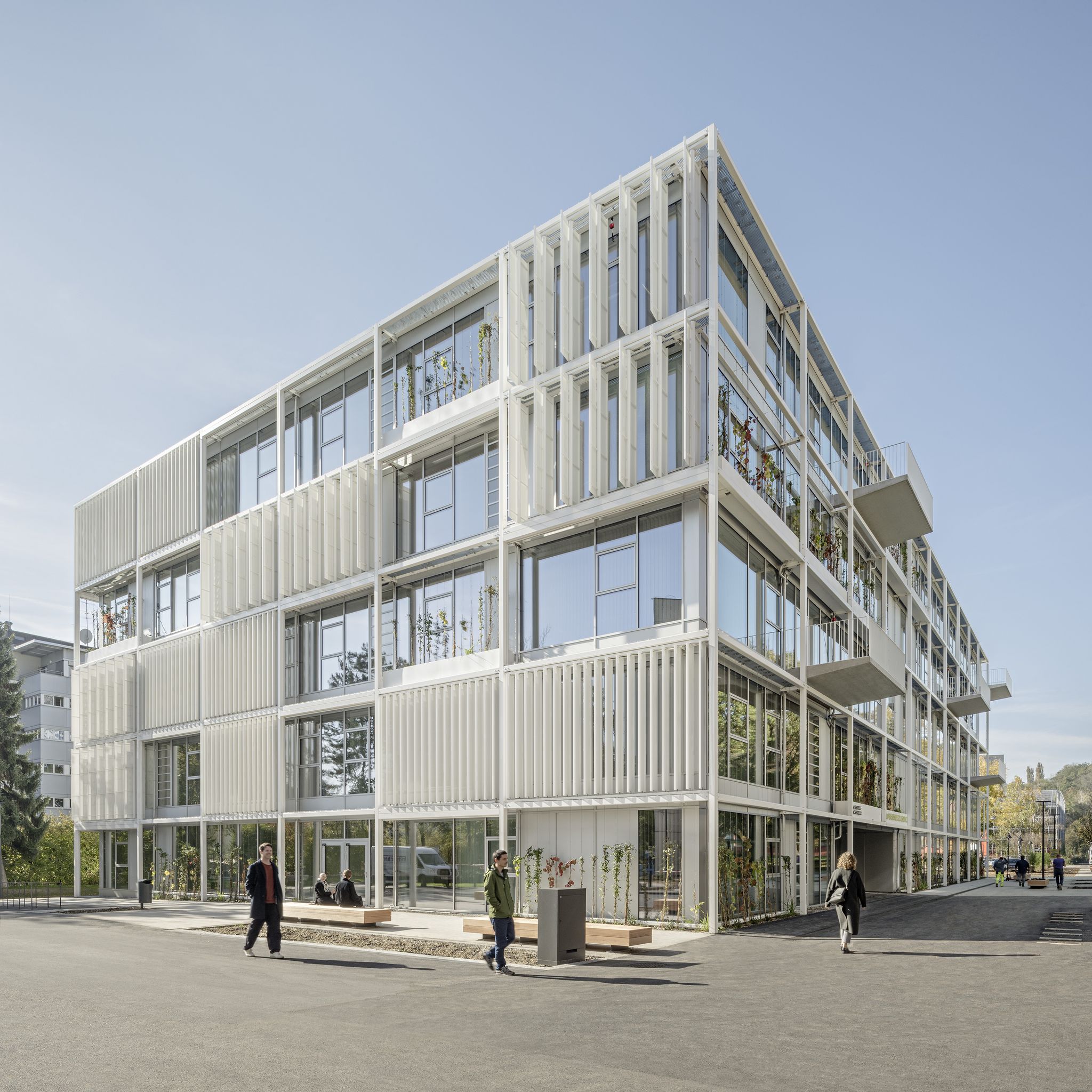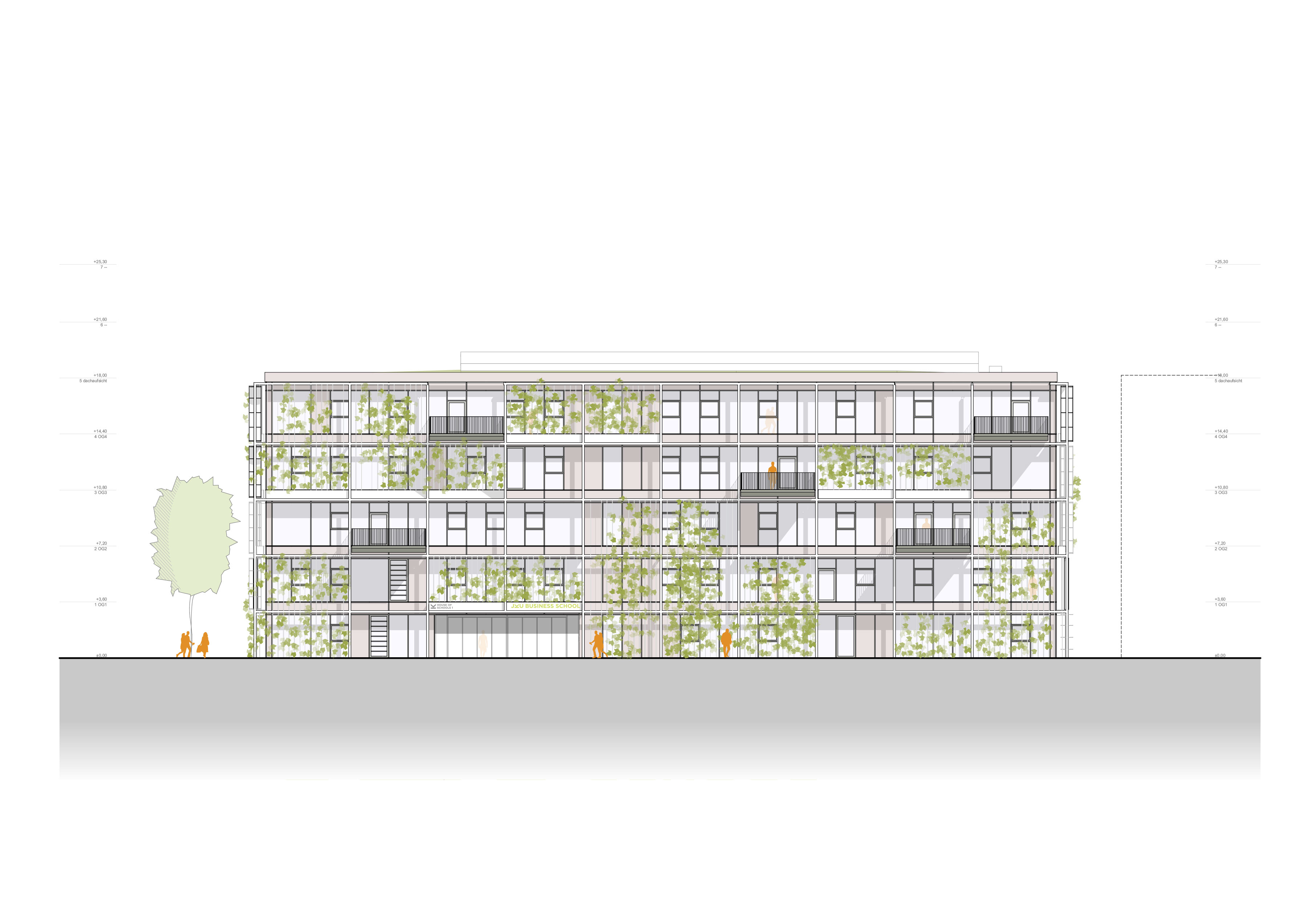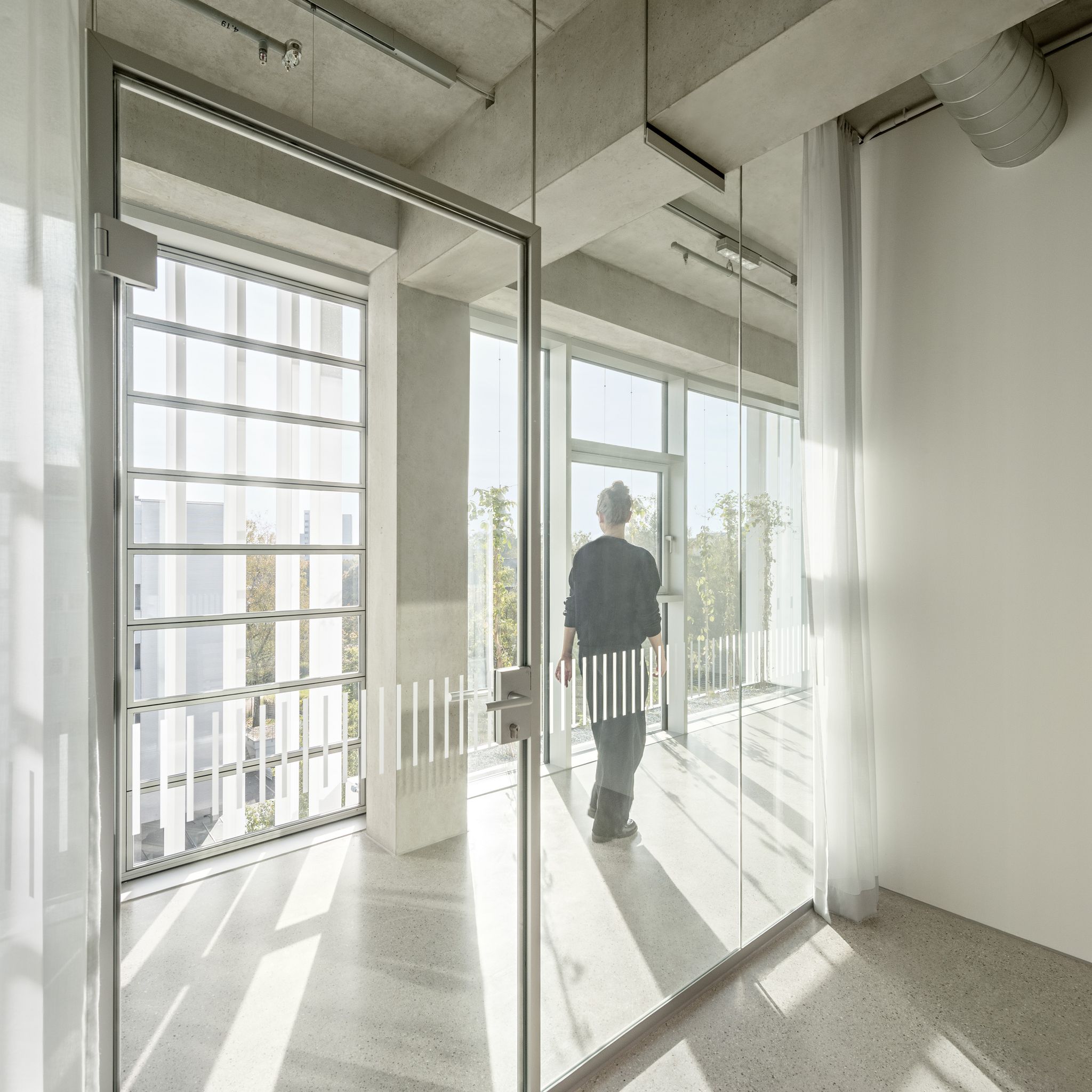 the selection of materials considers longevity, simplicity and demonstration and visibility of raw surfaces. the supporting structure, floor and ceiling are not hidden behind cladding elements; glass and metallic surfaces complement this raw character. the color and texture of the walls stand out clearly from the shell, making the individual building elements legible. the façade consists of two layers: a post and beam façade as a warm shell and a steel structure in front, embedding various sun protection elements and façade greenery. the two-layered nature of the shell and the light color scheme create a fascinating interplay of light, shadow and depth.