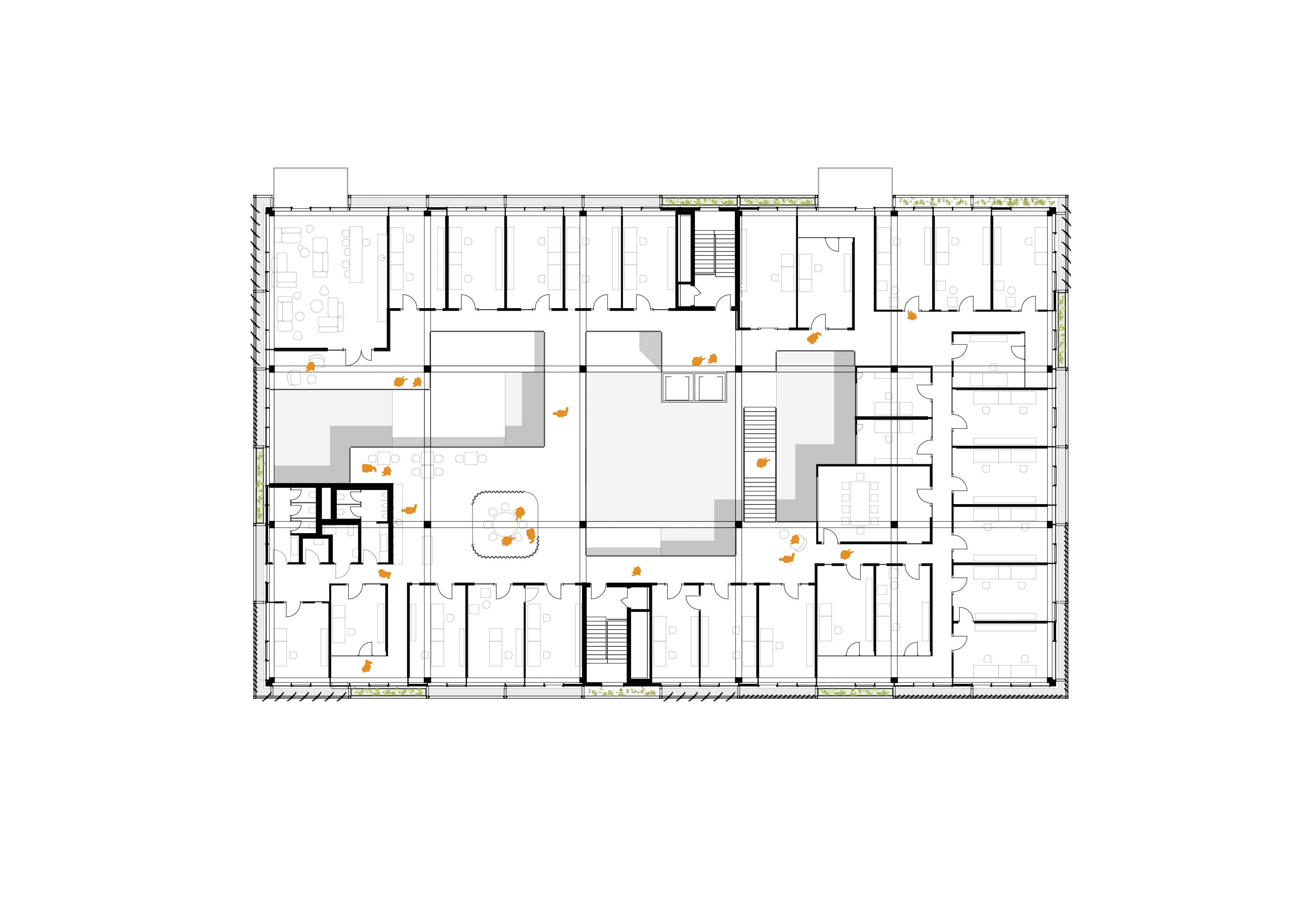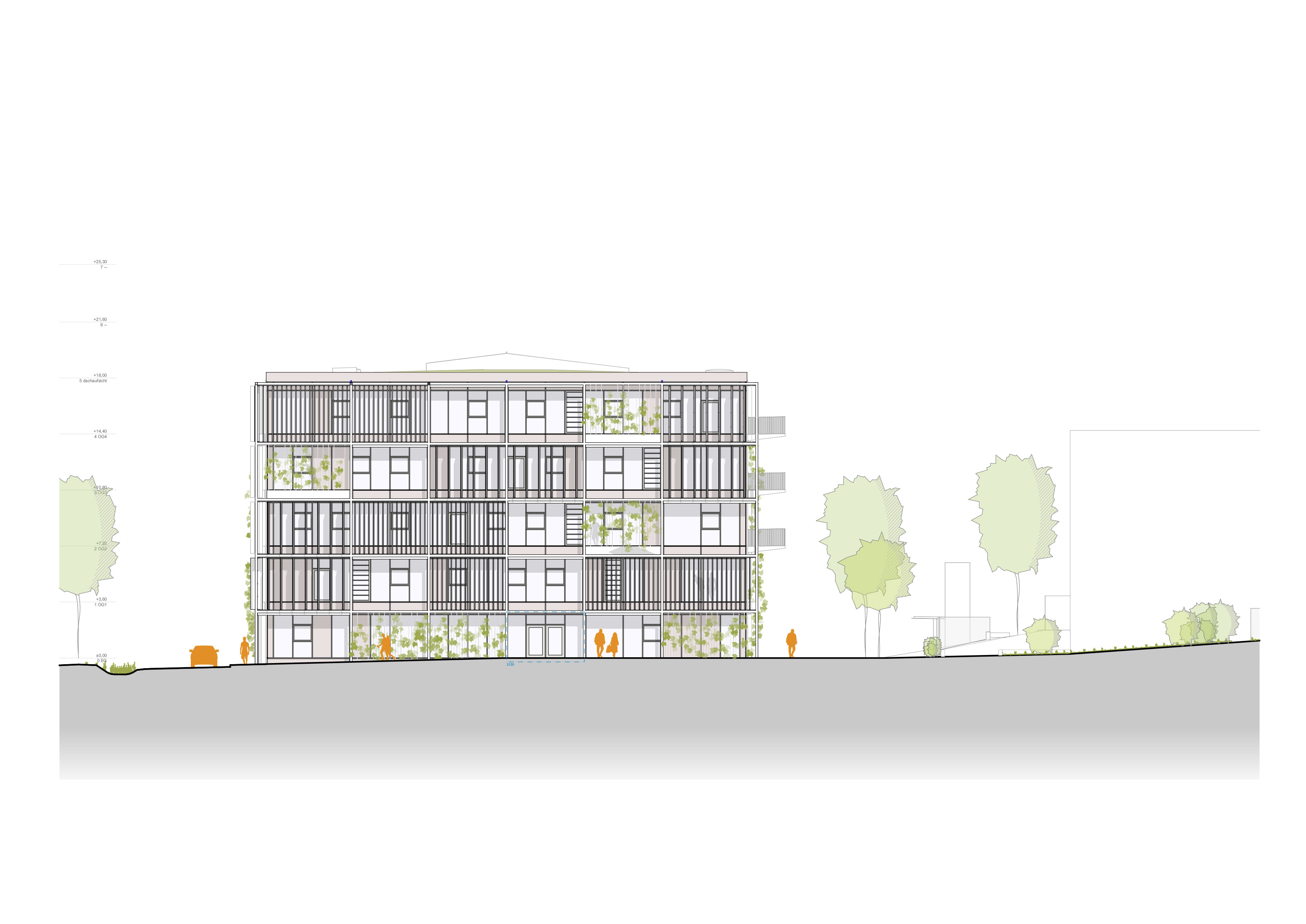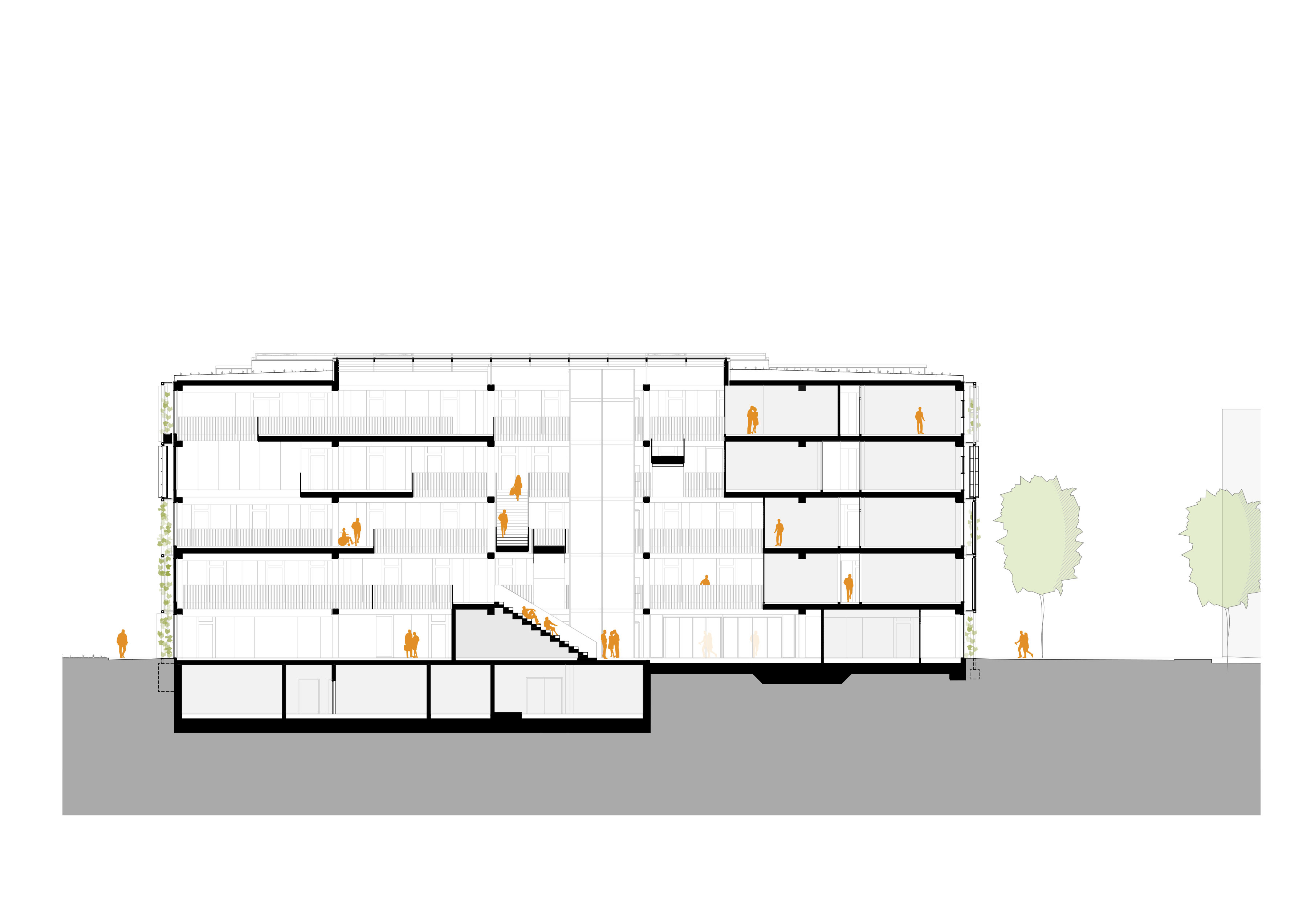 the selection of materials considers longevity, simplicity and demonstration and visibility of raw surfaces. the supporting structure, floor and ceiling are not hidden behind cladding elements; glass and metallic surfaces complement this raw character. the color and texture of the walls stand out clearly from the shell, making the individual building elements legible. the façade consists of two layers: a post and beam façade as a warm shell and a steel structure in front, embedding various sun protection elements and façade greenery. the two-layered nature of the shell and the light color scheme create a fascinating interplay of light, shadow and depth.