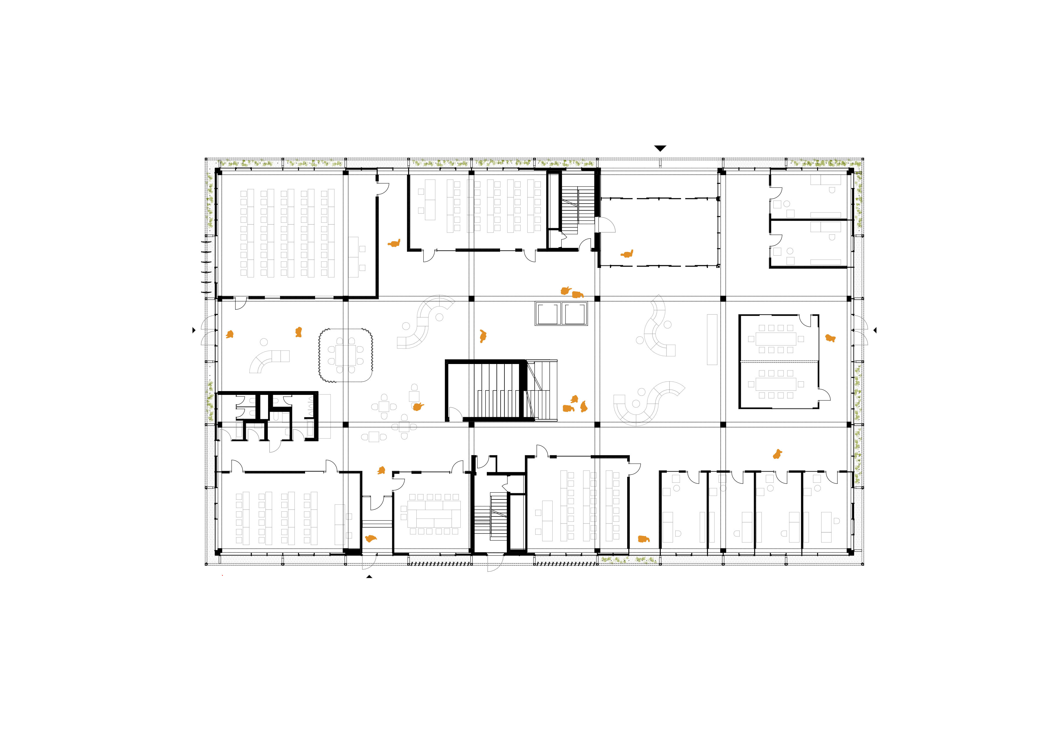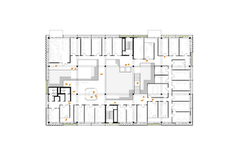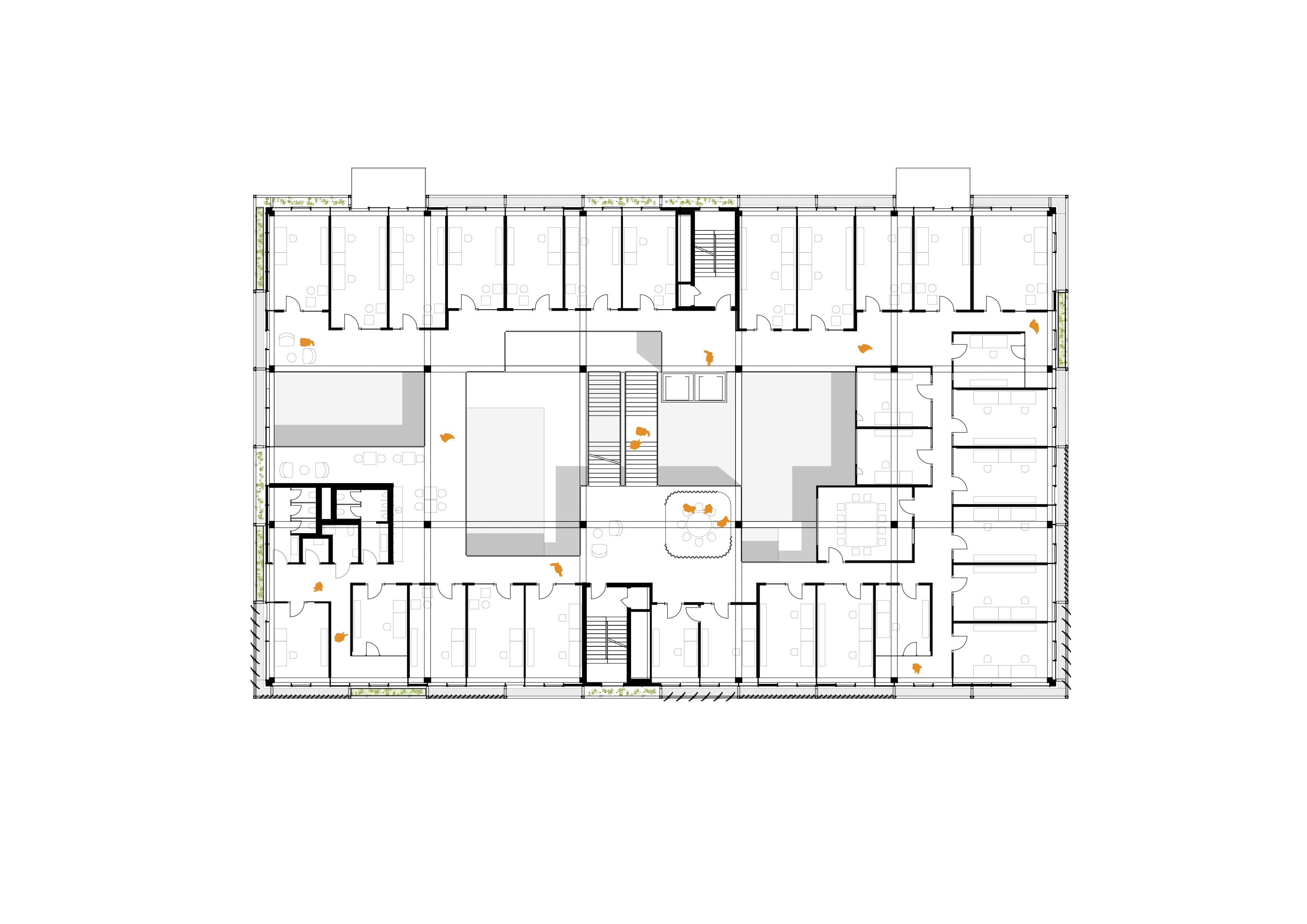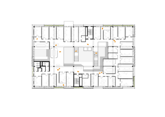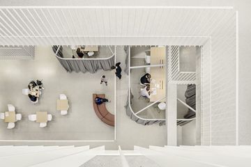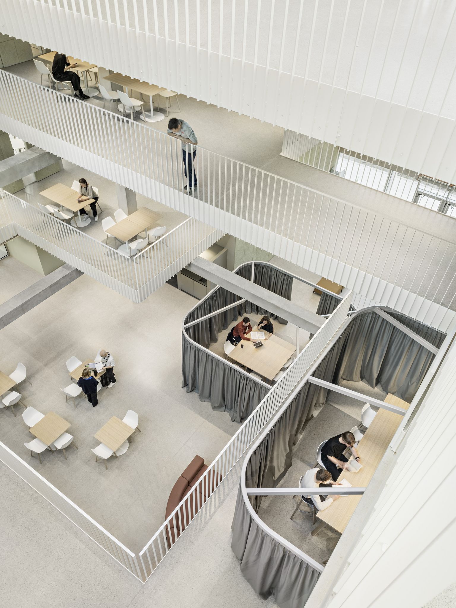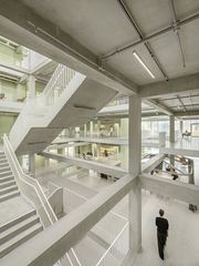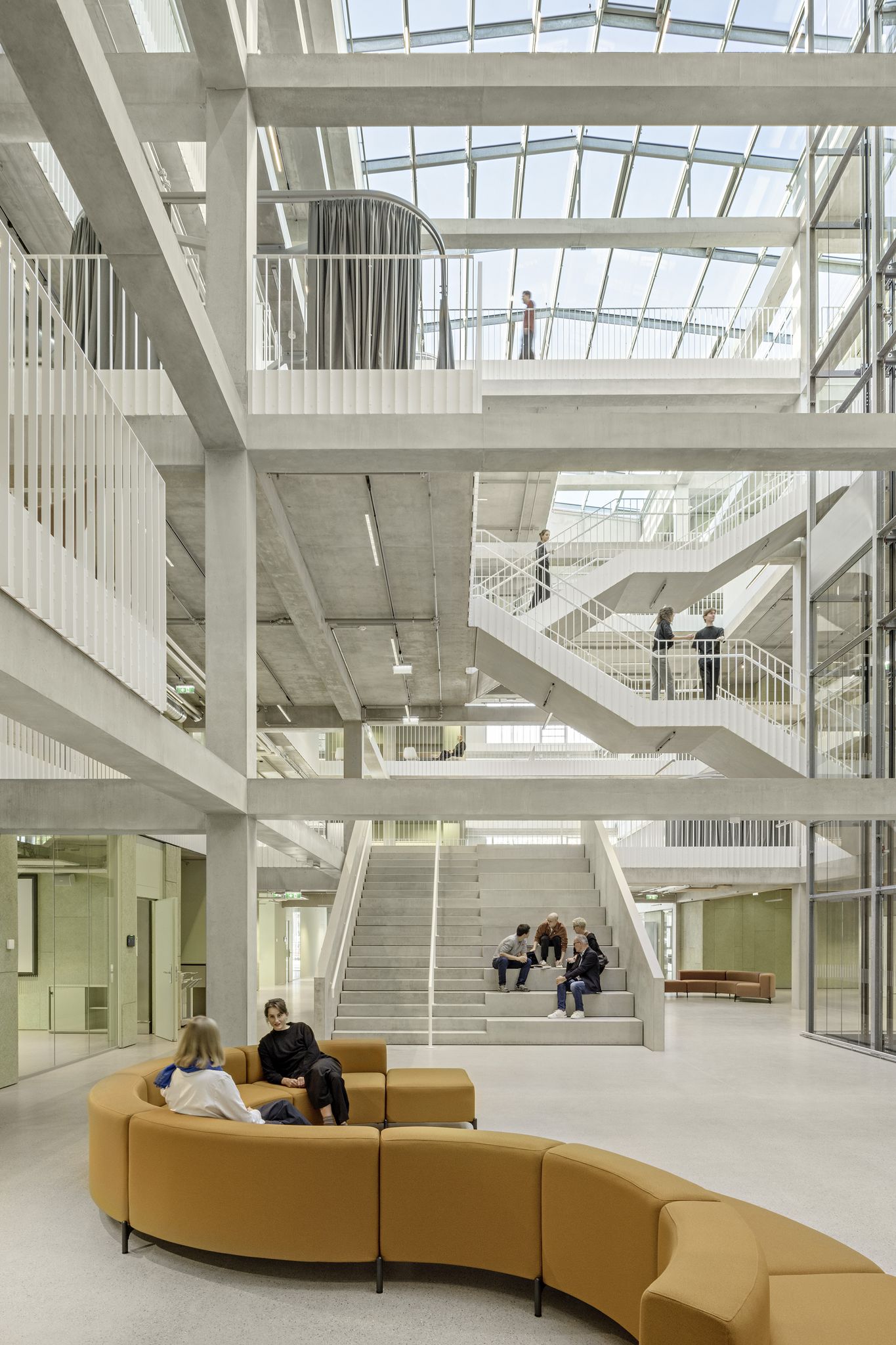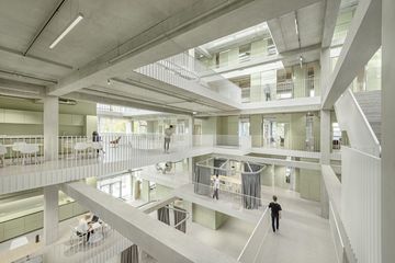 the house of schools 1 is a five-storey building that houses offices as well as meeting and seminar rooms. the supporting structure is based on a reinforced concrete skeleton, which allows flexible use of space thanks to a column grid of 10x10m. this structure creates space for rooms of various sizes - from individual offices to seminar rooms for up to 50 people. a central atrium connects all floors and serves as the communicative heart of the building. it invites people to meet and offers space for formal and informal encounters. kitchenettes and meeting islands on each floor encourage interaction and make the building a lively place to work and learn. the ground floor is a lively and permeable space that opens up a wide range of possible uses due to its spaciousness. it acts as a connecting hub between different functional areas and connects all floors through the five-storey atrium.
