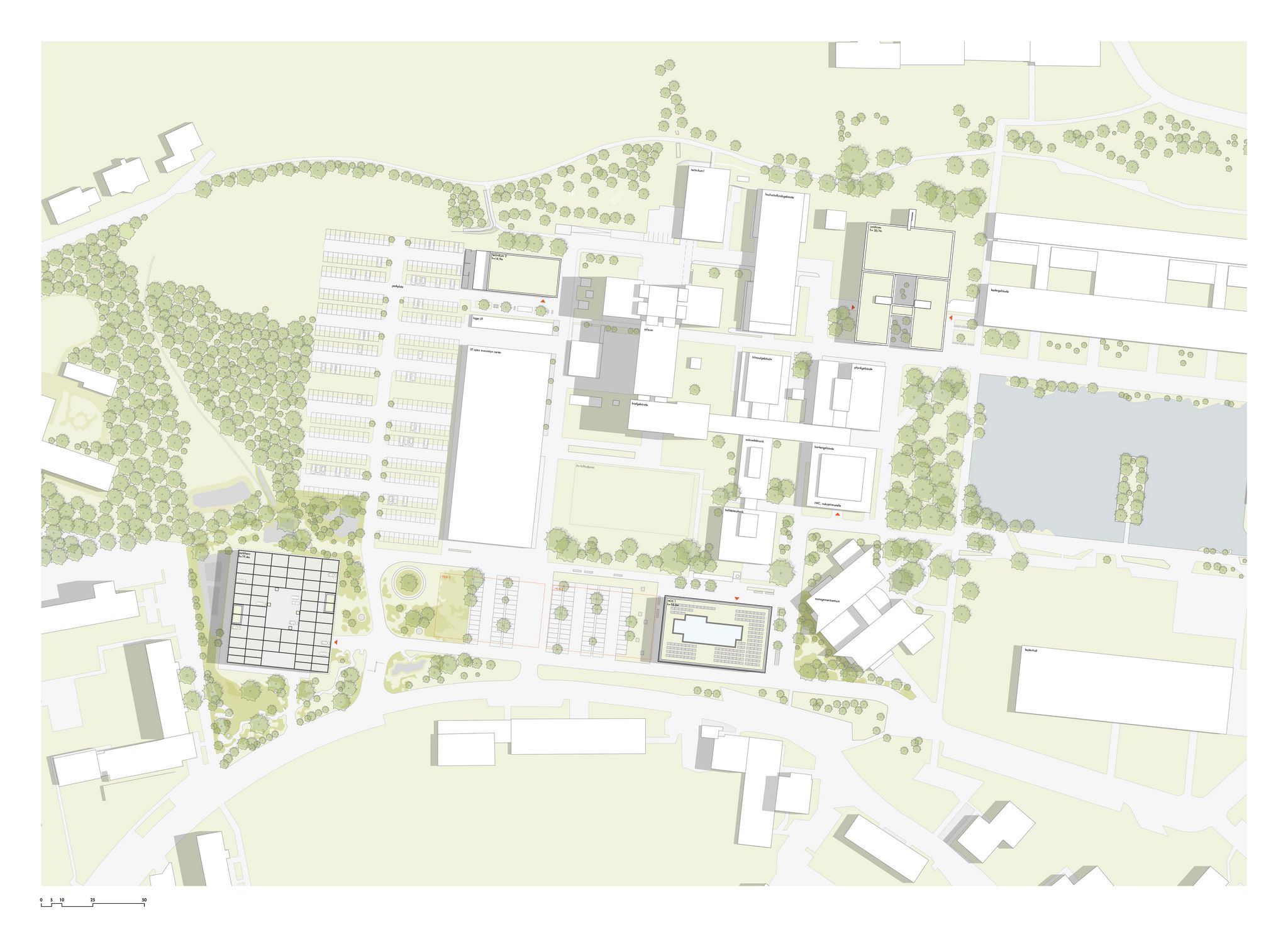 the house of schools sets a striking accent in the development of the jku campus in linz. as the first part of the future ensemble, the building clearly structures the campus in the south and creates an inviting courtyard in the north. it continues the existing development axis and creates orientation and a clear structure. the compact arrangement of the buildings provides space for future extensions to the west.