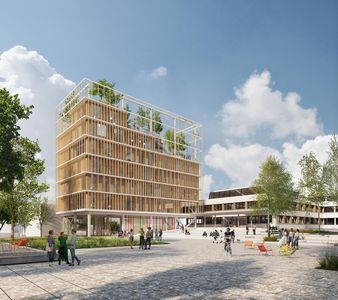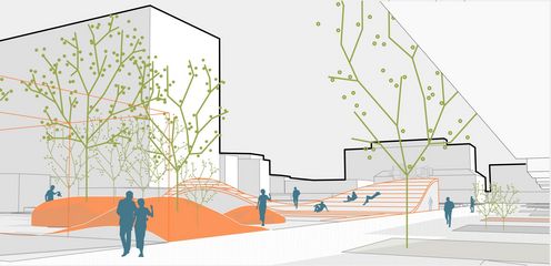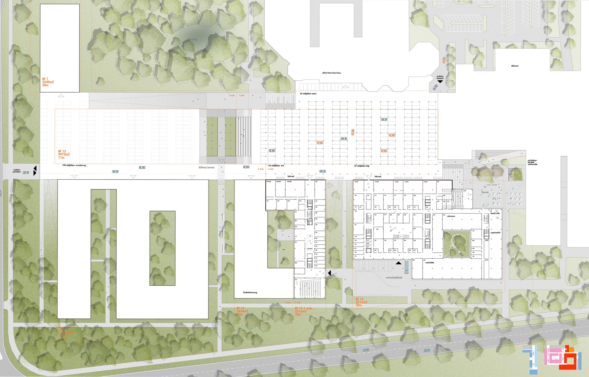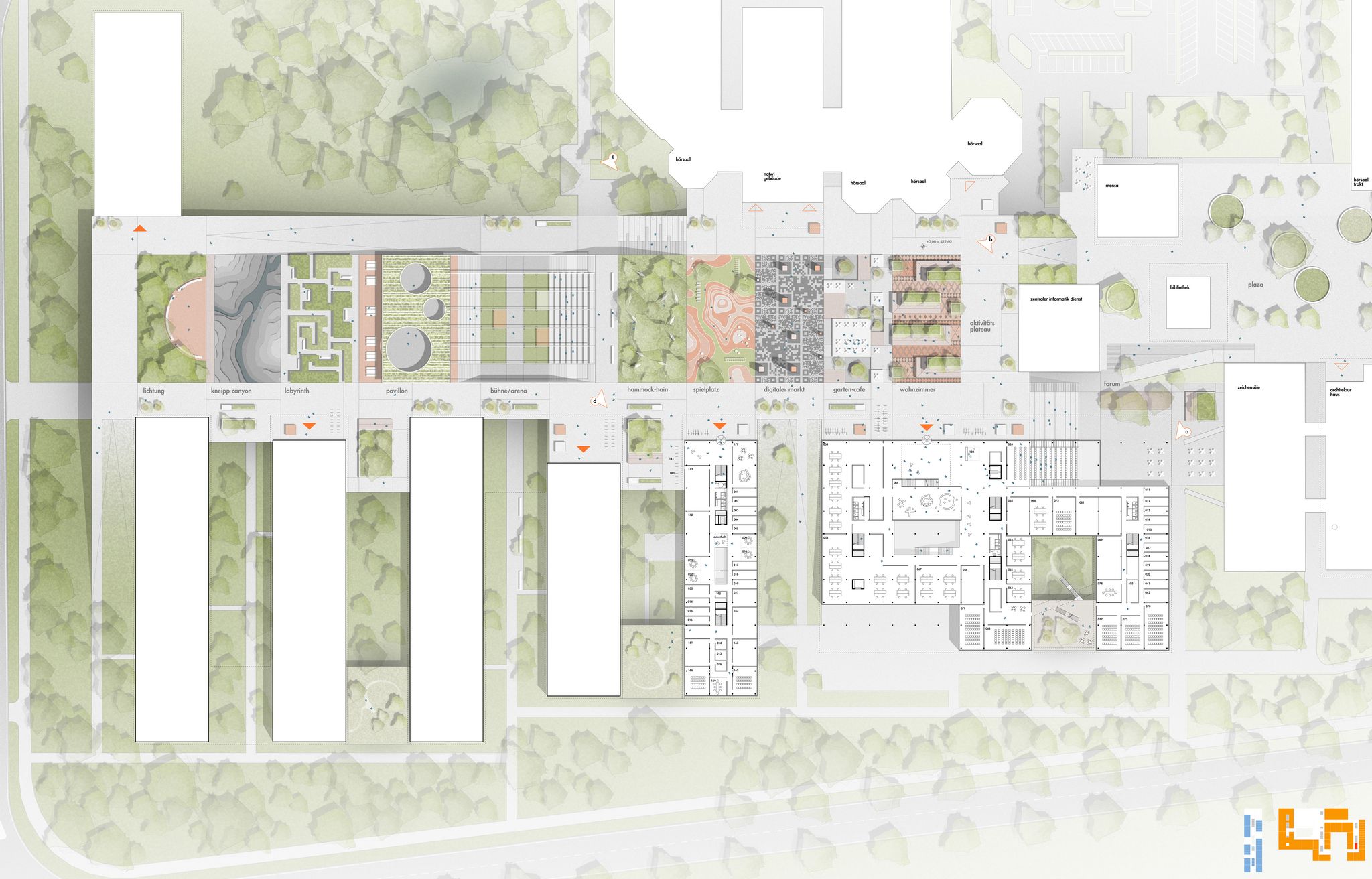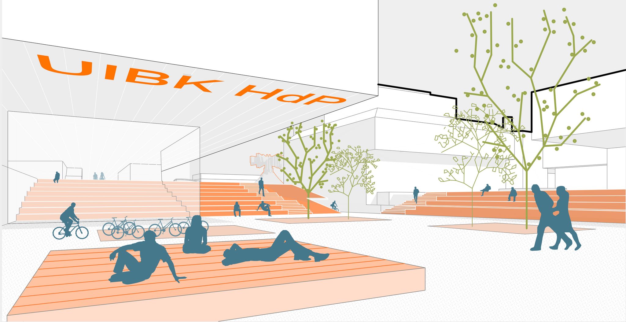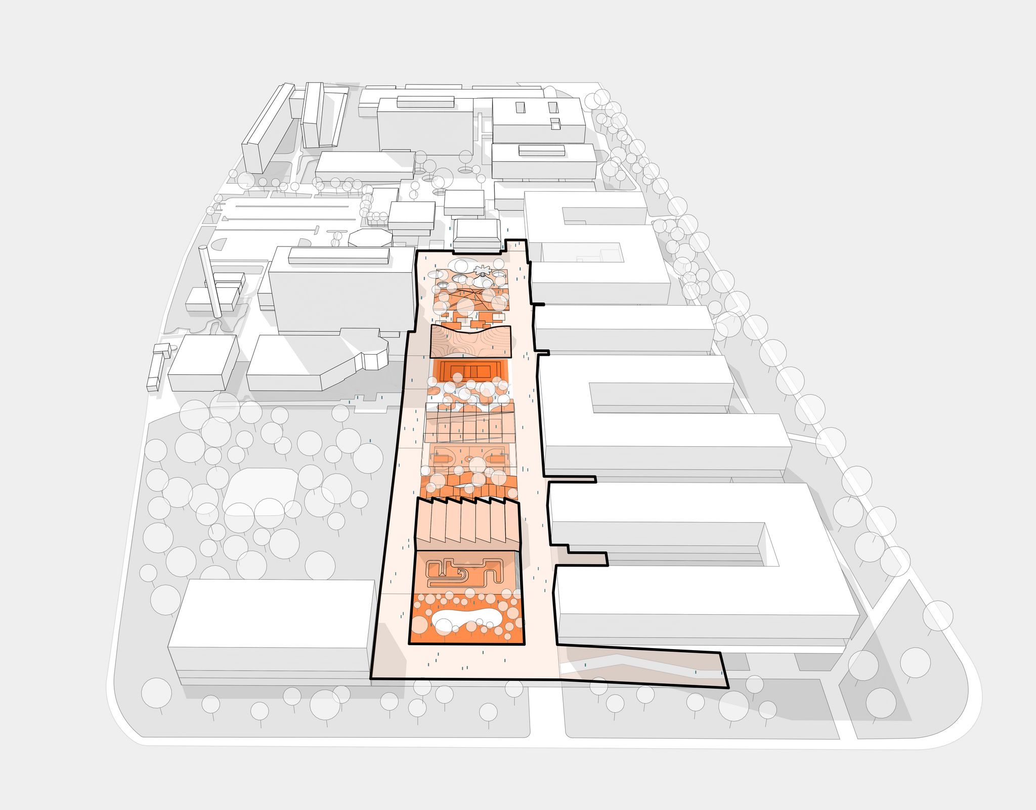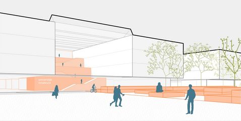 in line with the prachensky masterplan, the plateau extends the campus axis and is filled with a rich repertoire of activities. An attractive and active university campus is created through various programmatic densification. based on a simple system, flexibly utilizable open spaces with a strong formal identity and diverse characters are created.