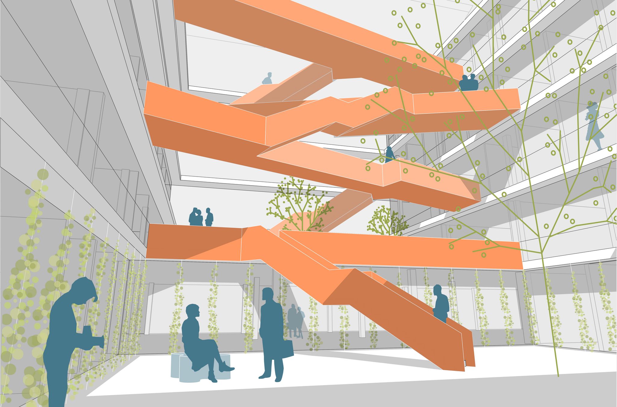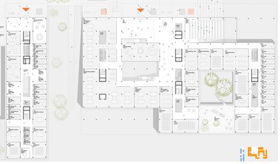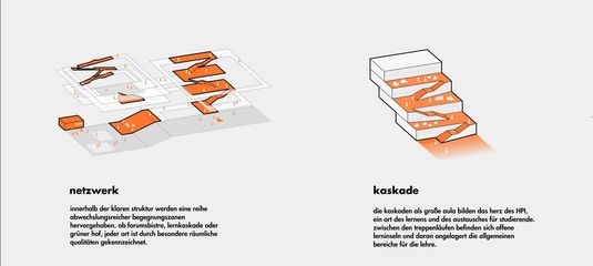 the cascades as a large hall form the heart of the HPI, a place of learning and exchange for students. open learning islands are located between the flights of stairs and the general areas for teaching are attached to them. Within the clear structure, further diverse places for encounters are highlighted. whether it’s the forum bistro, the orangerie or the green courtyard, each place is characterized by unique spatial qualities.