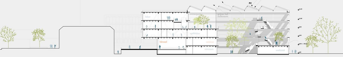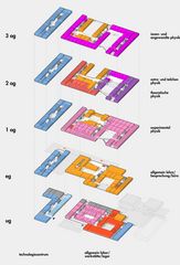 The plateau continues into the buildings through a transparent ground floor and thus underlines the horizontal structure of the building - the volumes above appear to be floating. a rhythmic sequence of longer and shorter facades accompanies and frames the center. U- and S-shaped structures interweave with the surroundings and generate bays or, as in the case of the house of physics, a cascade-like air space as a communicative center. Permeability and visual connections in transverse directions are always retained. Loop-shaped circular paths establish a spatial network that is in harmony with a contemporary organizational form of innovative cutting-edge research.