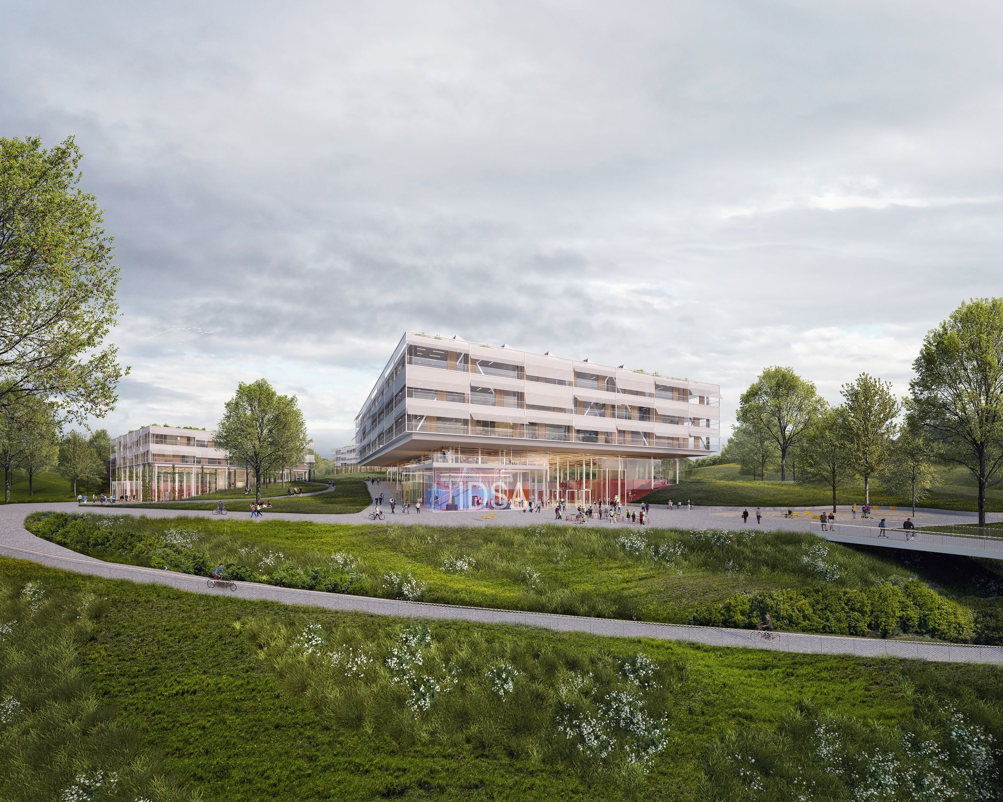 the new institute of digital sciences austria is characterized by flexibility and networking and creates a strong prelude with its identity-creating hub (construction phase 1). the sensitive integration into the existing landscape creates a harmonious interplay between nature and architecture. the elevated location of the campus offers an unobstructed view of the pöstlingberg and the city center of linz.