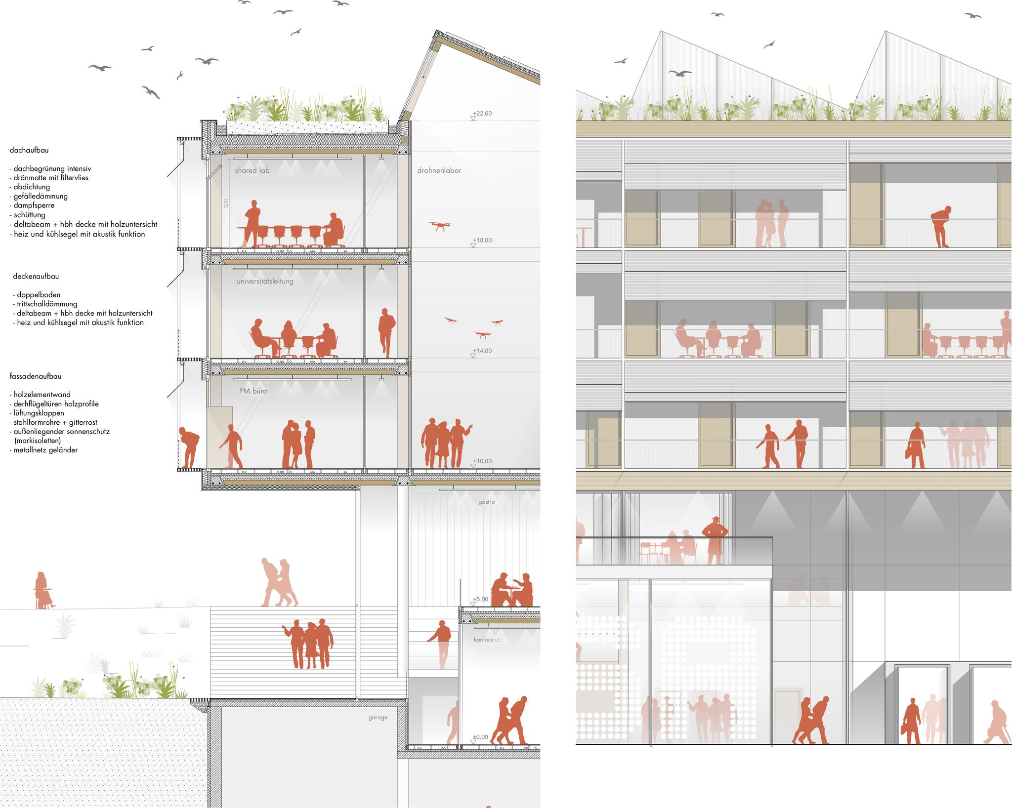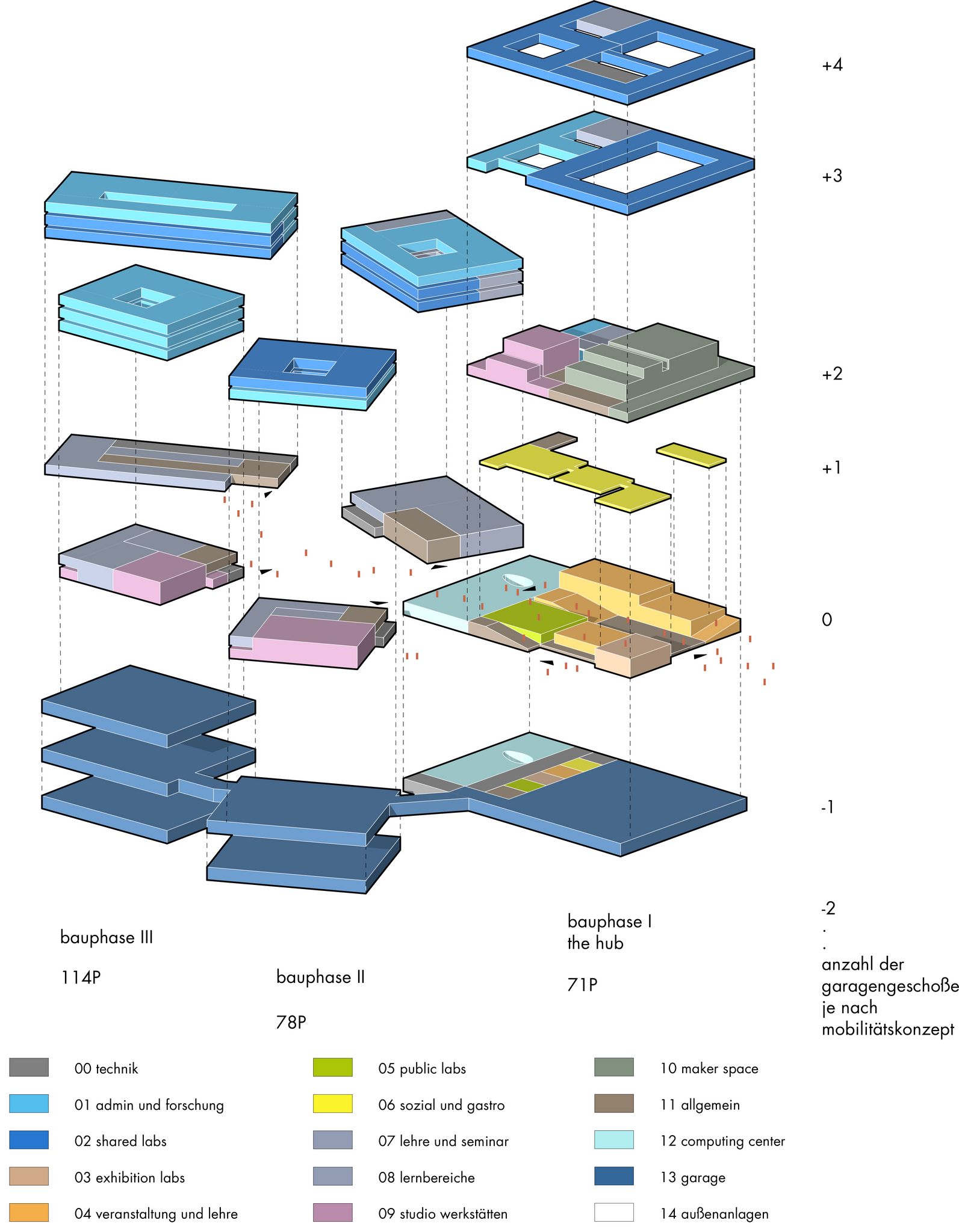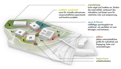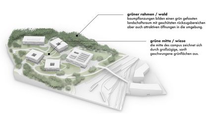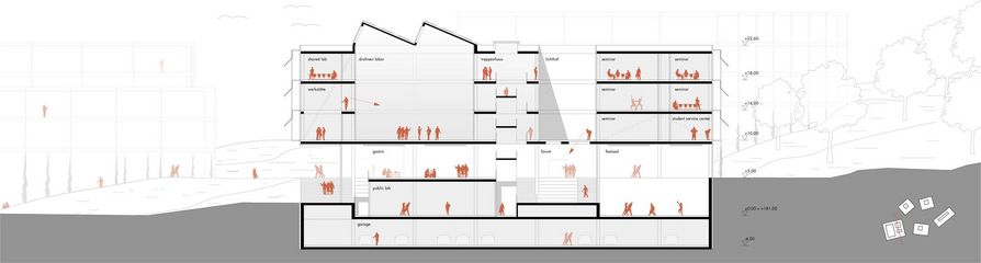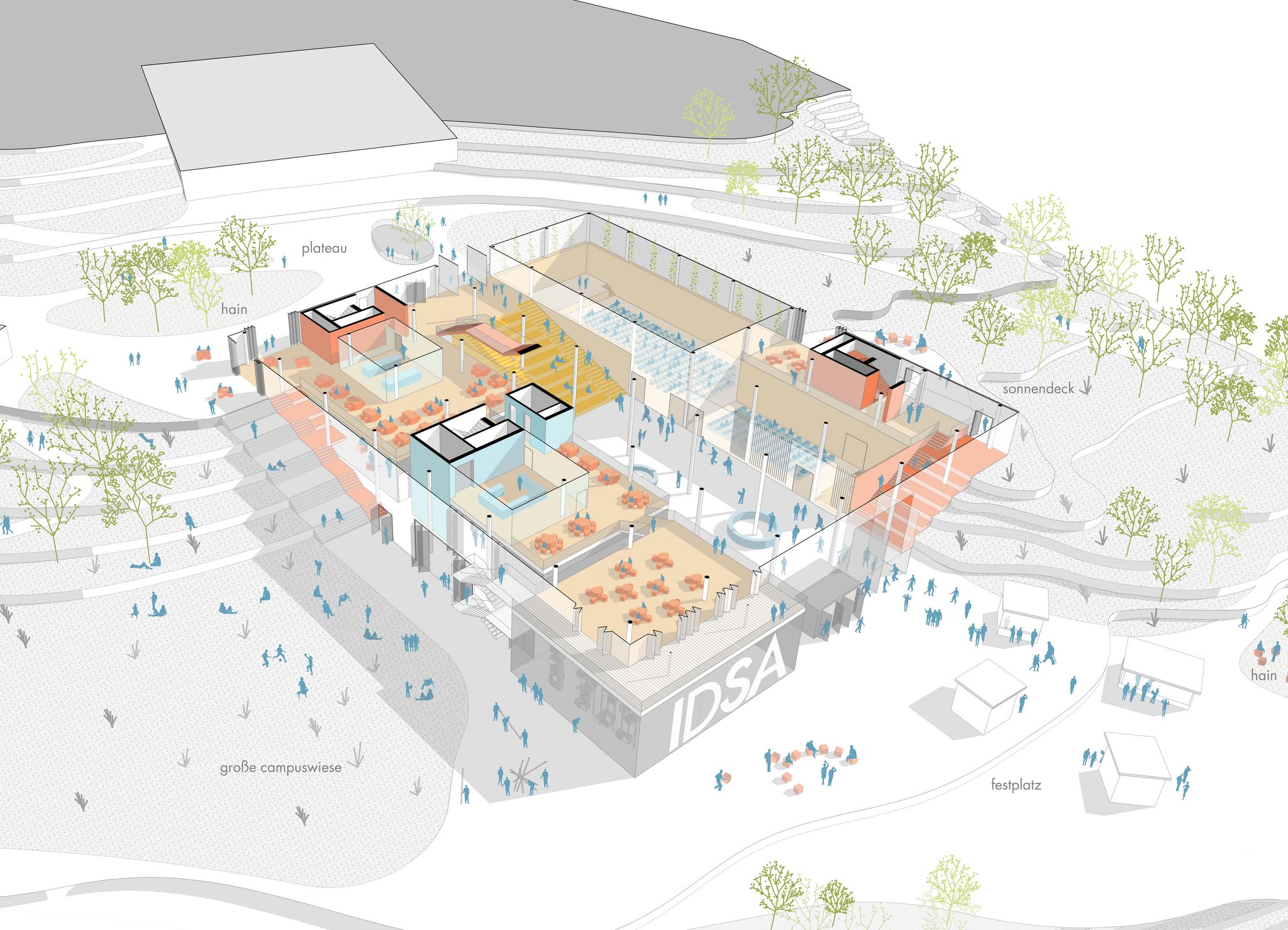 as the central anchor point of the campus, "the hub" is being created in the first phase - a place for internal and external exchange. the spacious forum serves as a versatile space with public functions such as a banquet hall, exhibition area and canteen. its flexible structure allows students to design the space individually and adapt to changing needs. the integrated data center is inserted into the slope and is naturally lit with recesses.
