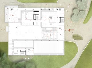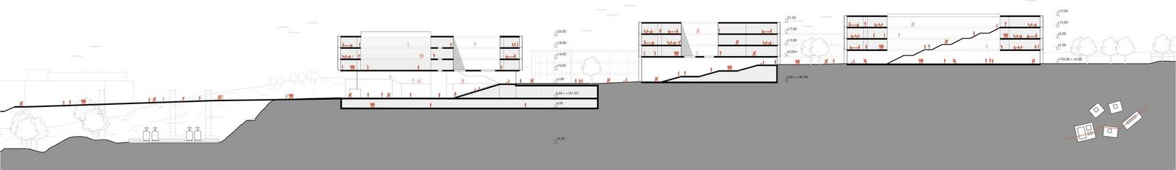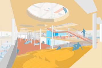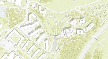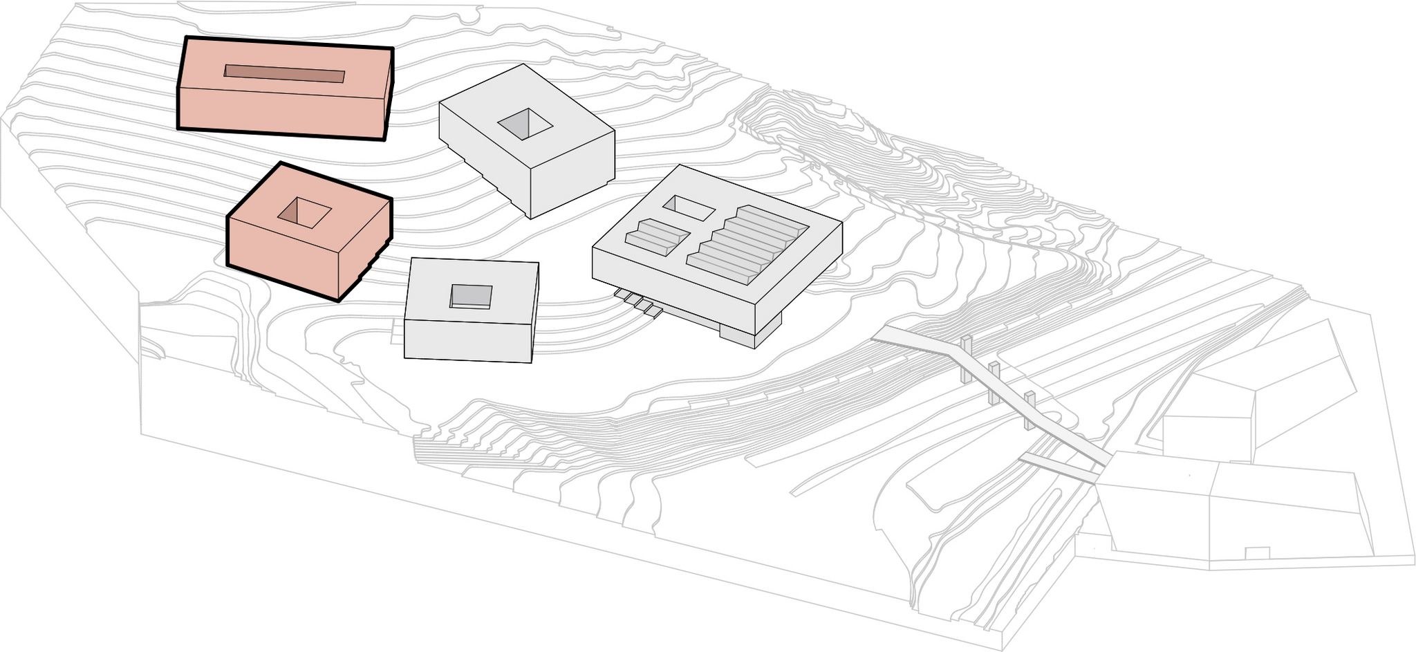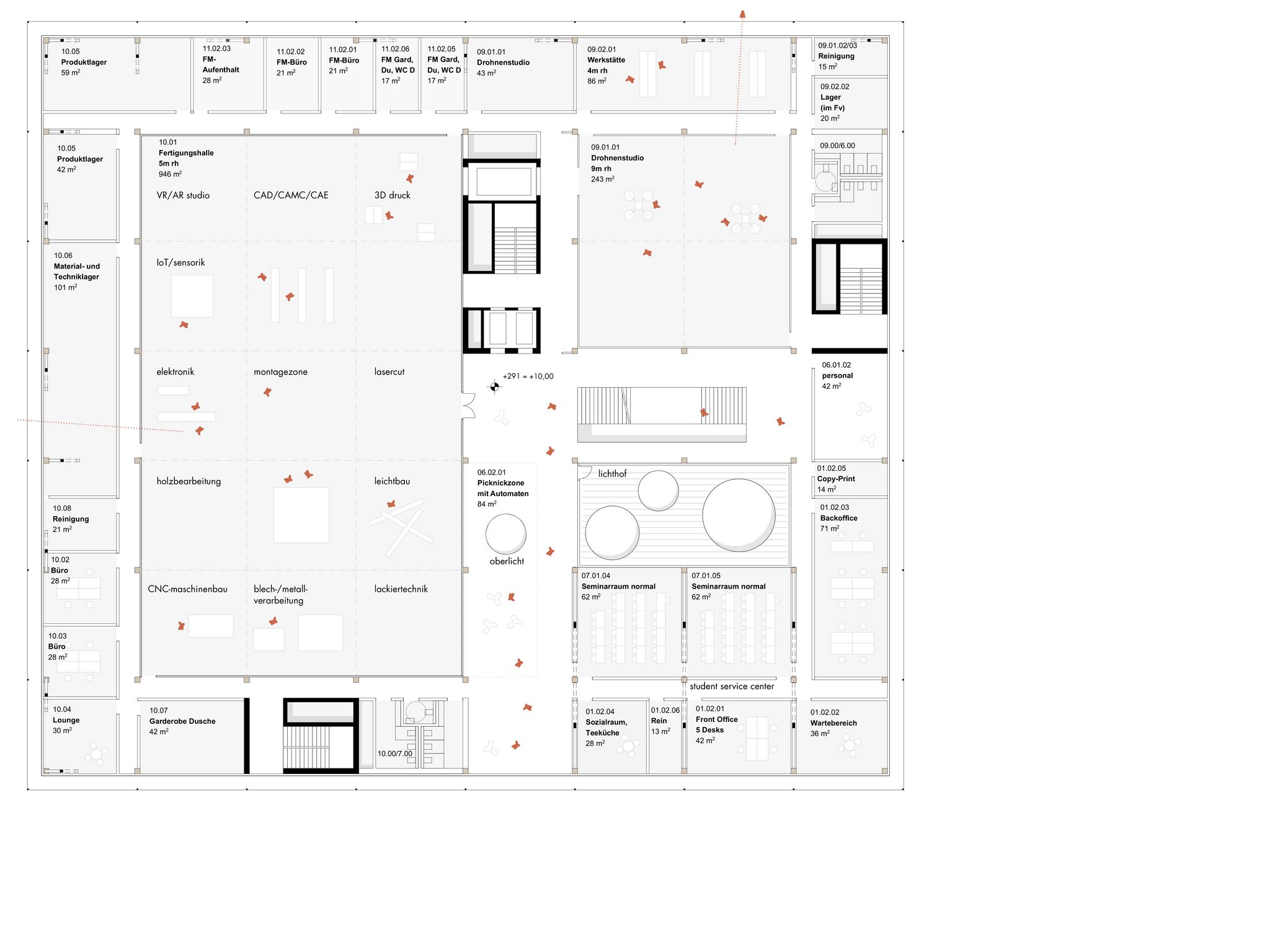 as the central anchor point of the campus, "the hub" is being created in the first phase - a place for internal and external exchange. the spacious forum serves as a versatile space with public functions such as a banquet hall, exhibition area and canteen. its flexible structure allows students to design the space individually and adapt to changing needs. the integrated data center is inserted into the slope and is naturally lit with recesses.
