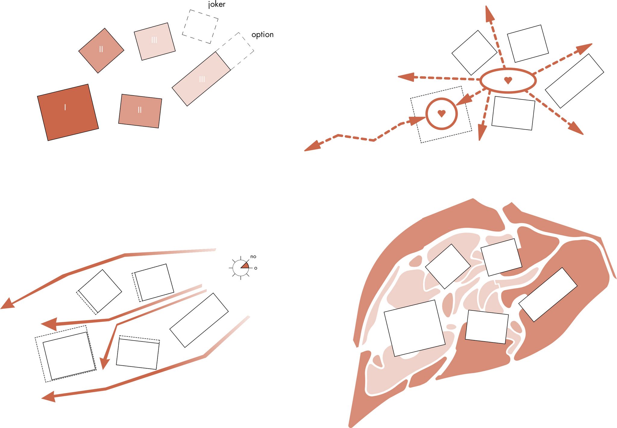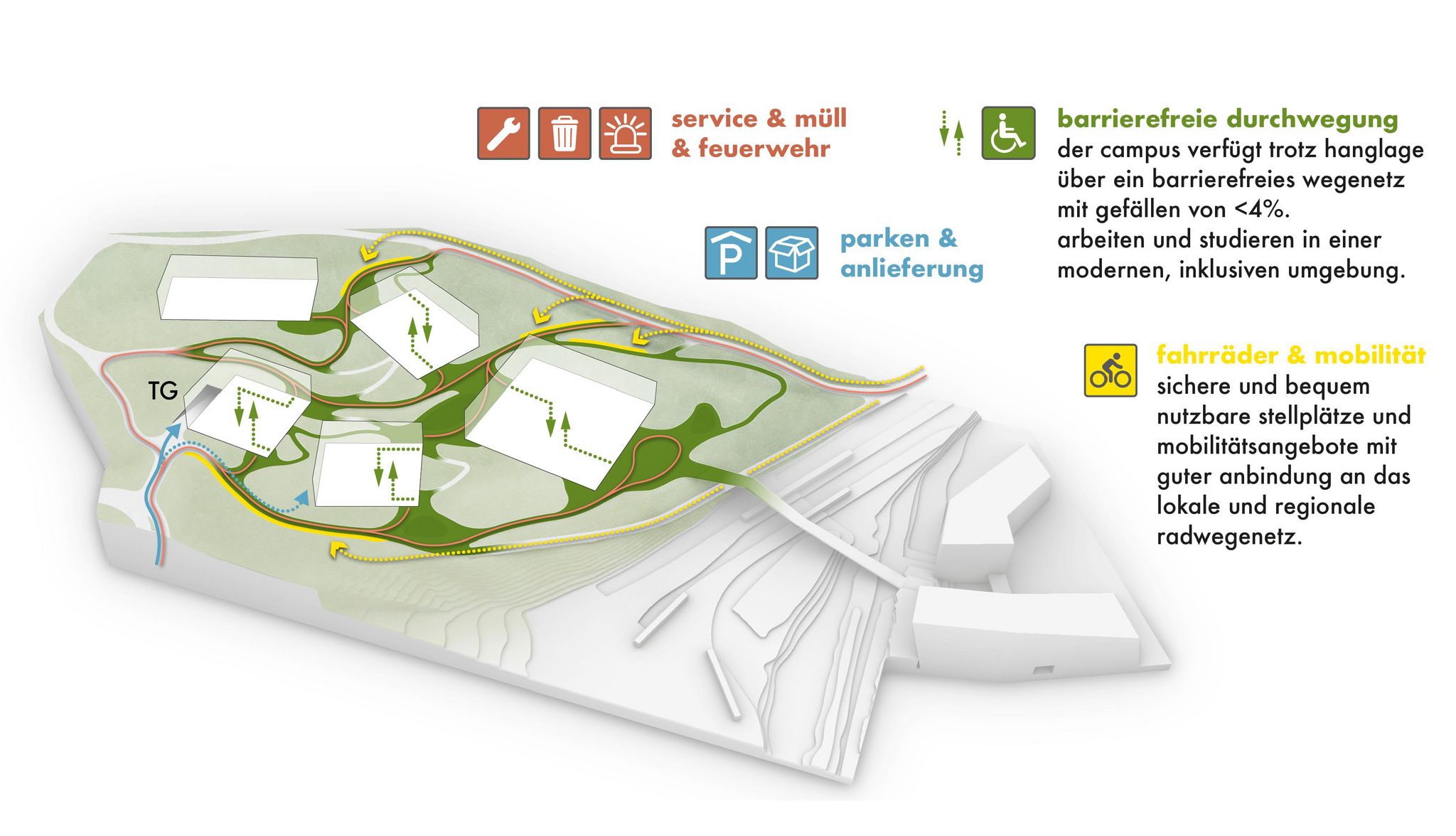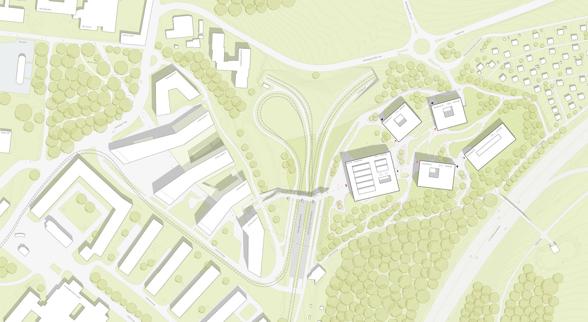 together with phases two and three of the project, an open village structure is created that allows flexibility and permeability. each building block can exist independently, both in terms of content and aesthetics, and yet is part of the overall structure. the accessibility and networking of the various buildings are strengthened by the open space and their orientation towards each other. the green center of the campus functions as a connecting space that invites people to linger.