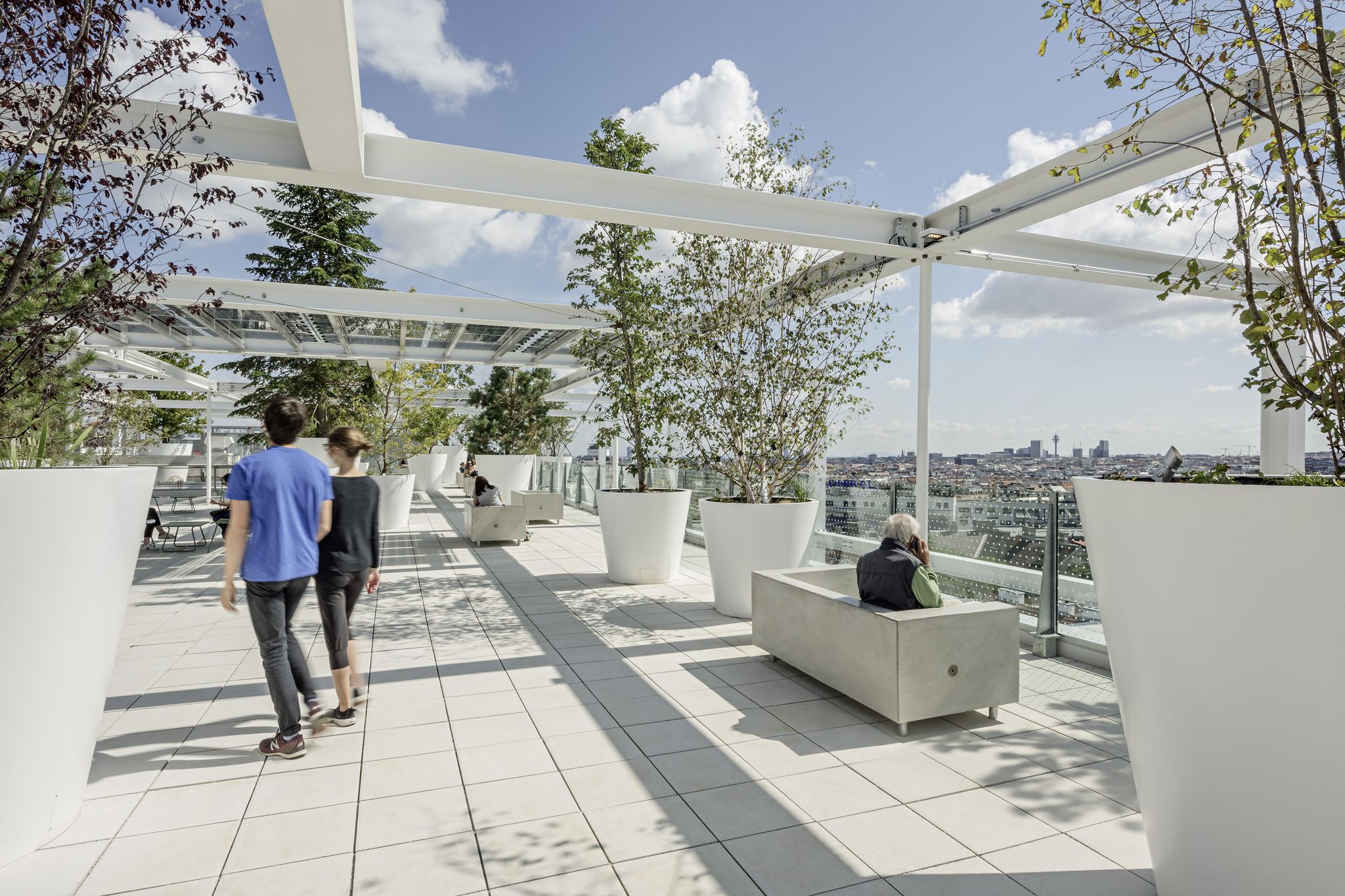 a 4.5 metres deep structure encloses the building like a shady shelf and at the same time provides space for terraces and greenery on every level. the arcades created on the ground floor extend the pedestrian area along mariahilferstrasse and bring life to the retail area in front. the building has no fixed core, which means that the areas can be flexibly designed and utilised. the generous open space (void) in the interior enables visual connections between the storeys.