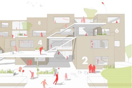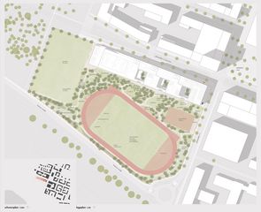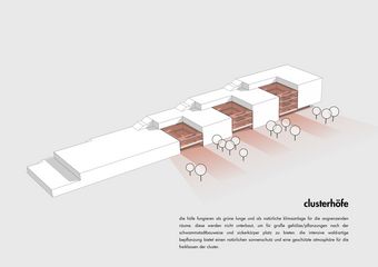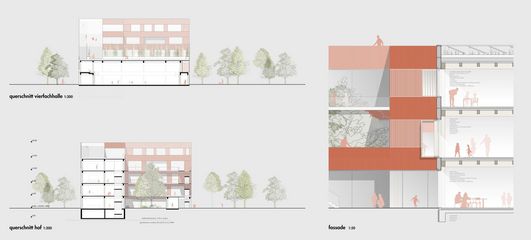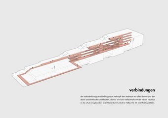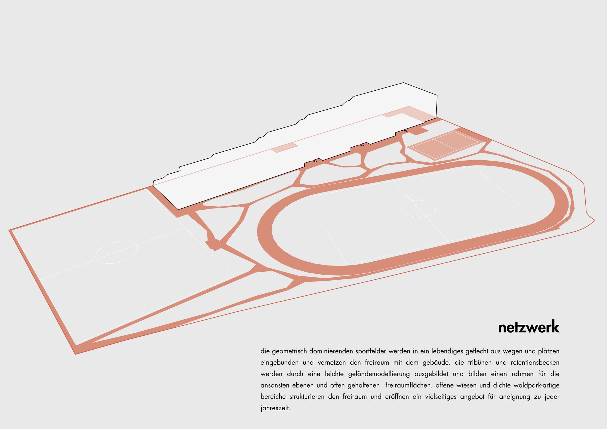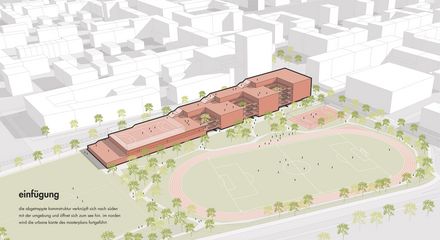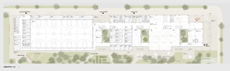movement and sports are present throughout the campus. the geometrically dominant sports fields outdoors are integrated into a lively network of paths and squares. the quadruple hall is spatially intertwined with the school building, but can be easily separated for external use outside school hours. the spacious open staircases connect all levels from the ground floor to the top roof floor and provide an additional level of movement in the fresh air directly at the building. staircases integrated into the courtyards allow short distances from the clusters to both the garden and the roofs. motto: open space on all levels!