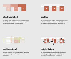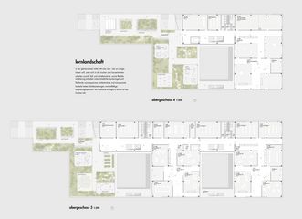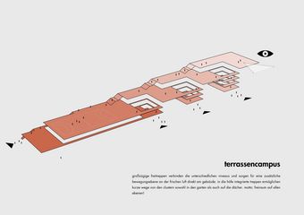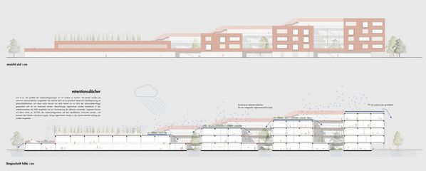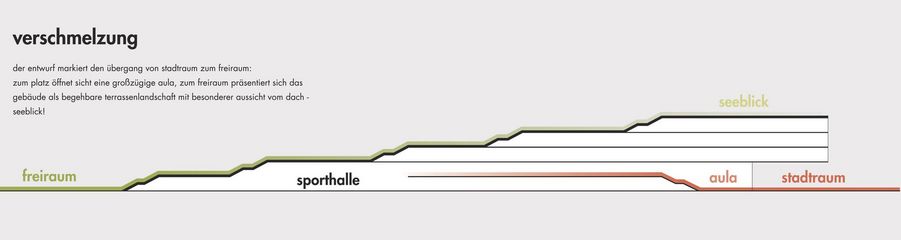 the building forms an accessible terraced landscape facing the open space and links up with the surroundings to the south. a special panorama is offered from the roof: the view to the lake! the roof areas are understood as an extension of the indoor space and are developed in connection with the pedagogical thematic areas of the respective levels. the overall aim is to use the terraces for a variety of activities, such as movement, a laboratory for science experiments, and a fresh air art studio. the green classroom is shaded by a pv canopy and can be used even when it rains.