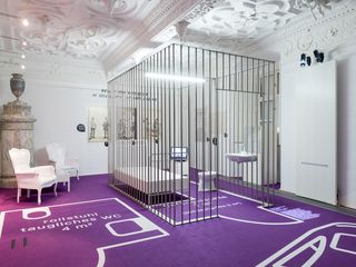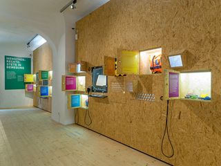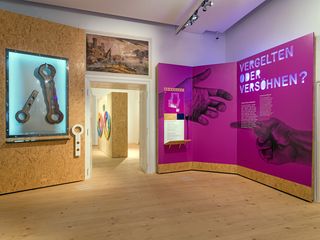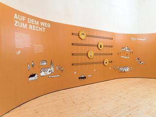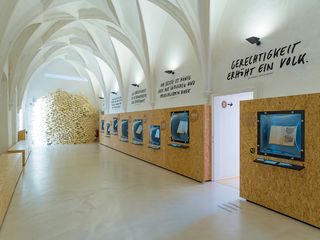 dealing with the substance, that is, the premises of the pöggstall castle, also plays a major role for us. the exhibition wants to be perceived as a temporary installation that does not compete with the rooms of the castle and can be dismantled after the end of the exhibition without leaving a trace. showcases and exhibition walls stand loosely in space as paravents, texts are projected - the rooms of the castle can still be experienced.