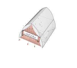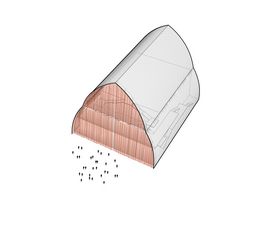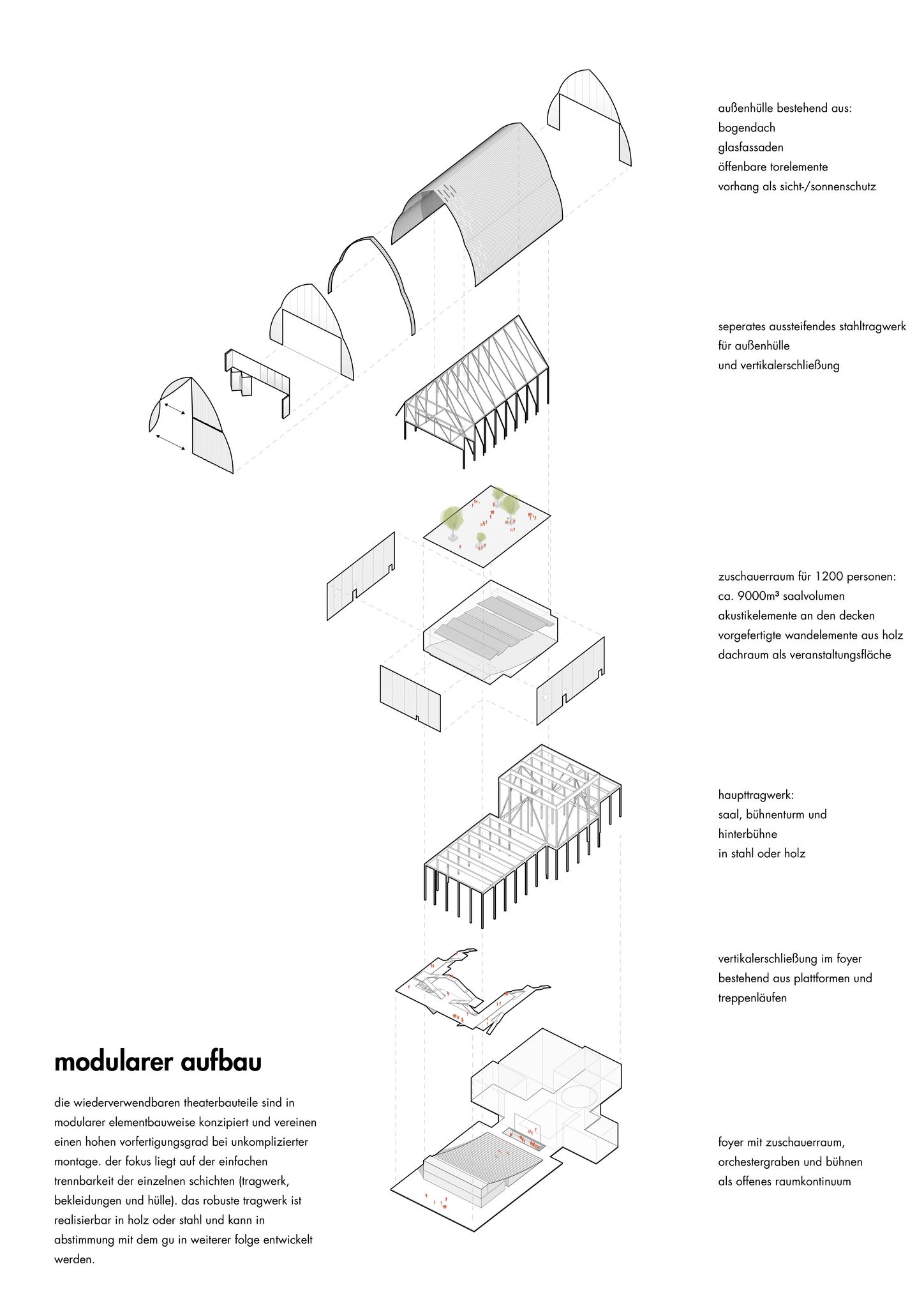 the demountable theatre is designed in a modular element construction and combines a high degree of prefabrication with straightforward assembly. the focus lies on the simple separability of the individual layers (supporting structure, cladding and envelope). the special roof shape derives from the prefabricated arch elements of the parashell system by the company Peneder. the self-supporting, self-stiffening elements are characterised by lightness, costefficiency and reusability.