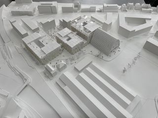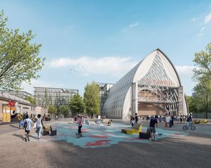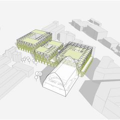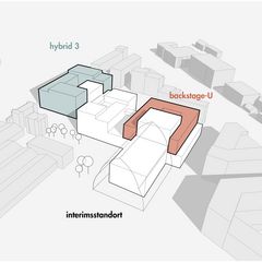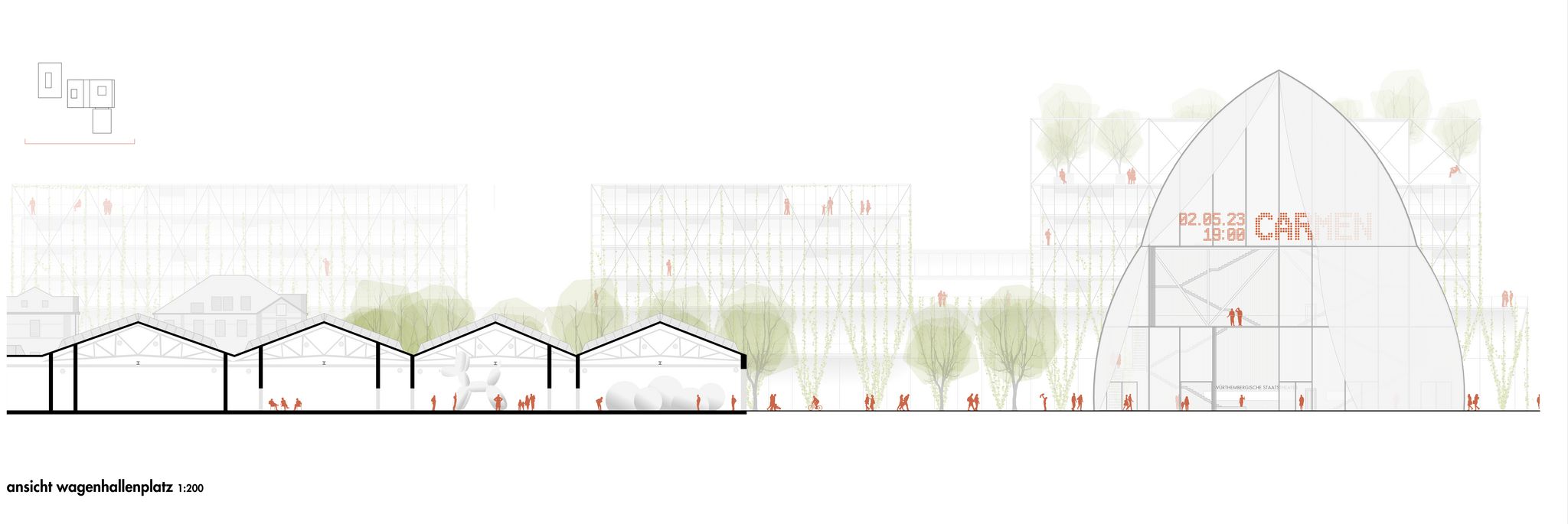 the new temporary venue of the württemberg state theatre underlines the desire for a cultural landmark and a striking presence with its simple yet iconic form. the construction and aesthetics of the cultural building emphasise the temporary, workshop-like character and offer an attractive link to the public space. the characteristic roof shape of the auditorium contrasts with the calm, green hybrid building blocks in the background.
