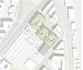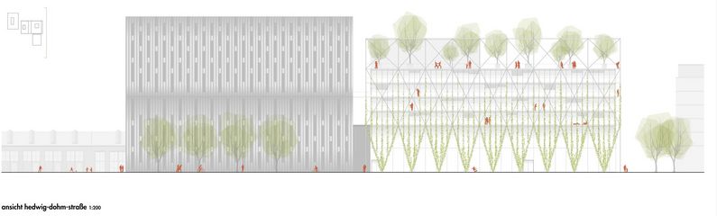 the clear building blocks of the maker-city create an independent ensemble, accompanied by a lively green envelope. the open building structure offers a flexible concept for art and cultural production on the heightened ground floor with potential for mezzanine levels and balconies through a hybrid wooden skeleton construction. the upper levels are suitable for workshops, co-working spaces and studios and allow for a creative and productive atmosphere in the building, where people from different industries work together and inspire each other.