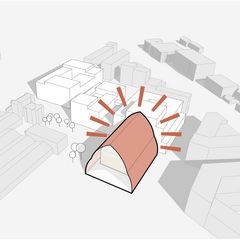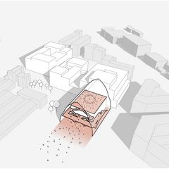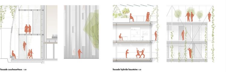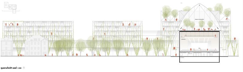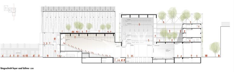 the provisional theatre opens up to the public space with its cultural balcony, revives the square and offers sufficient space for different activities in the vertically developing foyer, which leads to the auditorium and the eye-catching roof space. with the openable doors a multifunctional platform is created, that can be used flexibly for smaller events and as an attractive break area between performances.