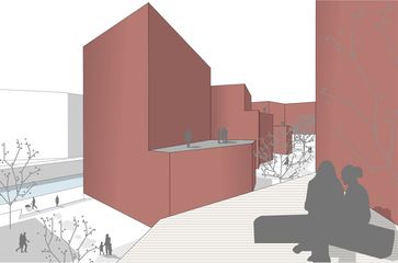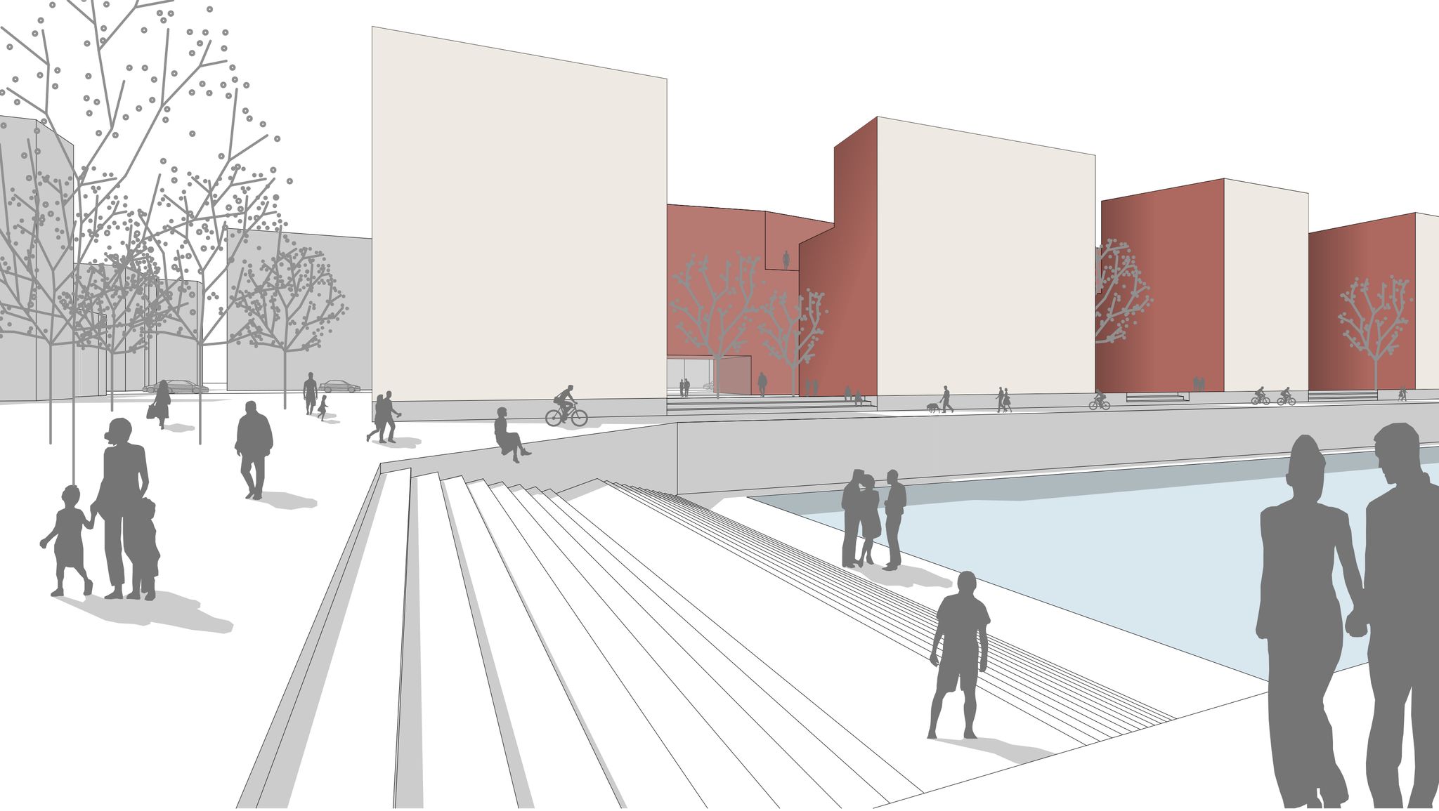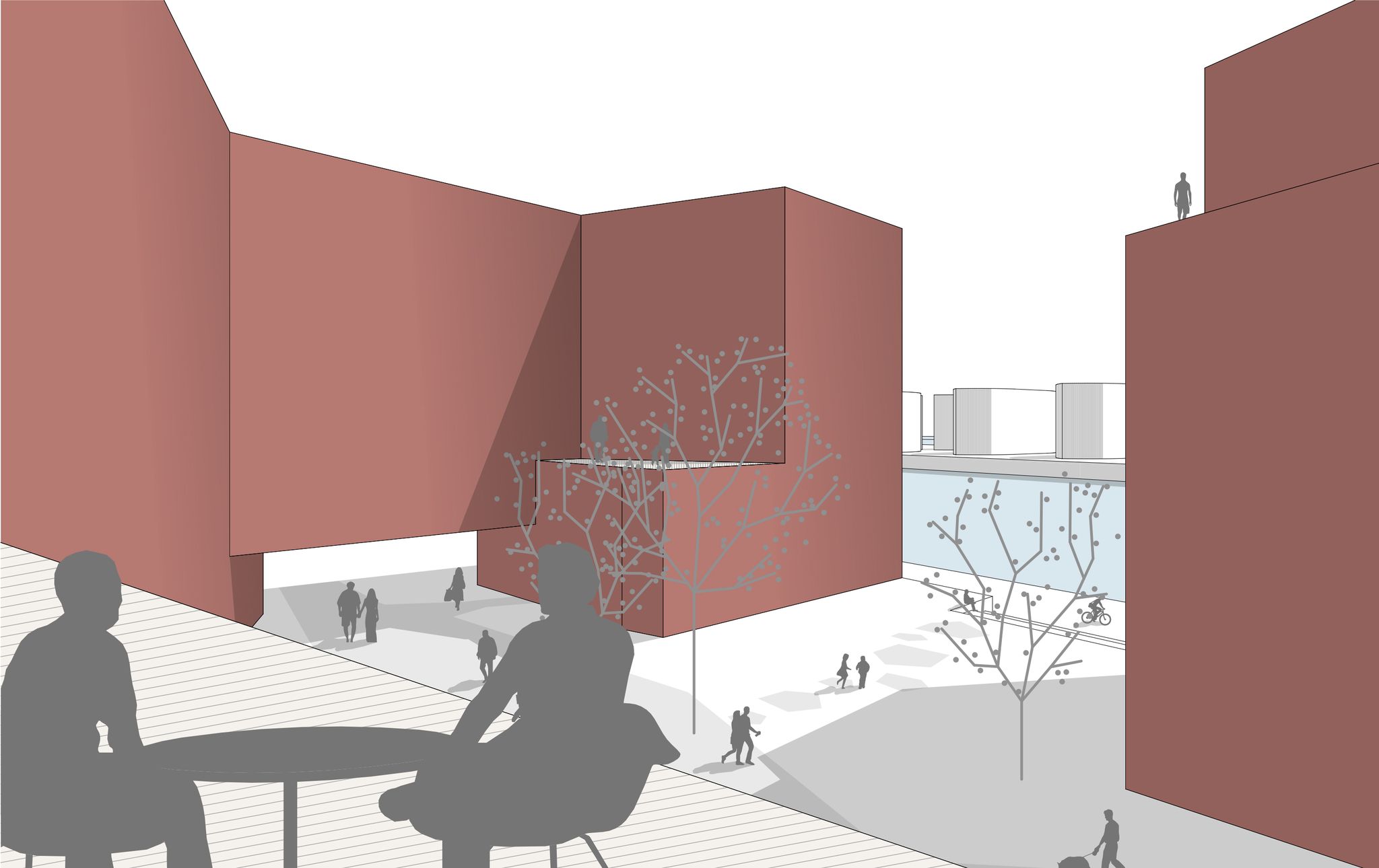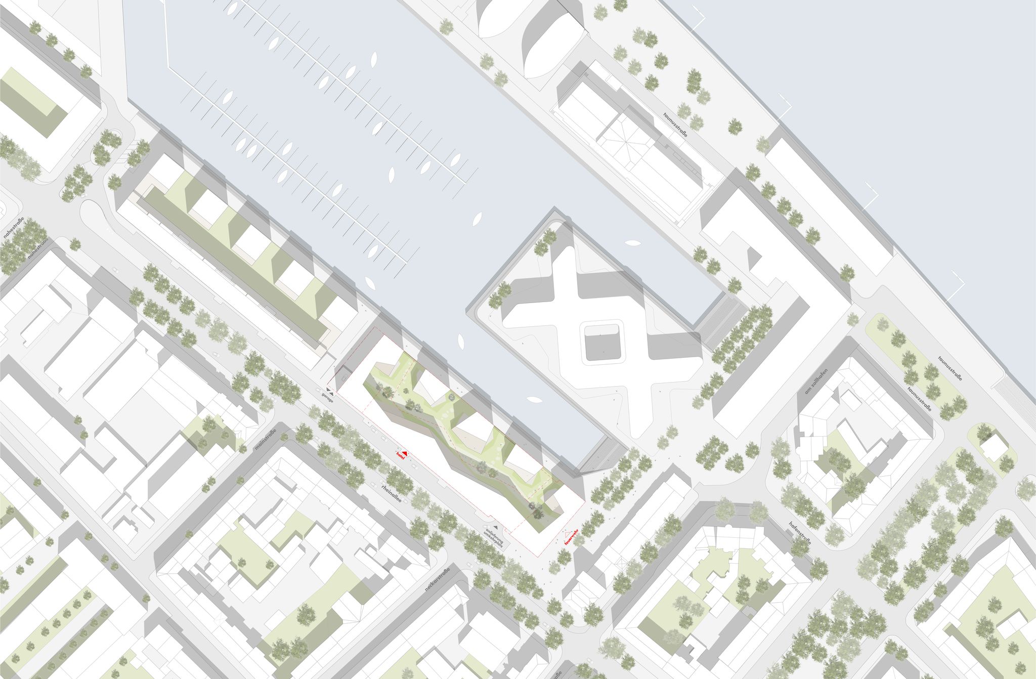 the calm external effect with lively inner life is the main feature of querkraft's competition entry. the identity-giving center has a high quality of stay thanks to a dynamic inner courtyard with stairs and height effects. it opens generously to the water and connects the pedestrian zone with the harbor promenade through the modeled free space.