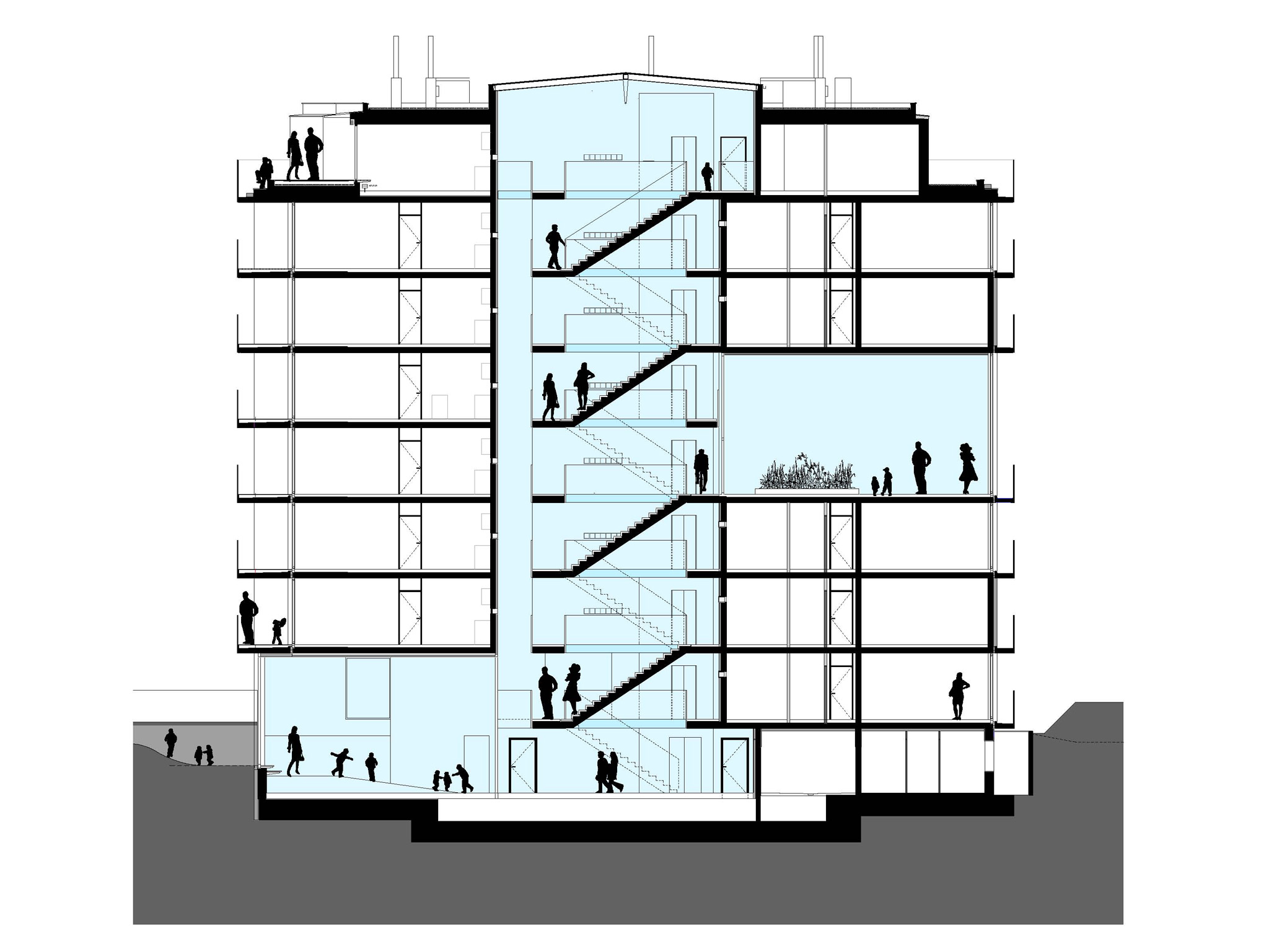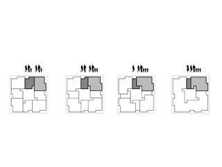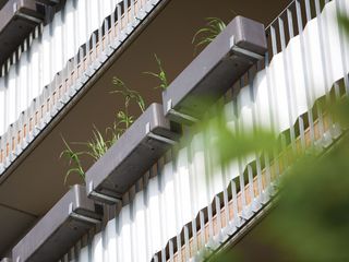 fassaden: sämtliche verglasungen erstrecken sich vom fussboden bis zur decke – ohne störenden sturzbereich. wohnräume sind grosszügig über ihre gesamte breite verglast. vor diesen räumen erweitern sich die umlaufenden balkonbänder zu loggienzonen. statt architektonischer fassadengestaltungselemente erhalten die mieter aus dem baubudget drei elemente zur gestaltung ihrer freiräume: blumentröge, sichtschutzplanen und wäschetrockengestelle. diese alltagselemente bilden einen ersten layer der benutzung, der in weiterer folge von den bewohnern ergänzt wird. das design des hauses ist somit einer gewünschten veränderung unterzogen.