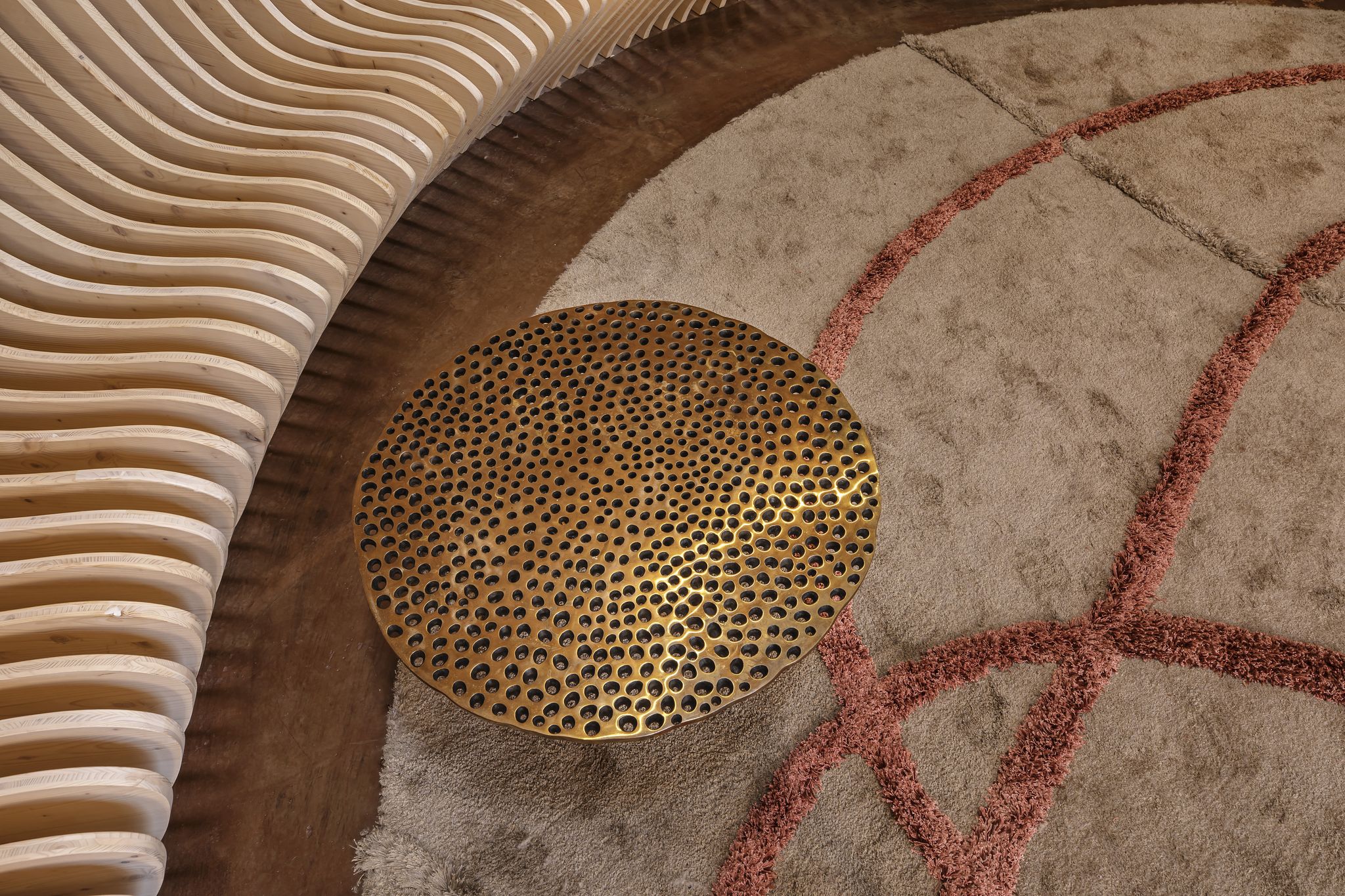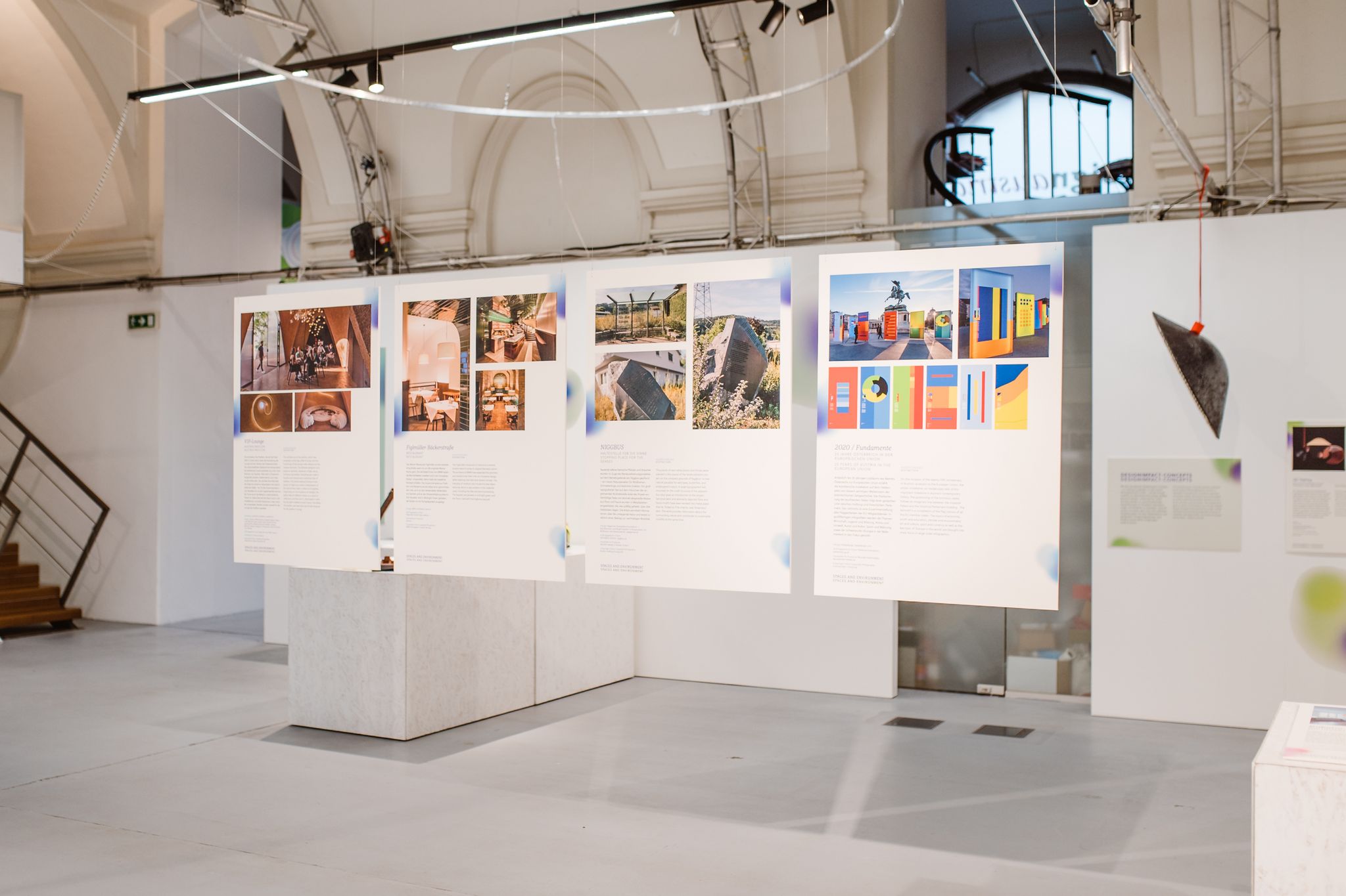 das zentrale sitzmöbel aus CNC-gefrästen schichtholzplatten wurde von querkraft gemeinsam mit schüler*innen der HTL mödling gestaltet. beleuchtet wird der raum von der lichtinstallation 'EXPO 2020' der künstlerin brigitte kowanz, der interaktiven lichtinstallation 'LeveL' des designstudios mischer'traxler und dem klassischen 'metropolitan' luster aus dem hause lobmeyr. der zentrale teppich wurde, wie auch die sitzpolster, vom textilen zentrum haslach gestaltet und in einem traditionellen verfahren aus mühlviertler leinen hergestellt. die loungetische 'punto' aus bronze wurden von der möbel- und schmuckdesignerin irene maria ganser gestaltet. komplettiert wird die ausstattung durch tische und sessel der firma ton sowie einer von querkraft gestalteten bartheke."
