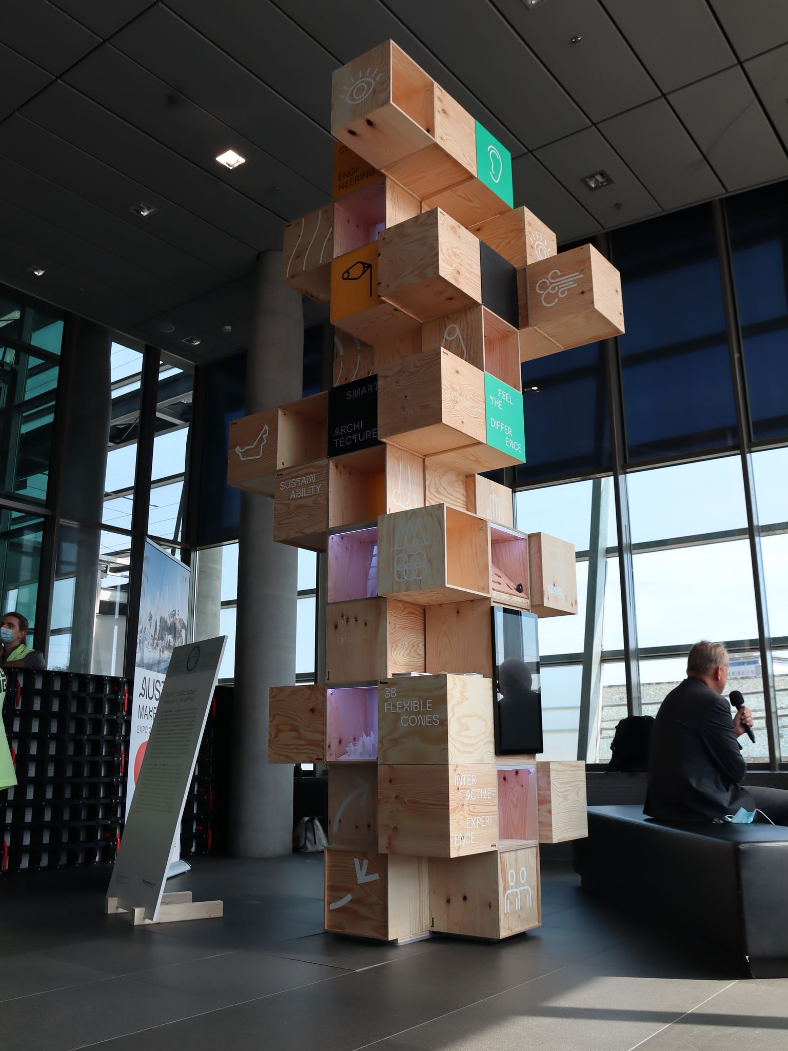 der erste turm ist nun im ars electronica center zu sehen und präsentiert den österreichischen expo beitrag. er wird bis zur eröffnung der expo und des österreichischen pavillons am 1. oktober 2021 noch an anderen standorten zu sehen sein.