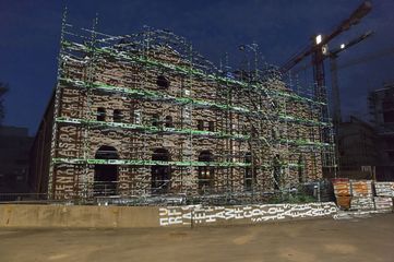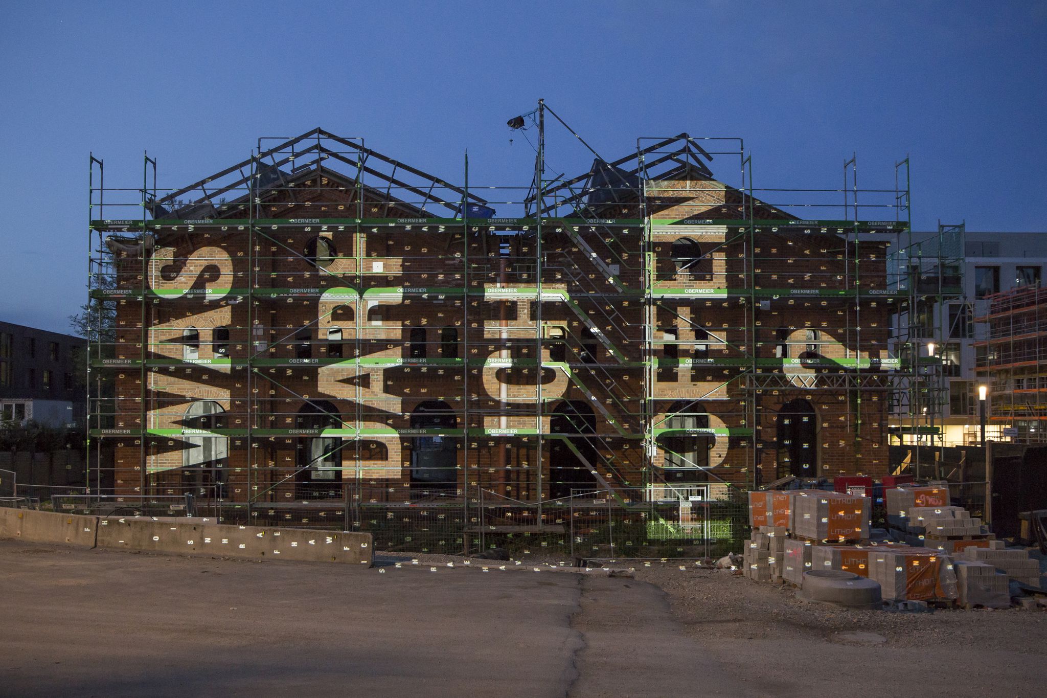 vierkant von hartung | trenz ist die erste in einer reihe von lichtinstallationen im rahmen der flux lichtwerke ingolstadt 2020, die auf der baustelle präsentiert werden.