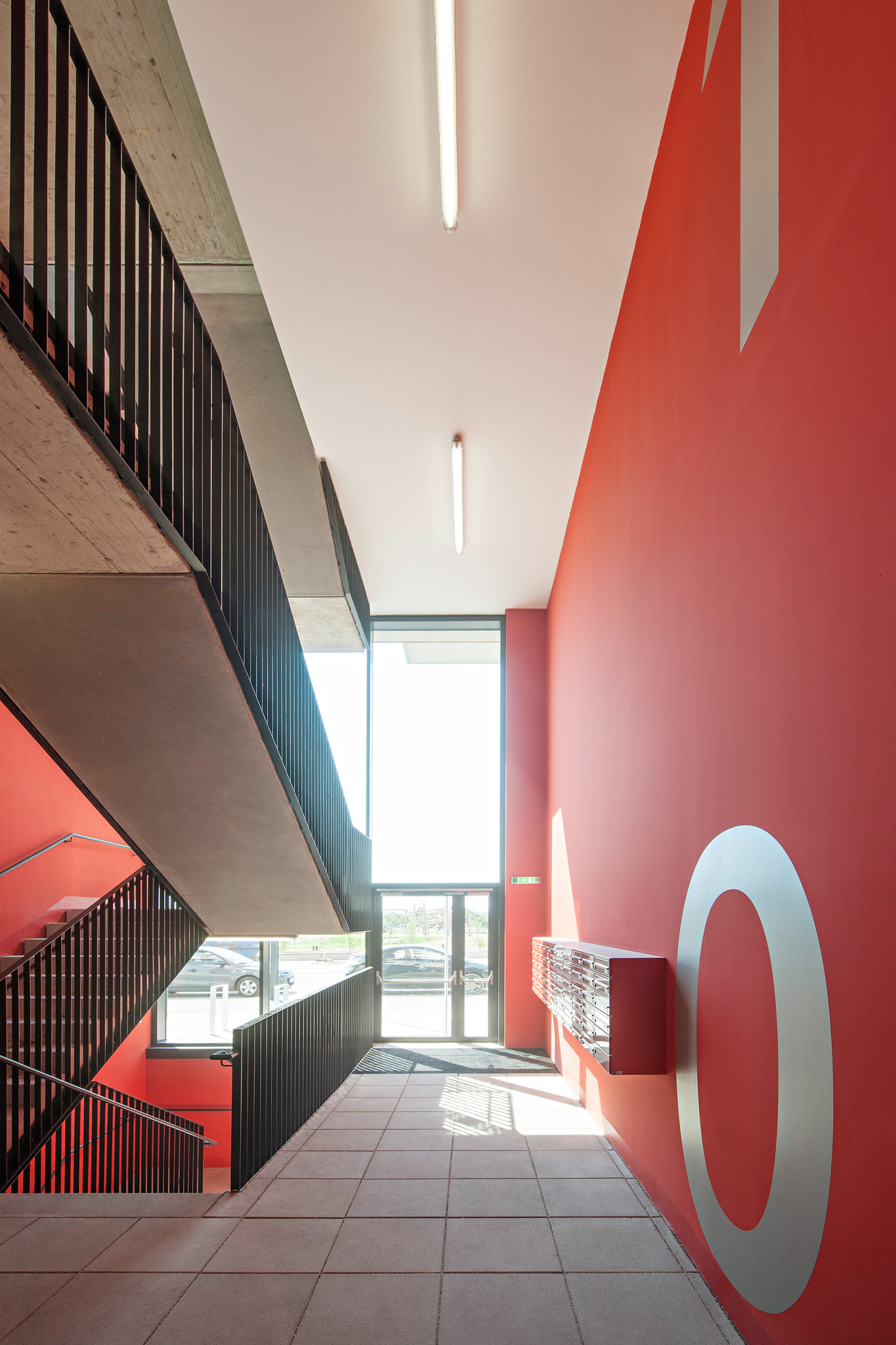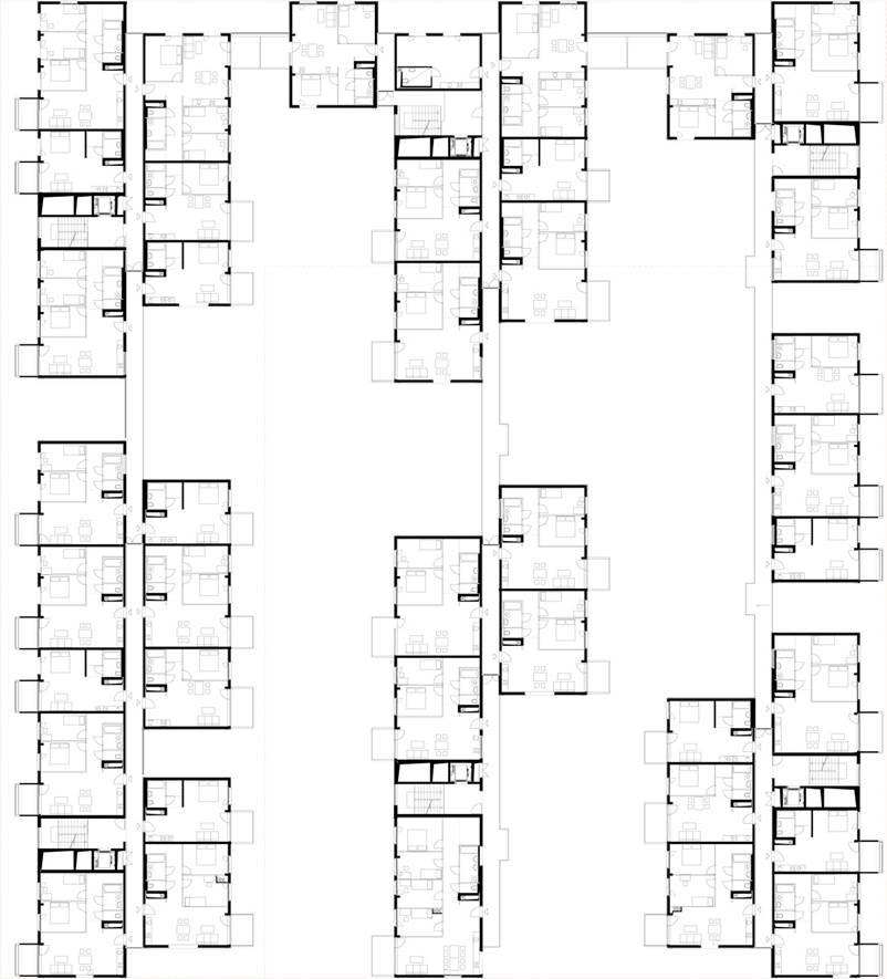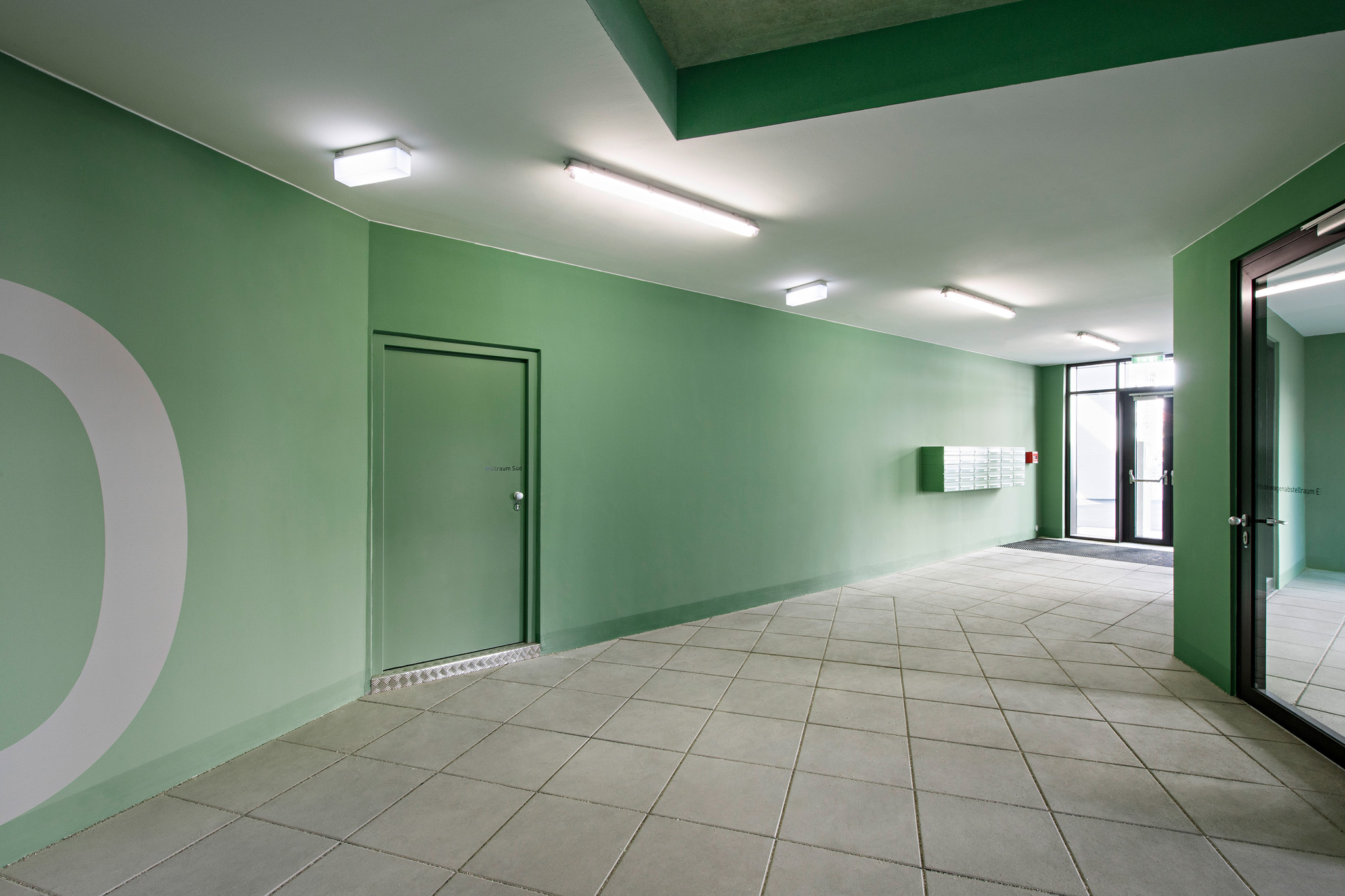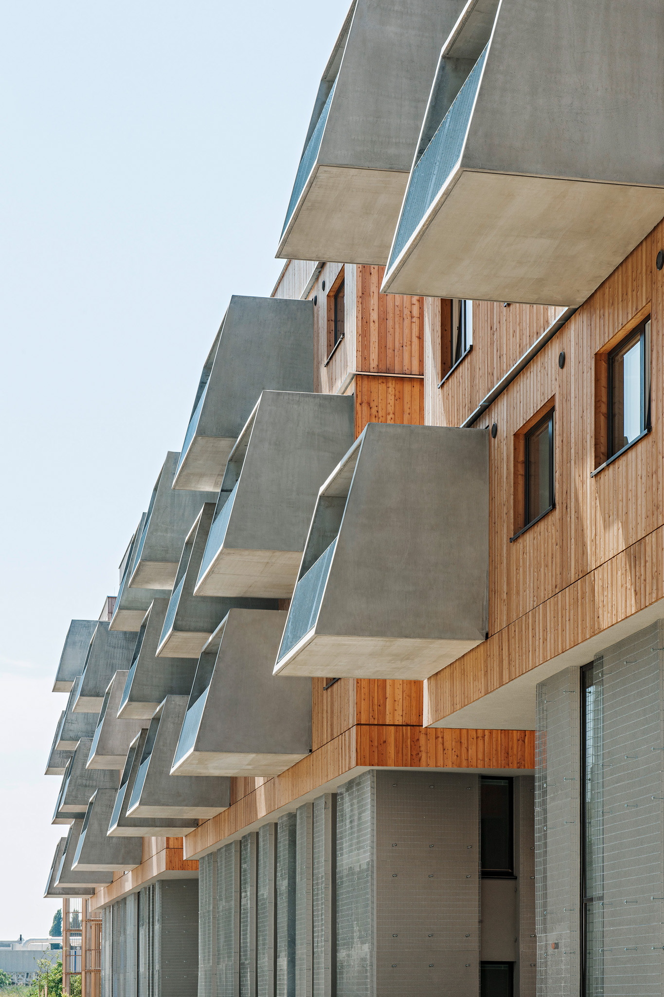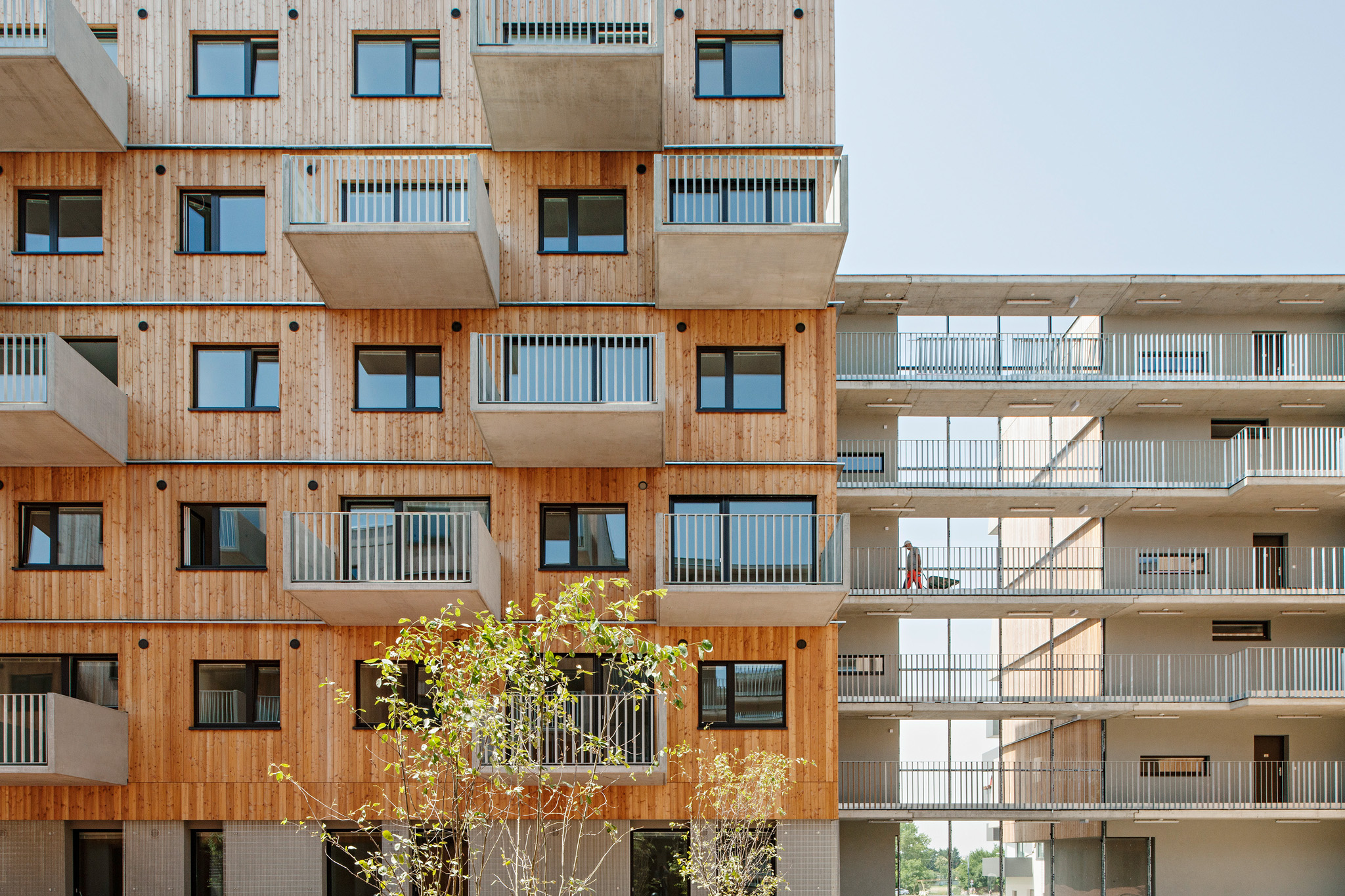 die serielle, lineare grundstruktur bietet große flexibilität in der anordnung verschiedenster wohnungstypen und ermöglicht so eine gute durchmischung der bewohnerstruktur sowie eine nachhaltige benutzbarkeit. als besonderheit im bereich des wohnungsbaus wurde zur steigerung der langfristigen nutzungsvariabilität das gesamte objekt als stahlbetonskelettbau mit minimierter tragstruktur ausgeführt: einzelstützen statt betonwände. die ökologischen außenwände sind als vorgefertigte, gedämmte holzriegelbauteile mit unbehandelter lärchenholzschalung ausgebildet. das fassadenbild wird durch auskragende fertigteil-loggien und -balkone strukturiert und wurde als komplettbauteil aus der fabrik vor ort montiert. es entsteht ein freies spiel.