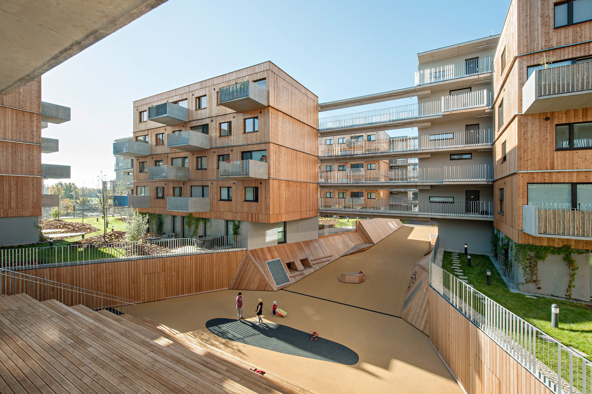 „die wohnhausanlage d12 ist mit ihrer abwechslungsreichen erschließungssituation und der ökologischen materialwahl in der fassade etwas besonderes in der seesstadt aspern. holz ist einer der intelligentesten baustoffe, die man sich vorstellen kann – nachwachsbar, verrottbar im recycling – zudem besitzt es haptische qualitäten. im gegensatz zu vollwärmeschutzfassaden ist holz ein material, das bewusst altert, ergraut, vergraut und auch im städtischen kontext identitätsstiftend ist.“