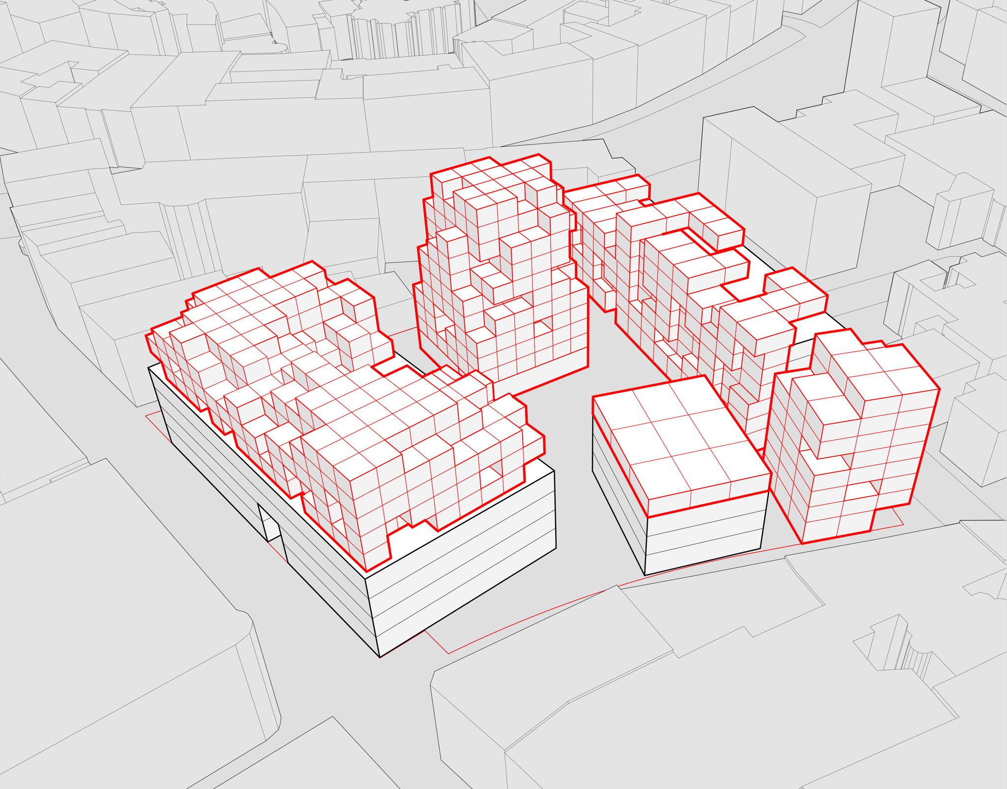der monofunktionale block wird in einen multifunktionalen lebendigen stadtbaustein transformiert. handel und gastronomie, unterschiedliches arbeiten, ein stadthotel, ein kulturbaustein, der kulturelle und soziale organisationen aufnehmen kann, ein hotel und sozial durchmischtes wohnen sind garant für eine nachhaltige entwicklung.