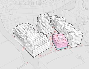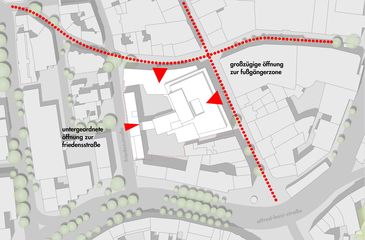 der projektstandort liegt in einer klimatisch hoch vulnerablen zone der stadt bielefeld. diese ist geprägt von höchster versiegelung, massiven speichermassen und nahezu keiner vegetation, die abkühlung schaffen könnte – dem quartier fehlen lebenswerte plätze. ziel des entwurfes ist es dem ort eine neue urbane qualität hinzuzufügen. durch das öffnen des hermetischen blocks wird der innenhof teil des öffentlichen raumes. eine vollkommen neue aufenthaltsqualität wird geschaffen, neue durchwegungen werden ermöglicht, ein neuer treffpunkt für alle entsteht.