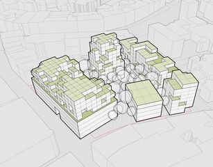 die dachflächen werden als kubisch gestaffelte hügellandschaft ausgebildet. die dadurch entstandenen terrassen bieten hochqualitativen freiraum für die bewohner*innen mit blick über bielefeld und ermöglichen eine intensive begrünung. in zusammenwirkung mit dem stadtwald wird die lufttemperatur bis zu 3°C° abgesenkt. die begrünte dachlandschaft emittiert über 1,5 mio. watt weniger wärme in die stadtatmosphäre als der bestand und trägt somit nicht zur aufheizung bei, sondern kühlt im vergleich deutlich ab. die gebäudeöffnungen des entwurfs sind so orientiert, dass die luftkörper zu den innenhöfen geführt werden und hier ein angenehmer luftaustausch erfolgen kann. dies ist die grundvoraussetzung für nächtliche abkühlung und klimaresilientes bauen. all diese wesentlichen leistungen erbringen die pflanzen des vorliegenden entwurfs zusätzlich zu ihrer ästhetischen wirkungen und der aufenthaltsqualität, die sie schaffen.