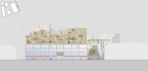vor dem hintergrund des stetig steigenden ressourcenverbrauchs der bauwirtschaft, wird nur ein teil des bestands unter einbeziehung lokaler sozialwirtschaftlicher betriebe abgebrochen beziehungsweise rückgebaut. die klaren strukturen werden erhalten und durch eine kleinteiligere struktur in holz-leichtbauweise ergänzt. das raster der neuen holzstruktur wird mit dem stützenraster des vorhandenen stahlbetonbaus gekoppelt.