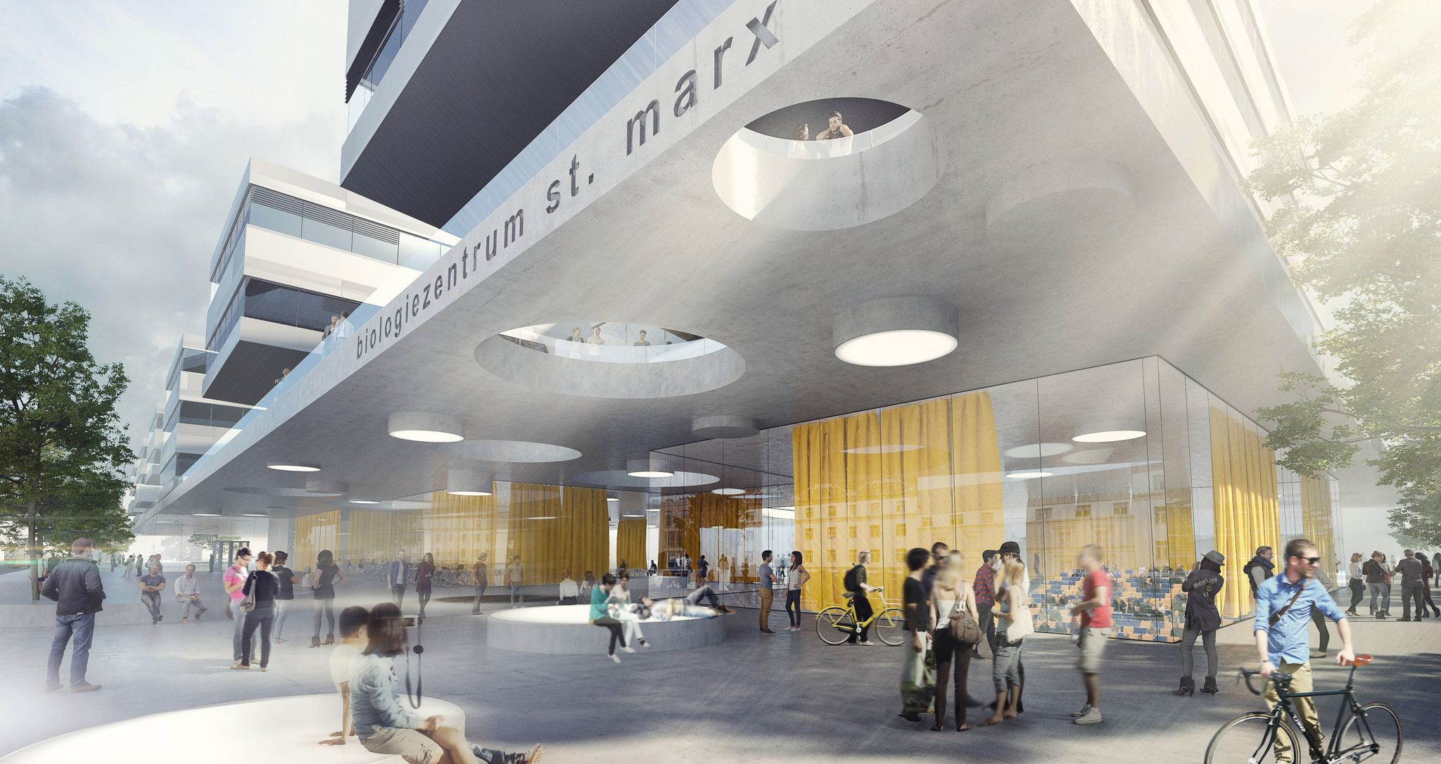 ein umlaufendes plateau im 1.og als bietet ein zusätzliches freiraumangebot und aufenthaltsfläche für die studierenden und forscher. Runde öffnungen ermöglichen belichtung und blickbeziehungen und verknüpfen die stadtebene mit der stadtterrasse zu einem urbanen aktivitätsfeld.