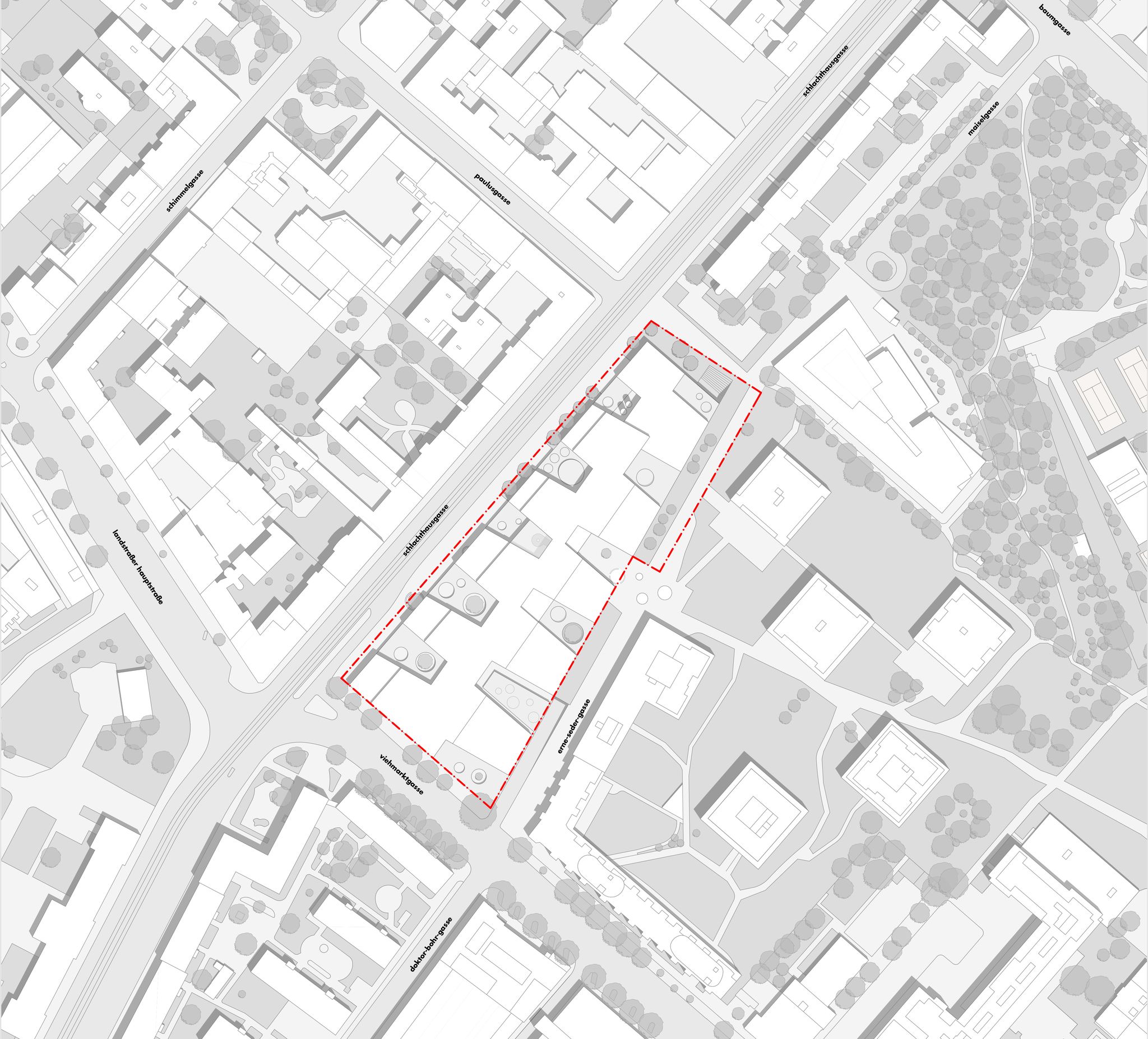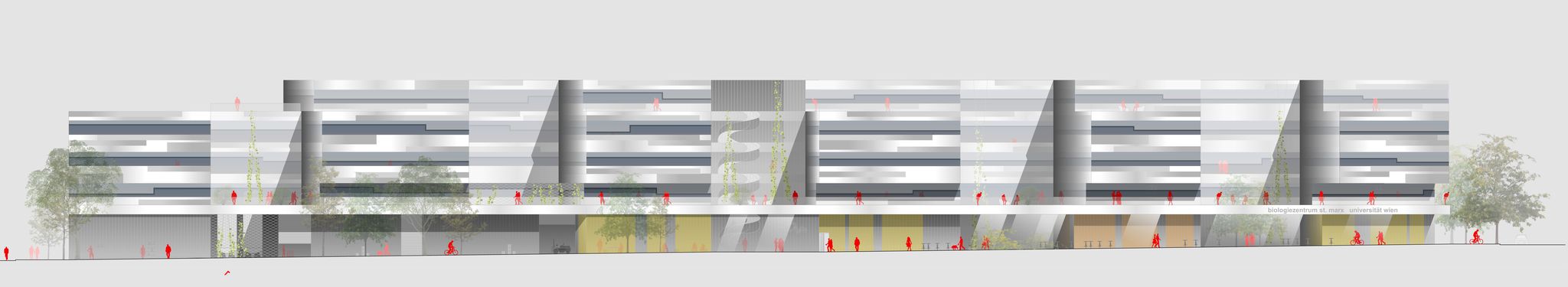 das erdgeschoss ist als stadträumliche verteilerebene mit grosszügigem teilweise gedecktem vorplatz entlang der schlachthausgasse ausgebildet. offenheit und durchlässigkeit prägen das neue biologiezentrum und das foyer als schnittstelle der unterschiedlichen bewegungslinien der stadt