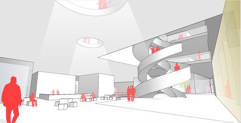 ein nord-süd gerichtete kommunikationslinie, ausgestattet mit verschiedenen aufenthaltsbereichen, unterschiedlichen raumsequenzen, service-und erschließungszonen, aus-und einblicken bildet ein abwechsungsreiches rückgrat für das gebäude, bietet orientierung im inneren und ausblick in den stadtraum.