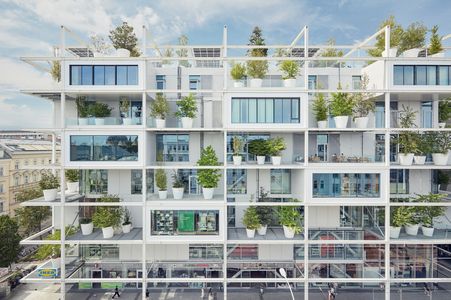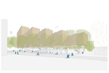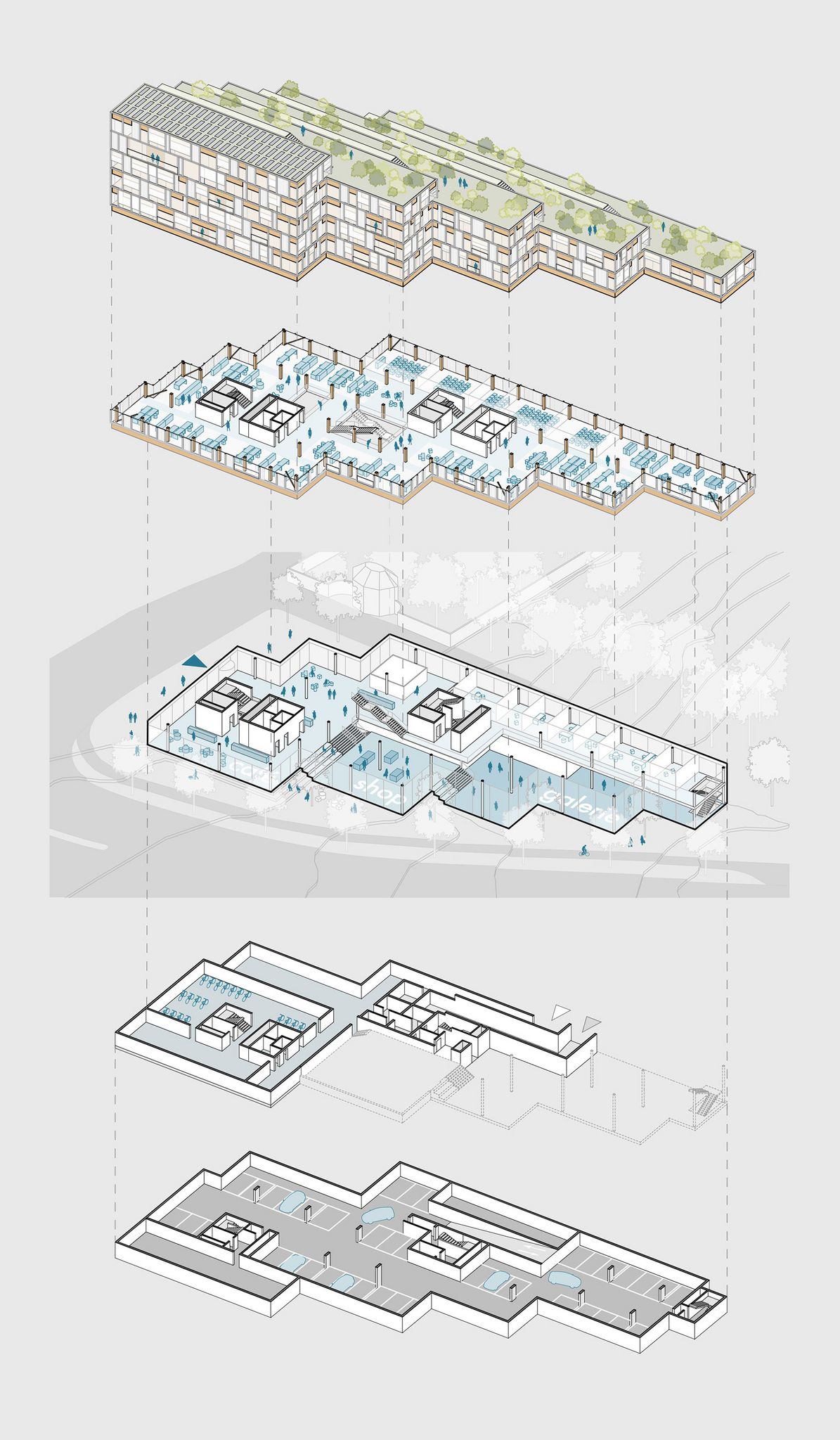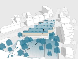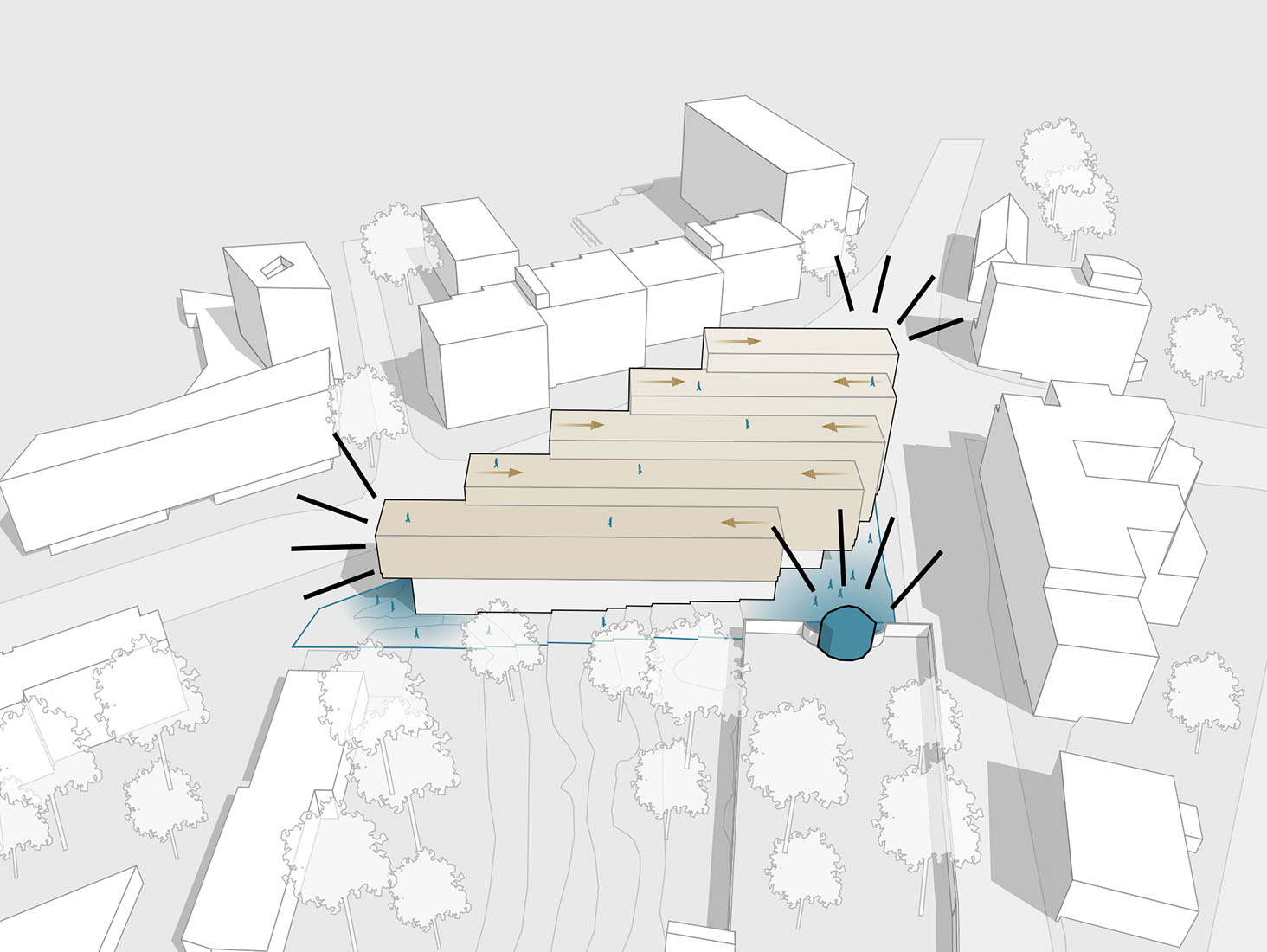 die begehbare dachlandschaft verlängert den südlich angrenzenden grünraum. begrünte, durch außentreppen verbundene terrassen werden als „mikro-biodiversitätswald" mit kleingehölzen, sträuchern und stauden gestaltet. die dachflächen dienen gleichzeitig als retentionsspeicher für niederschläge. dank der gebäudekontur entstehen richtung sterneckstraße weitere unversiegelte freiraumbuchten mit baumpflanzungen.