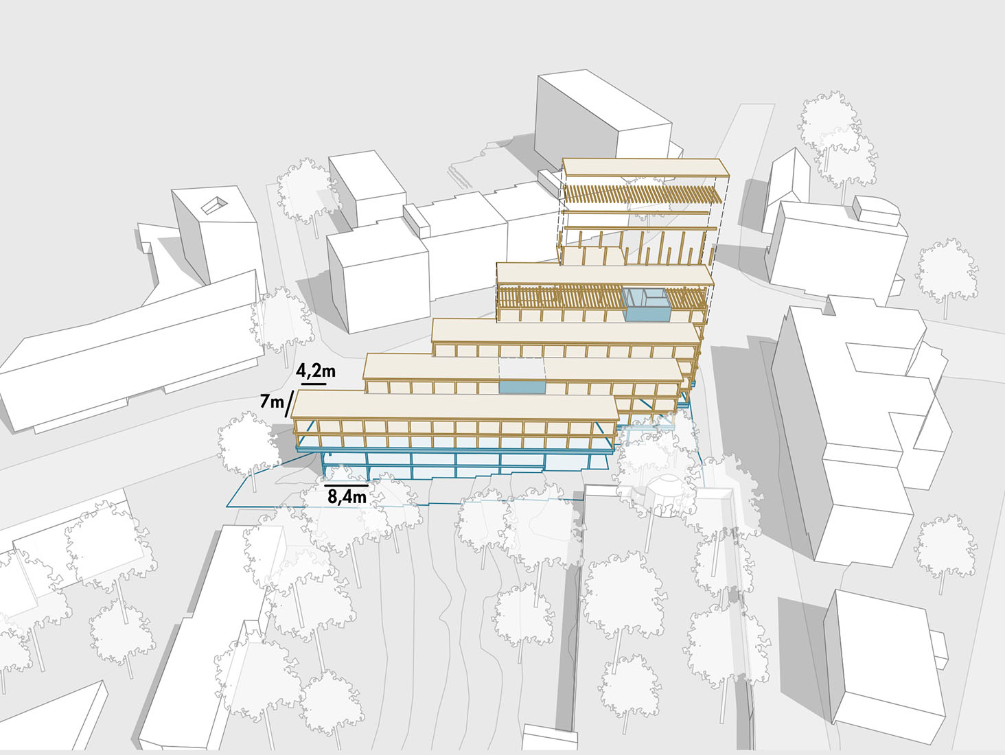 das konstruktive system mit stützweiten von 7m x 8,4m bzw. 4,2m nutzt die vorteile einer holzhybridbauweise optimal aus. im ug und eg ermöglicht die stahlbetonkonstruktion im 8,4m-raster einen freien, offenen grundriss und hebt den oberirdischen baukörper optisch über die offene erdgeschoßzone. in den obergeschoßen kommt eine reine holzbauweise zum einsatz, mit holzstützen und holzrippendecken im 4,2m-raster.