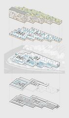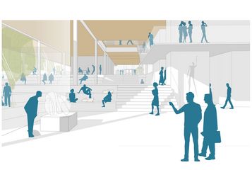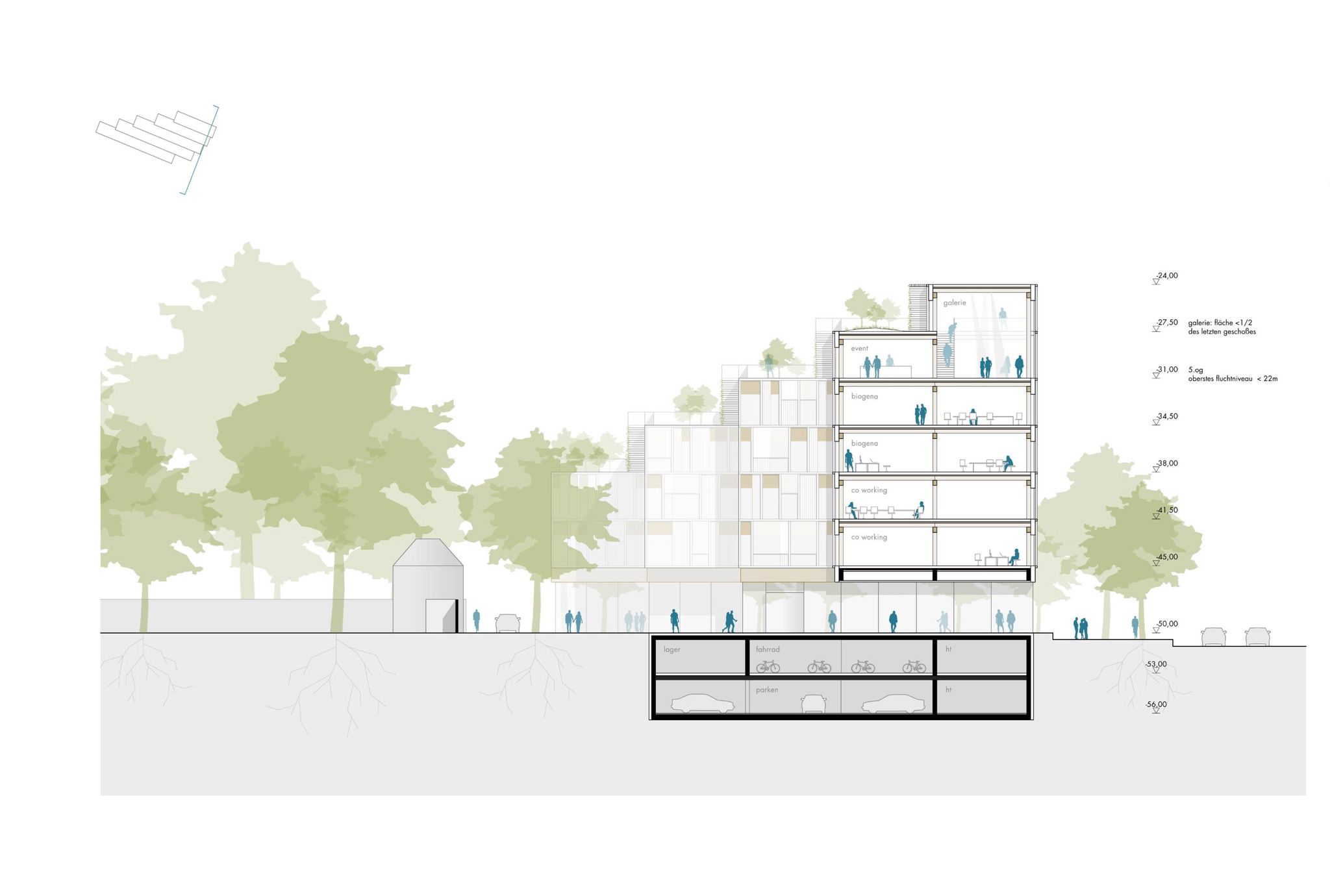 der transparente sockel öffnet sich zum stadtraum und lädt besuchende in die neue biogena-welt ein. dem abfallenden gelände folgend, entstehen attraktive raumsequenzen mit integrierten sitzstufen und variierenden raumhöhen zwischen 3,8m und 6,8m. die räumlichkeiten gehen fließend von empfang über café und shop bis zur kunstgalerie. der diagnostikbereich auf der galerie bietet zusätzliche privatsphäre.