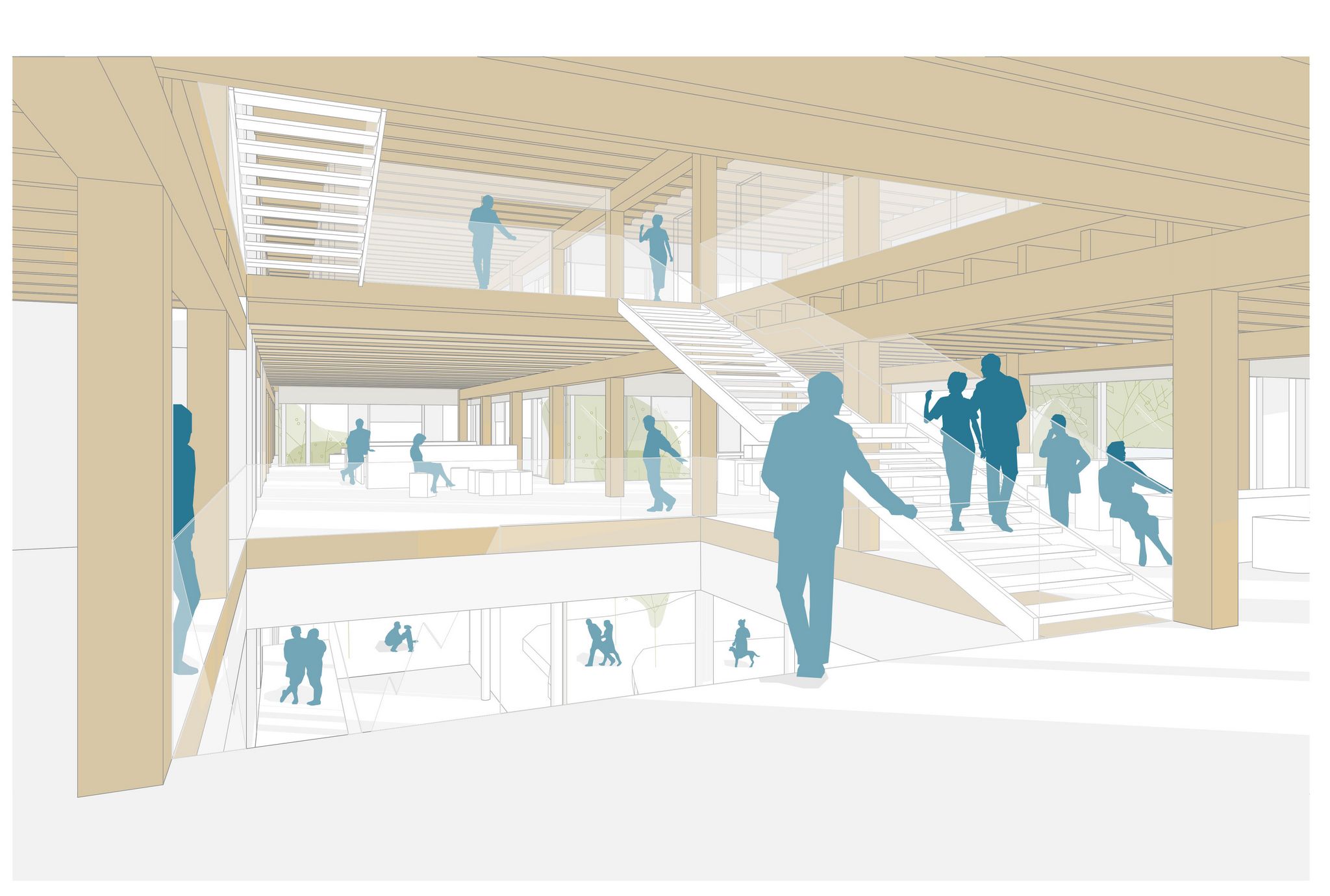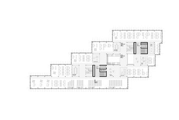 die flexible und offene bürowelt im holzbau bietet kommunikative zonen und flache hierarchien. zwei unabhängige kerne erlauben verschiedene teilungsszenarien, während lufträume und zentrale treppenanlagen die geschoße funktional und optisch miteinander verbinden. aktivitätszonen in den innenecken beleben die mittelzone und schaffen gemeinschaftsbereiche.